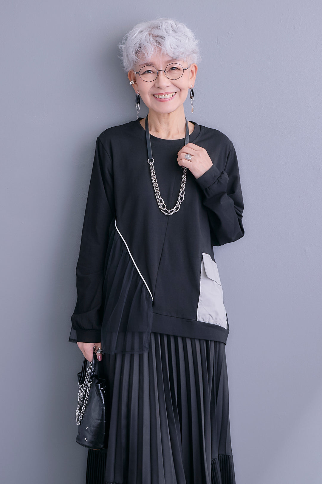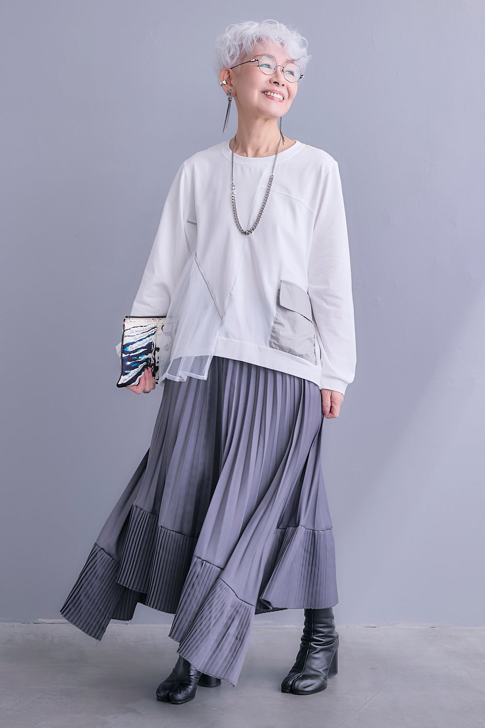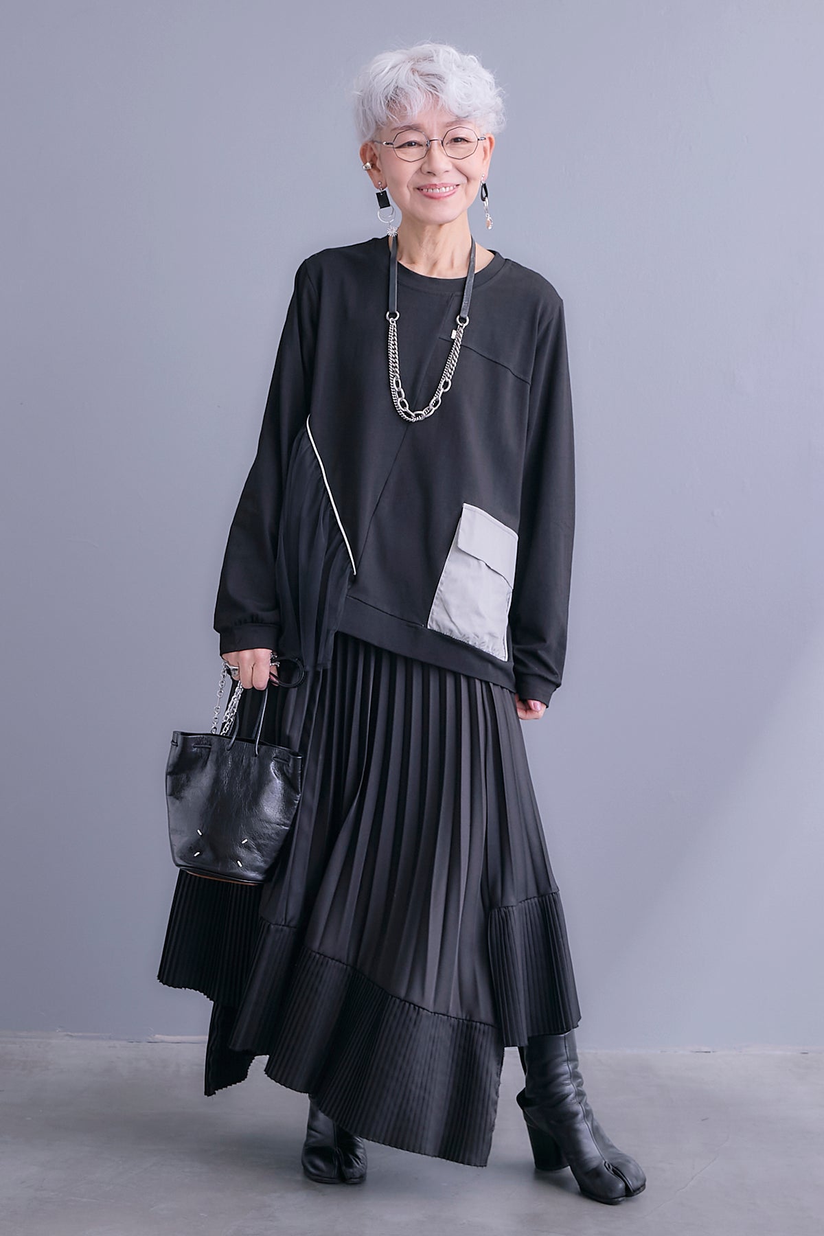 【SET】チュールギャザーアシメポケットプルオーバー+アシンメトリープリーツスカート(2set)
