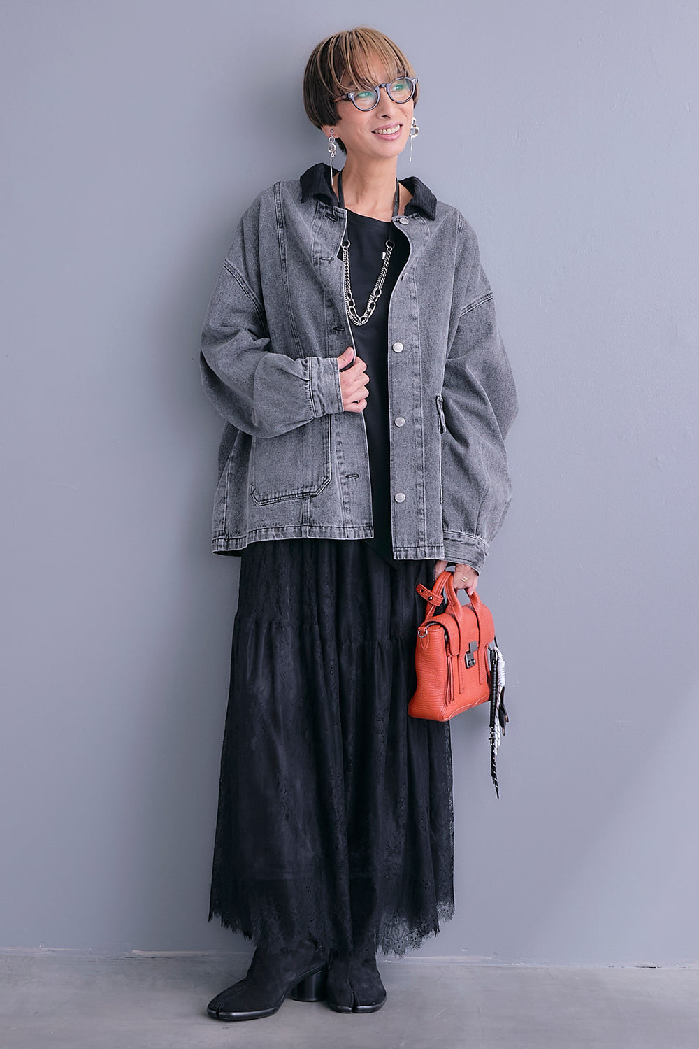 【SET】コーデュロイカラー10ozデニムジャケット+アシンメトリーロンT+アイラッシュレースロングスカート(3set)