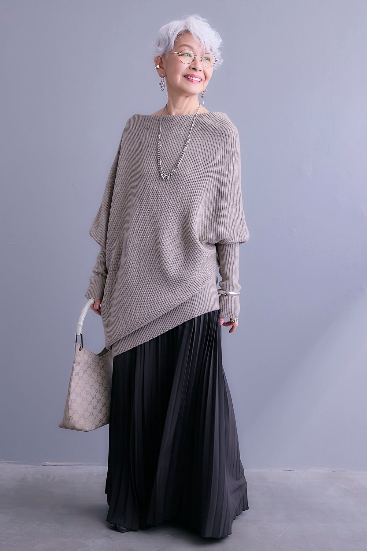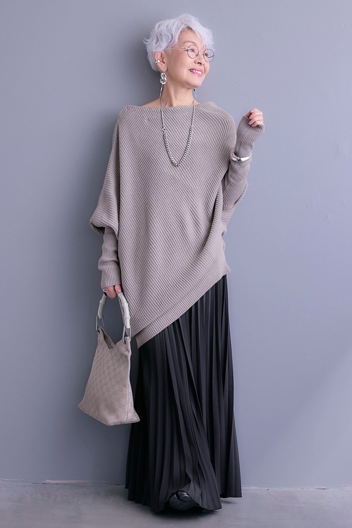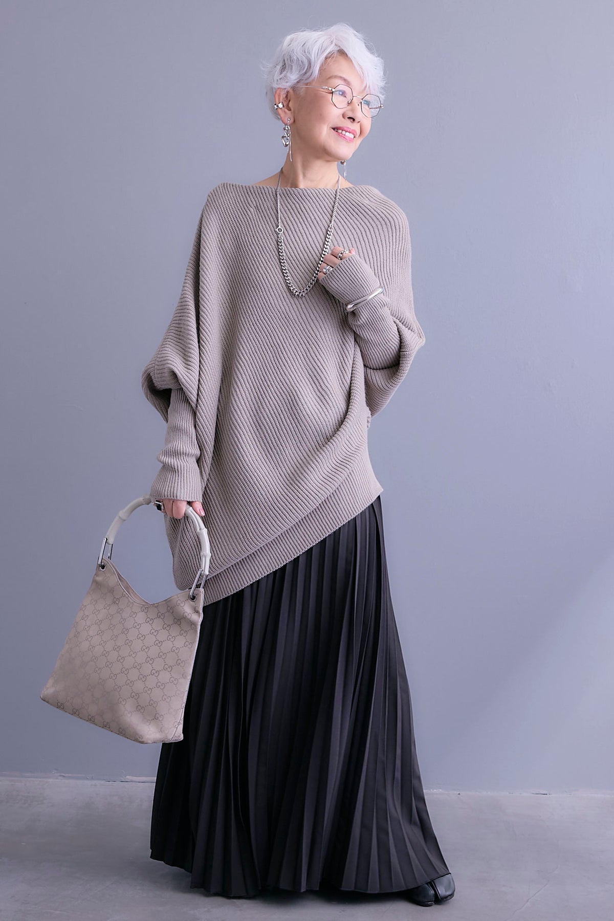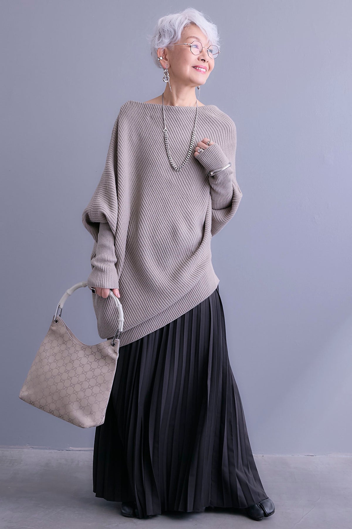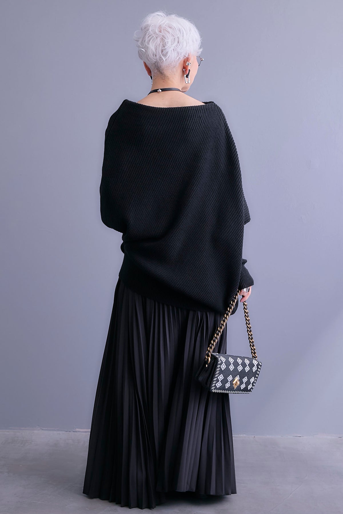 【SET】アシンメトリーボートネックドルマンニット+ルーズロングプリーツスカート(2set)