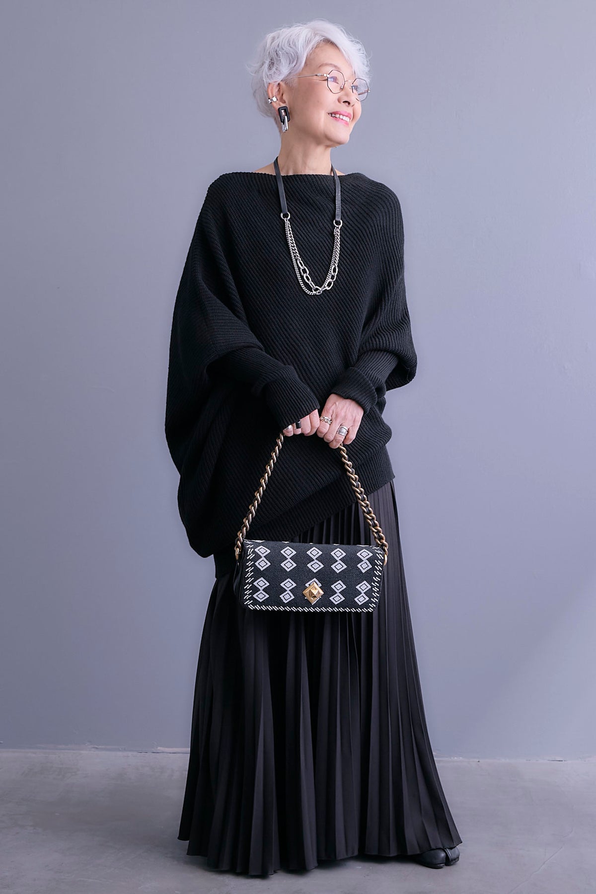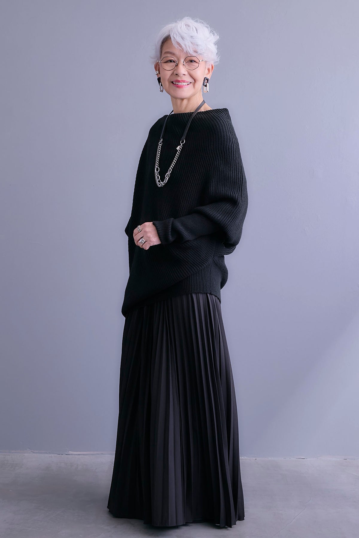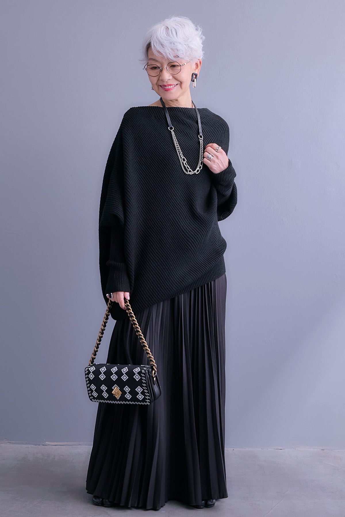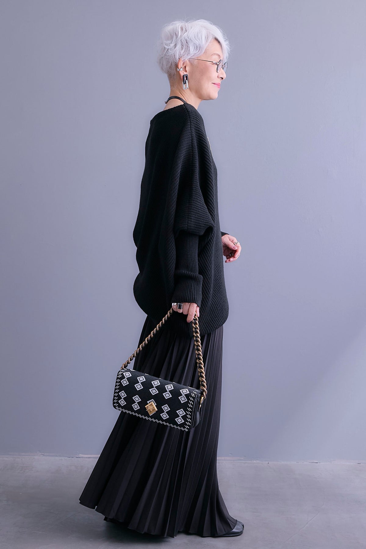 【SET】アシンメトリーボートネックドルマンニット+ルーズロングプリーツスカート(2set)
