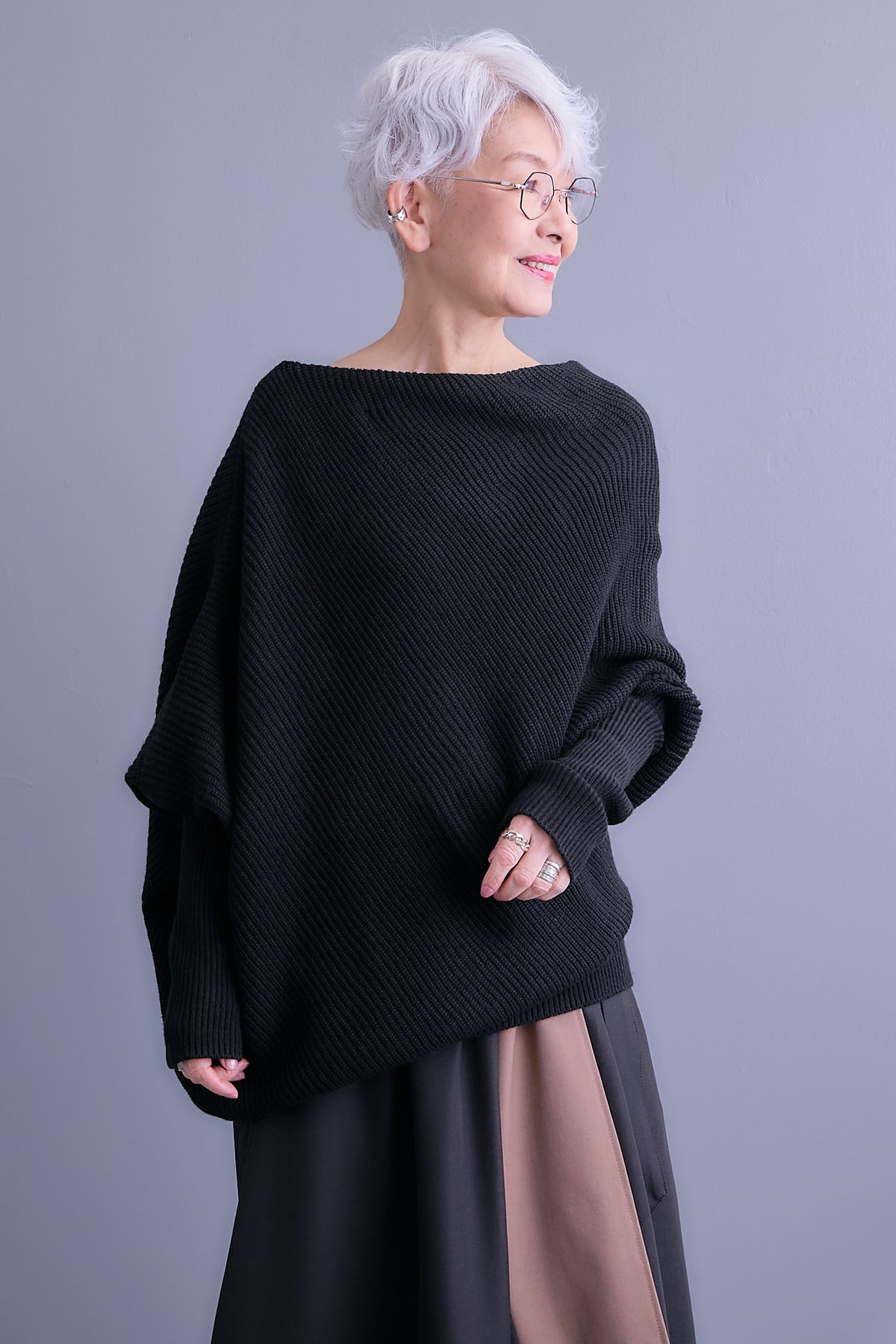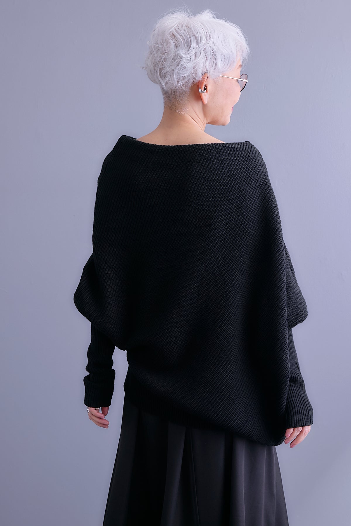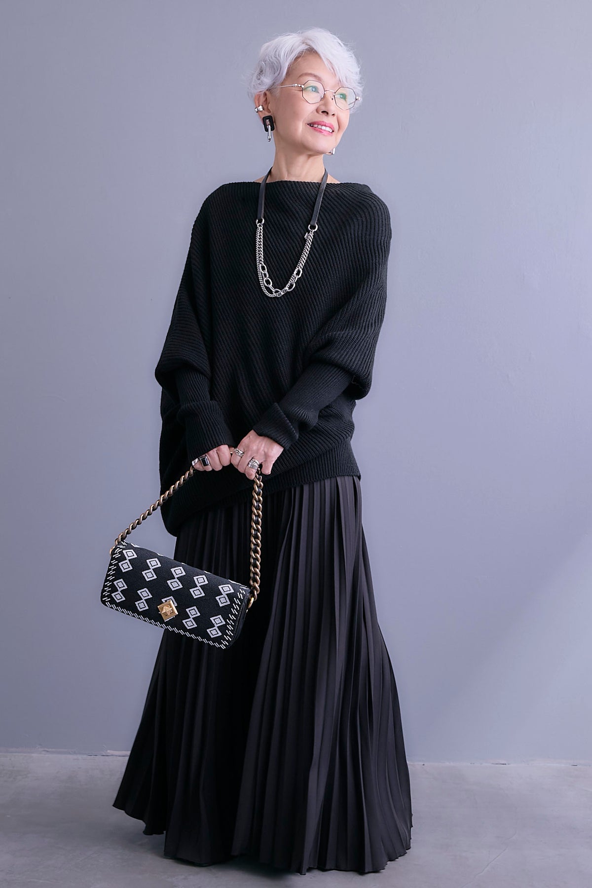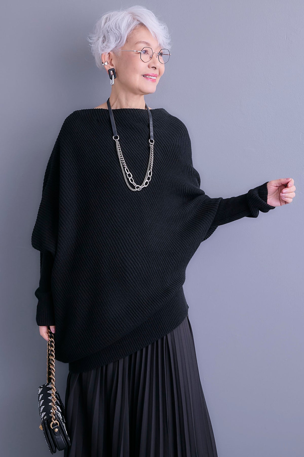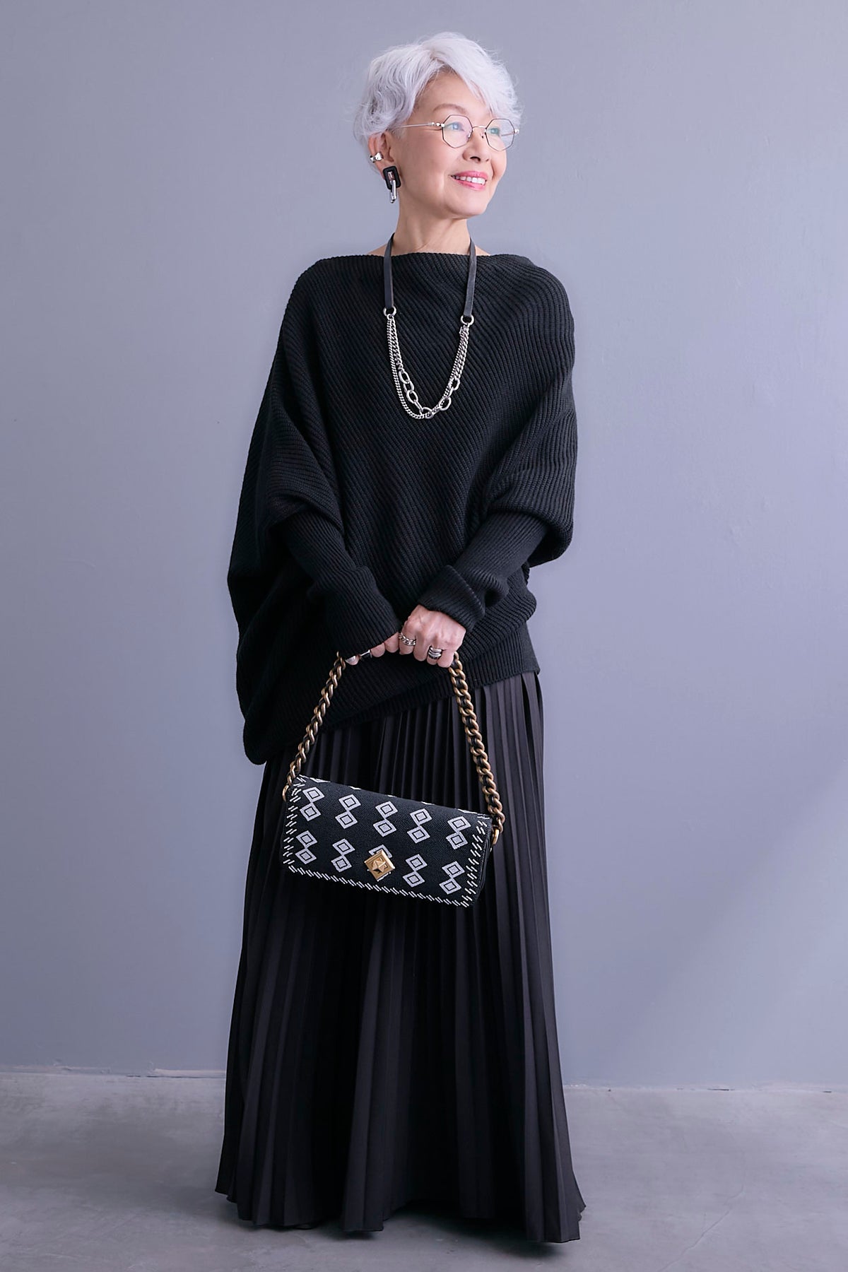 【SET】アシンメトリーボートネックドルマンニット+ルーズロングプリーツスカート(2set)