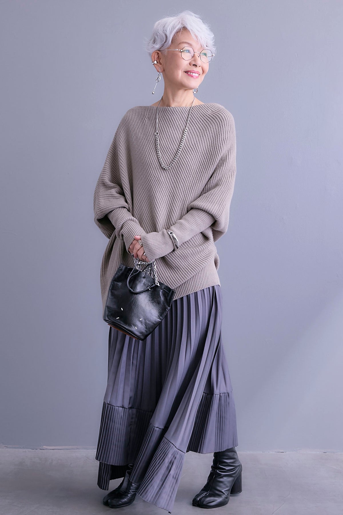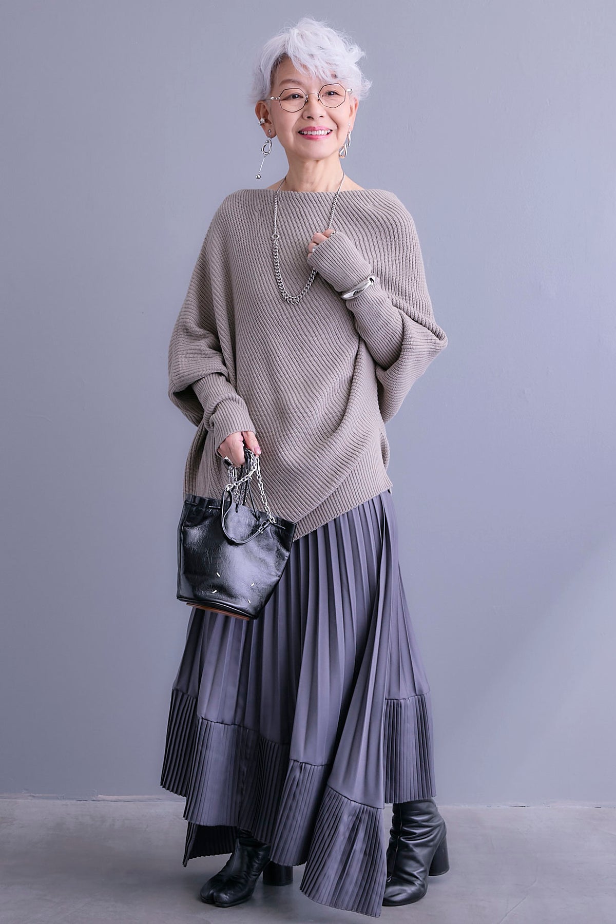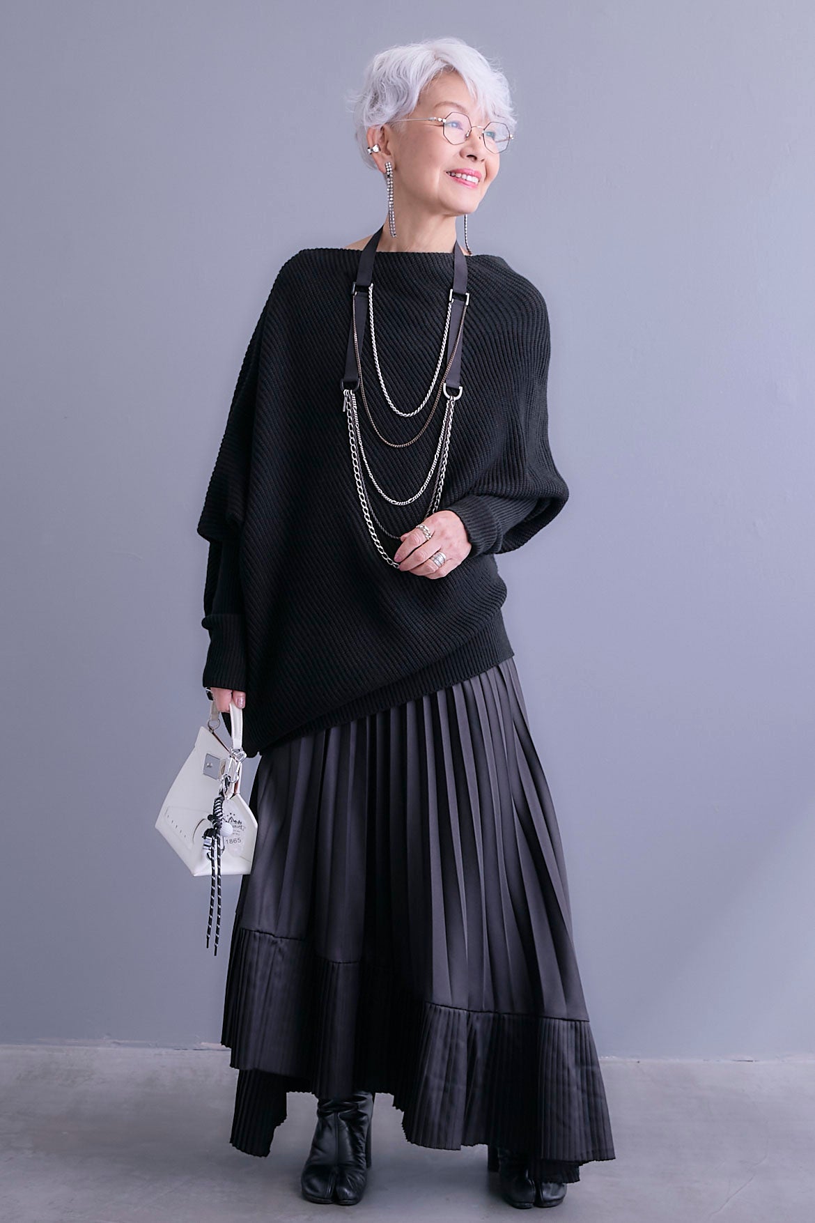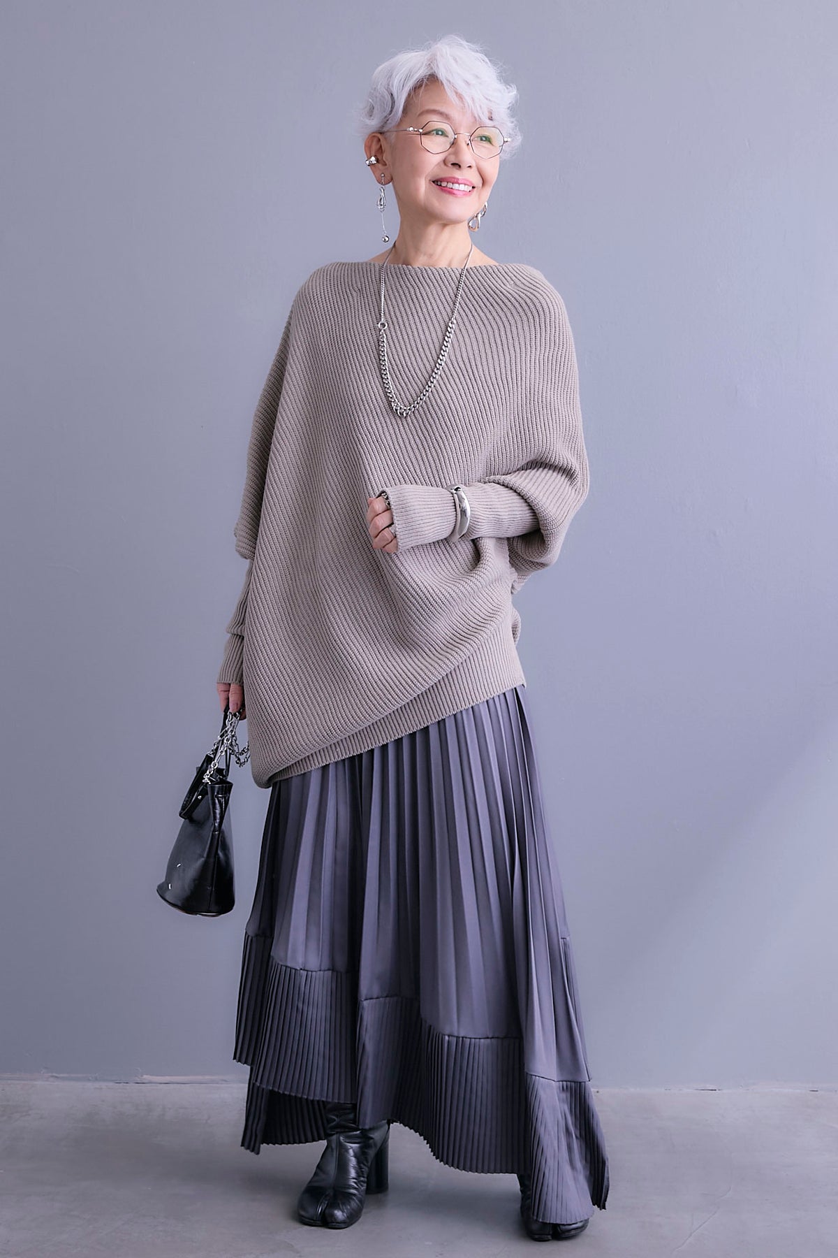 【SET】アシンメトリーボートネックドルマンニット+アシンメトリープリーツスカート(2set)