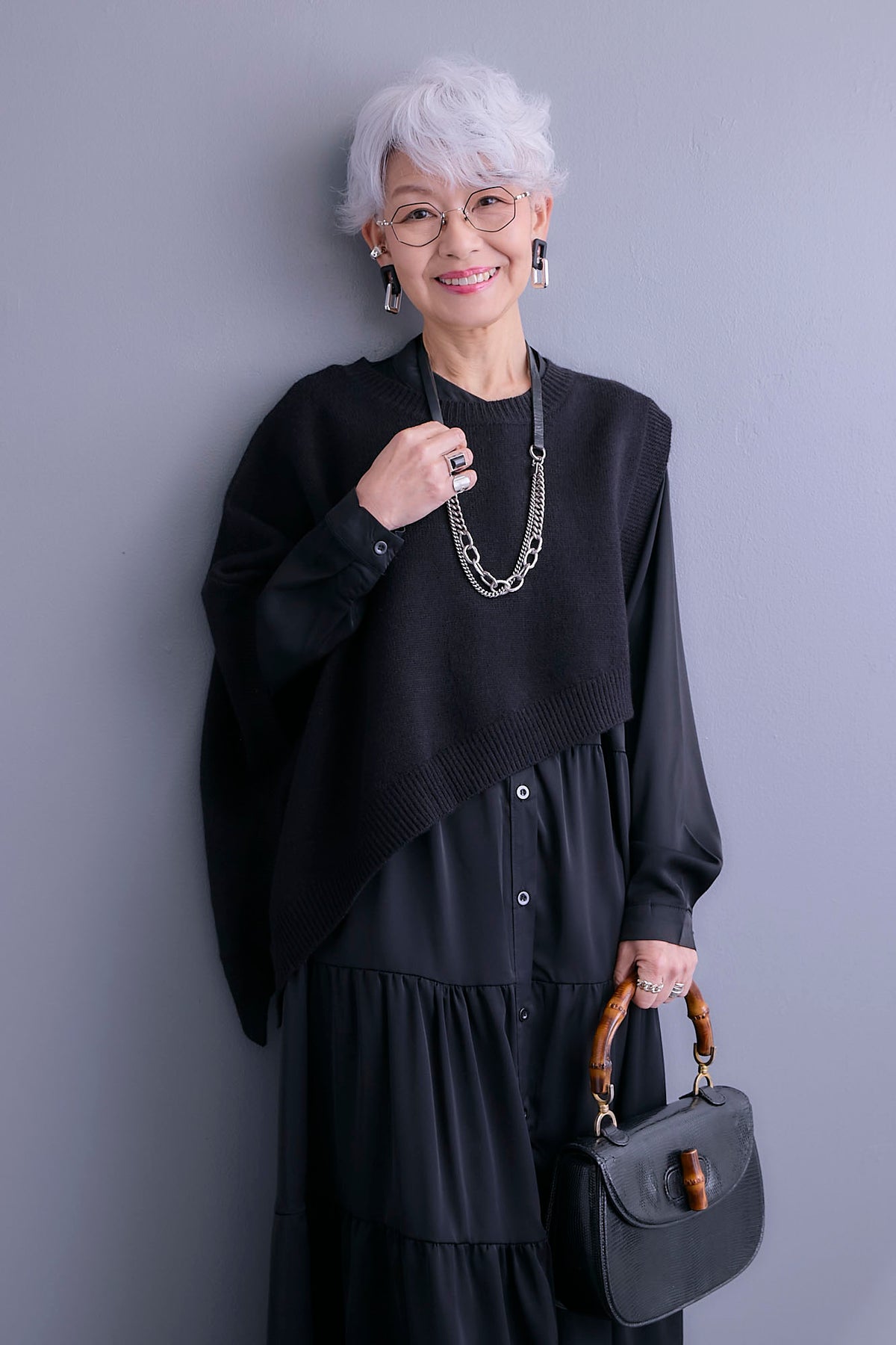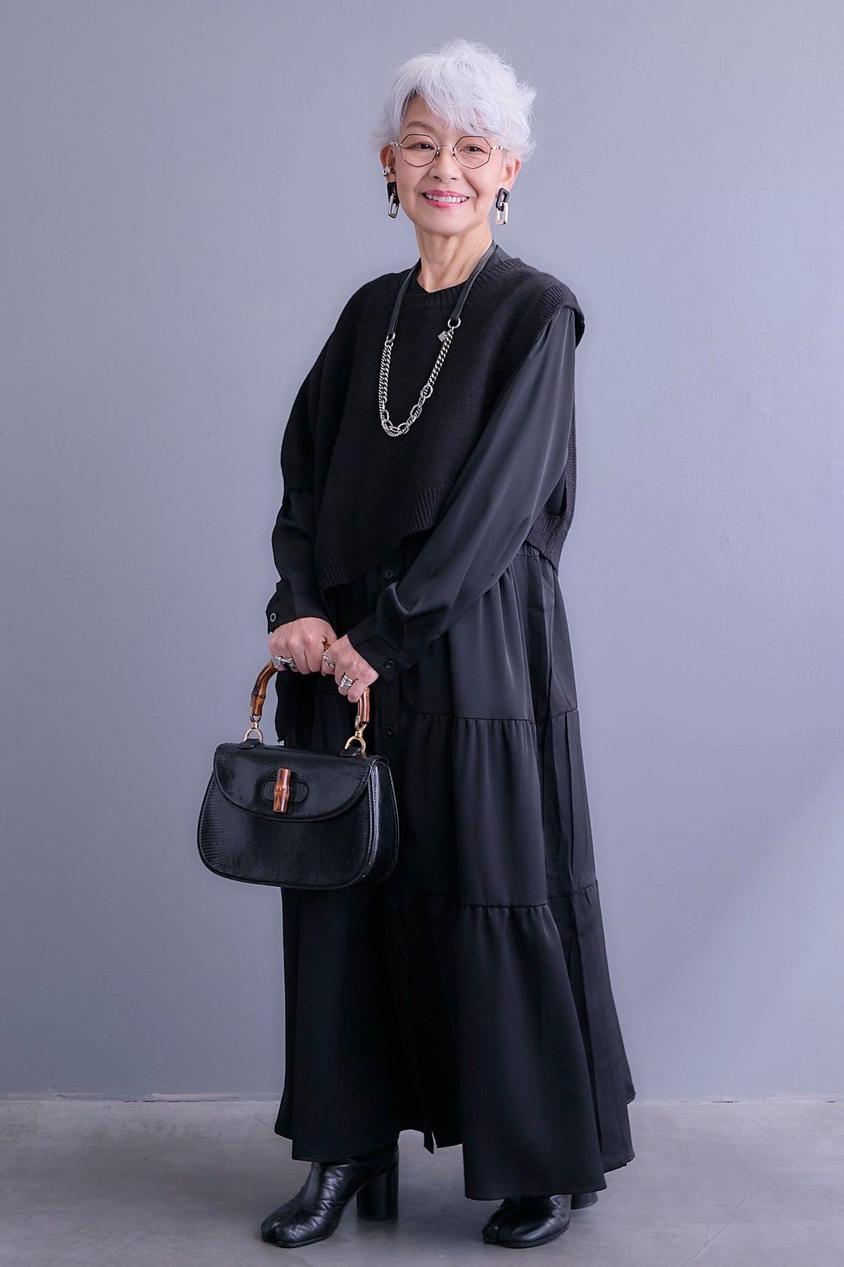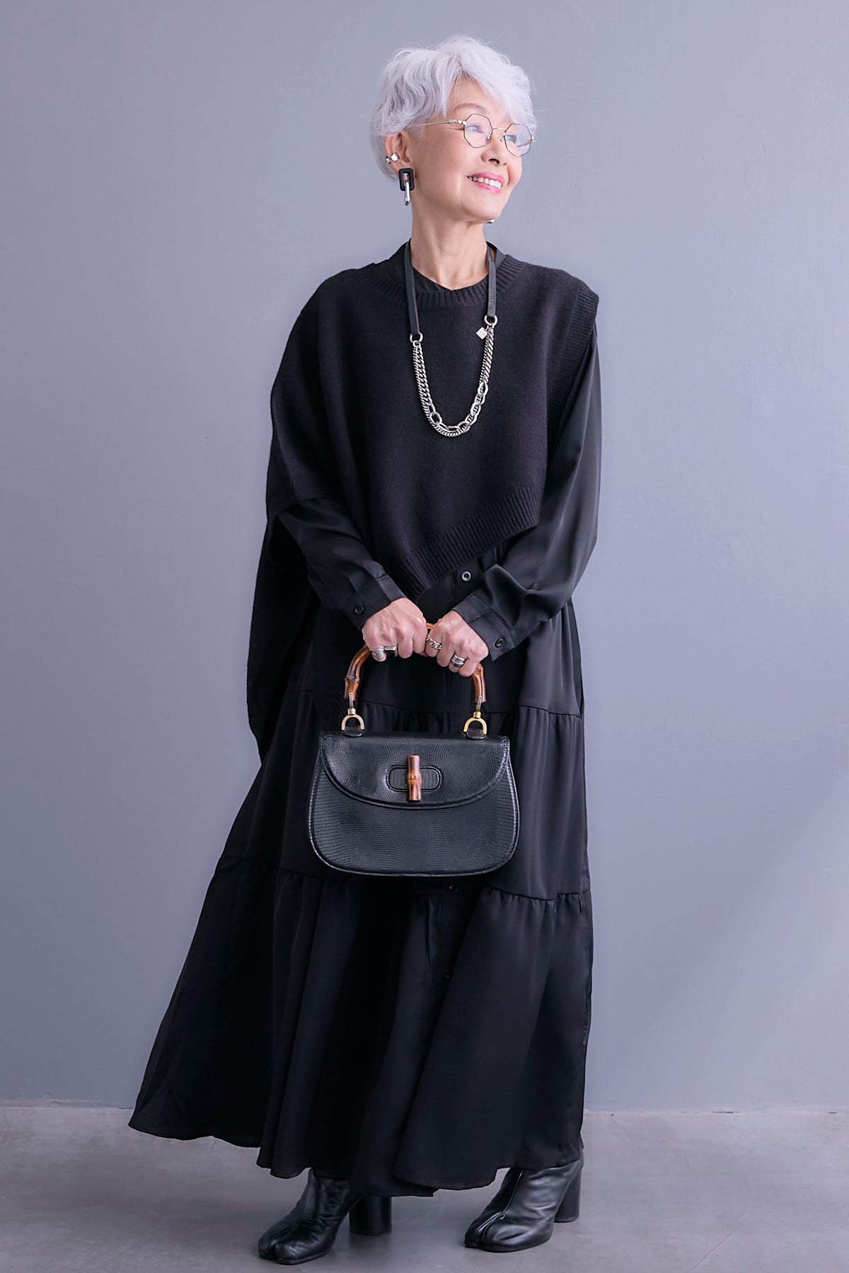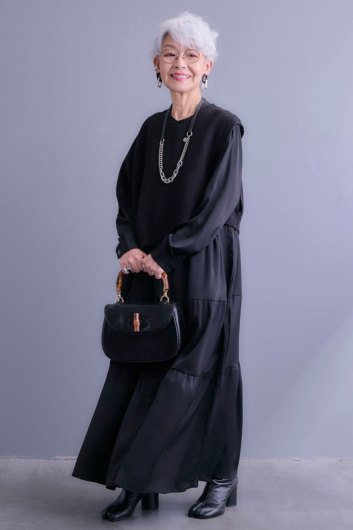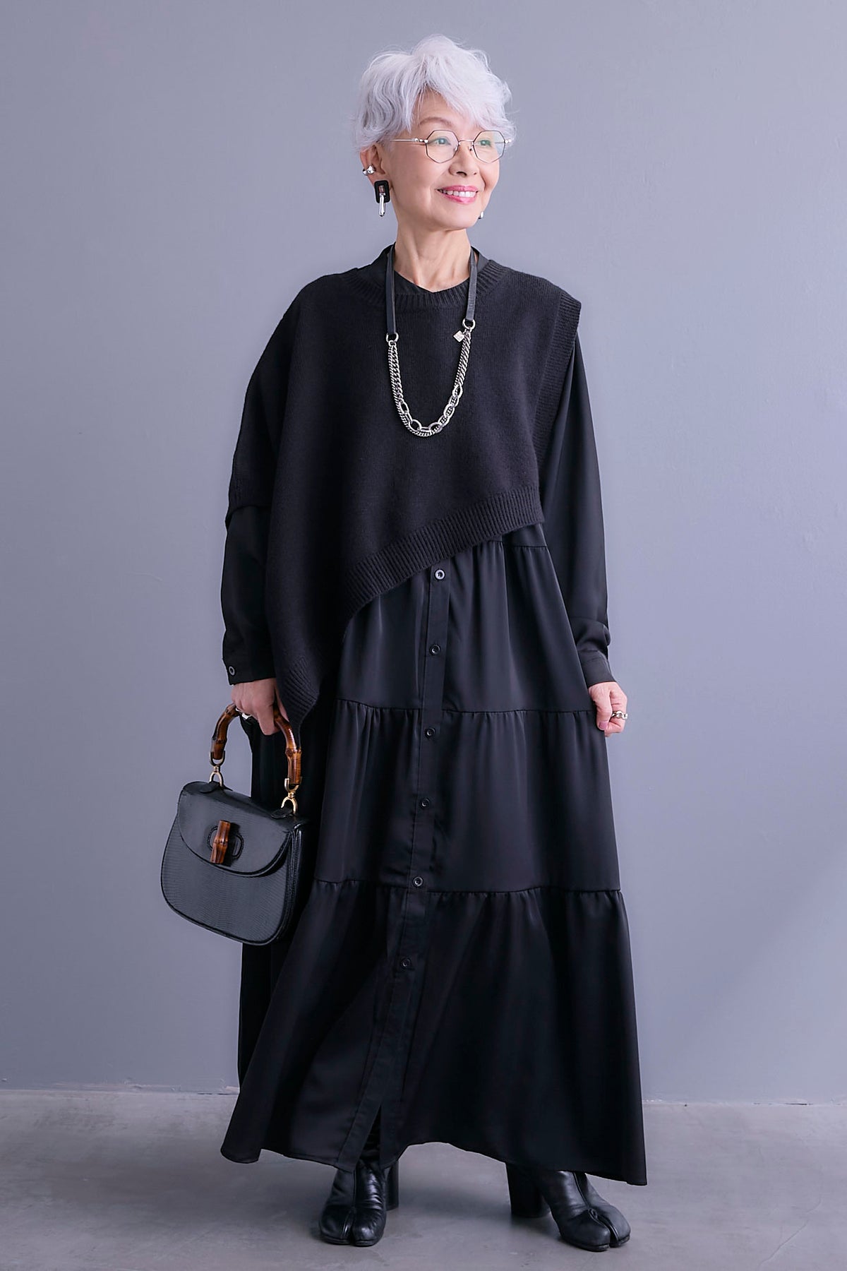 【SET】ケープライクアシンメトリーニットベスト+マットサテンティアードシャツワンピース(2set)