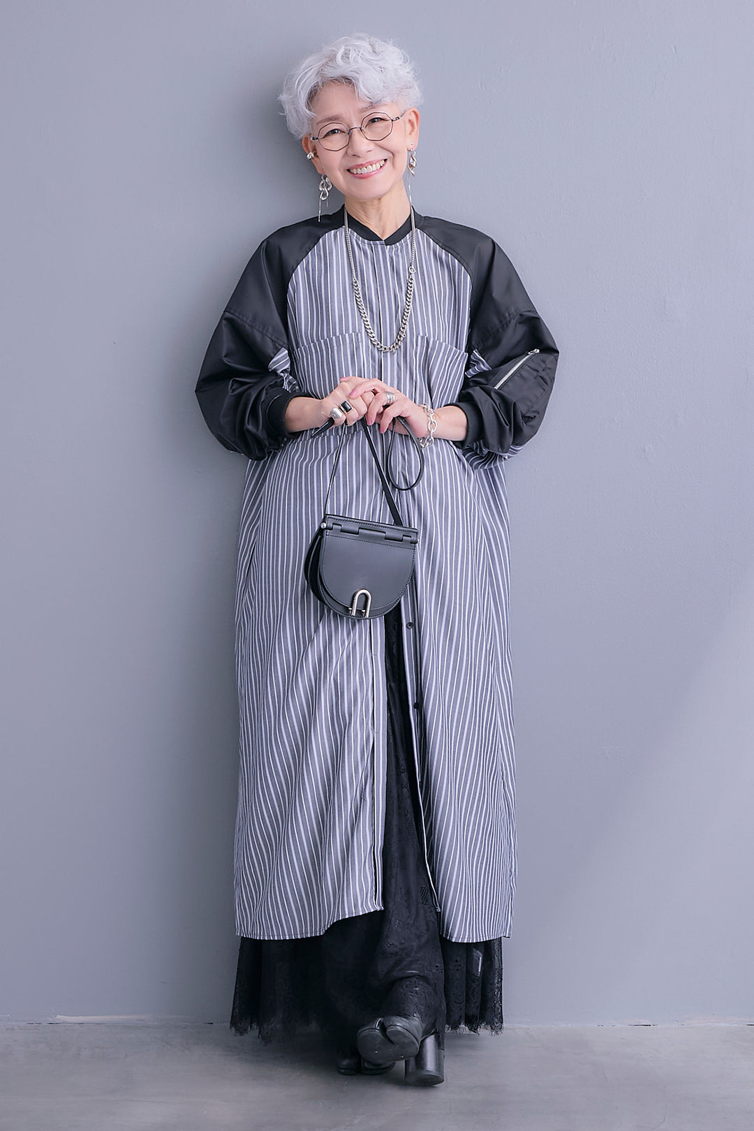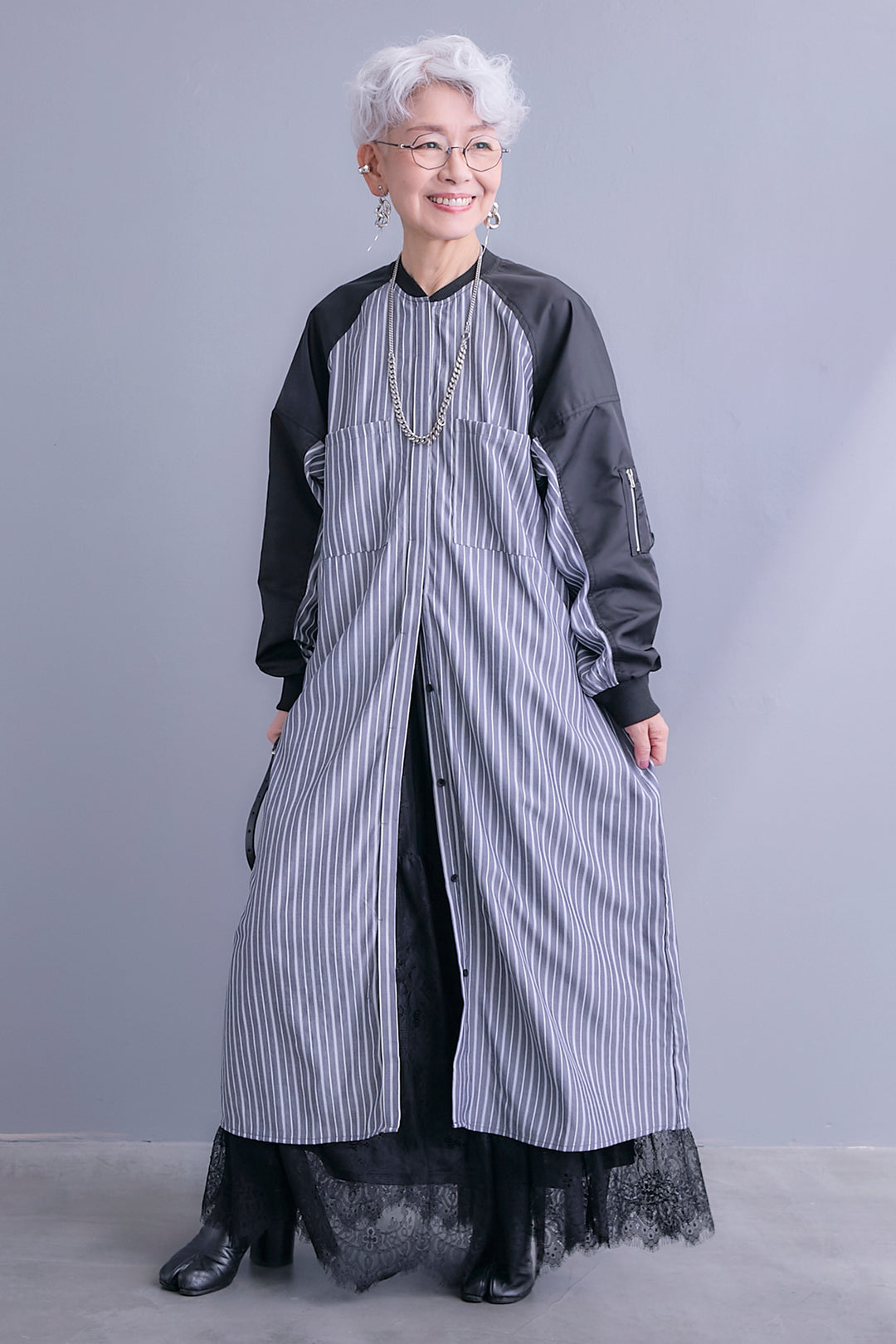 【SET】MA-1スリーブストライプシャツワンピース+アイラッシュレースロングスカート(2set)