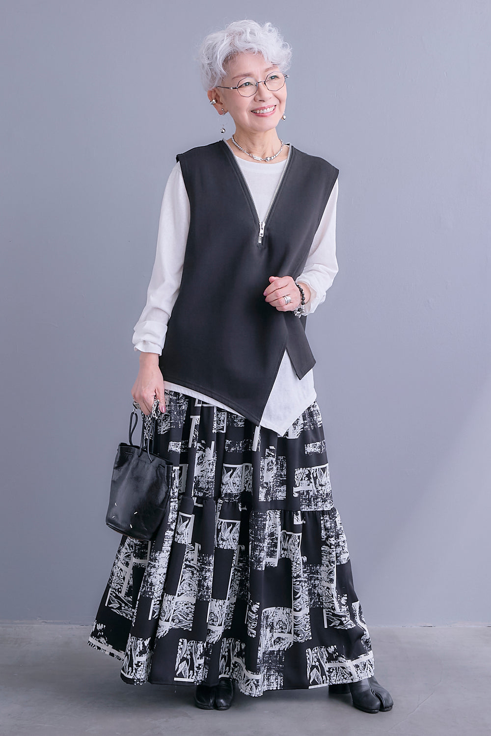 【SET】ZIPオープンVネックベスト+アシメロンT+スズランモノトーンフレアスカート(2set)