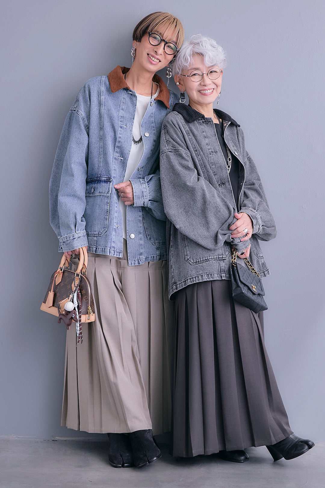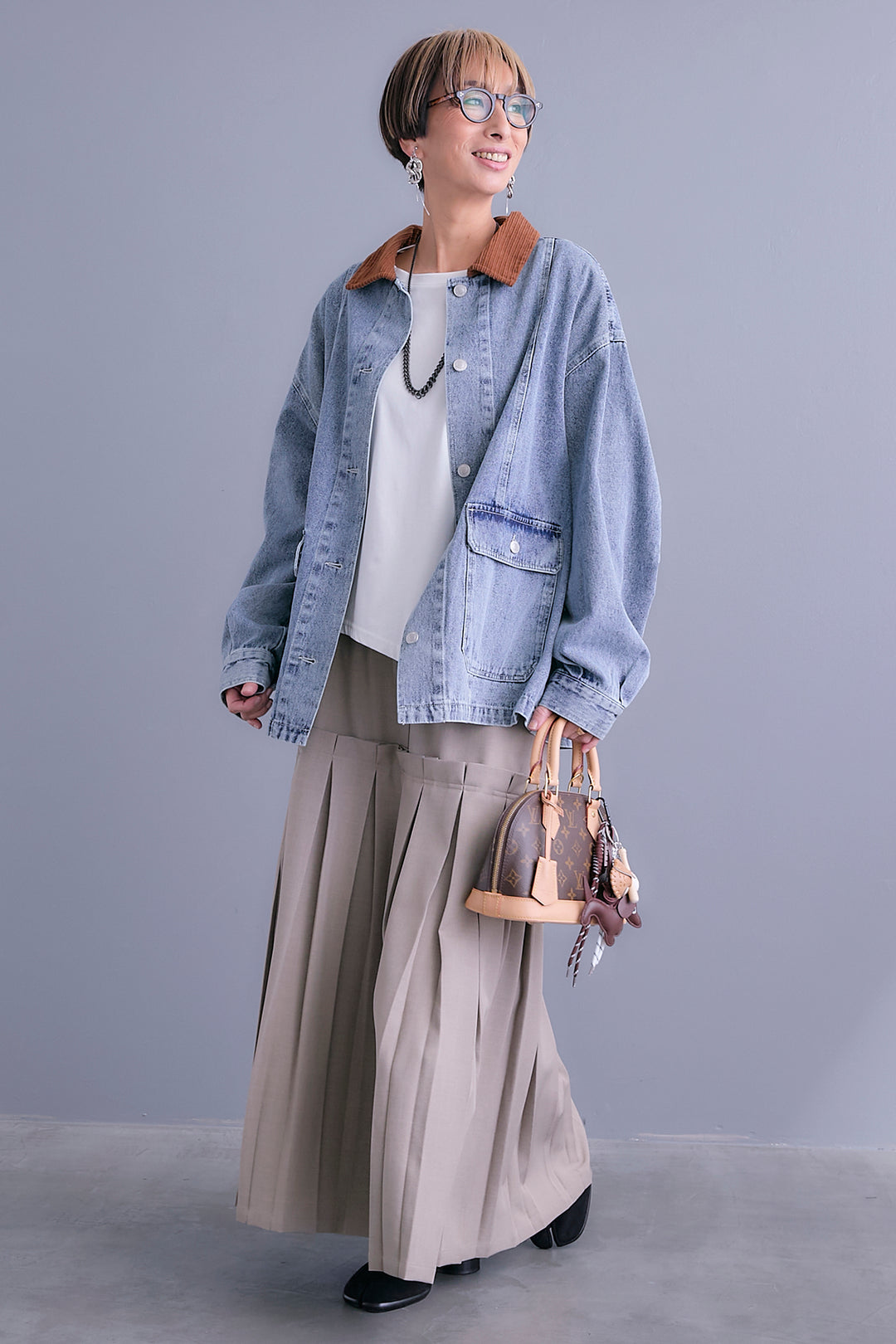 【SET】コーデュロイカラー10ozデニムジャケット+アシンメトリーロンT+ボックスプリーツロングスカート(3set)
