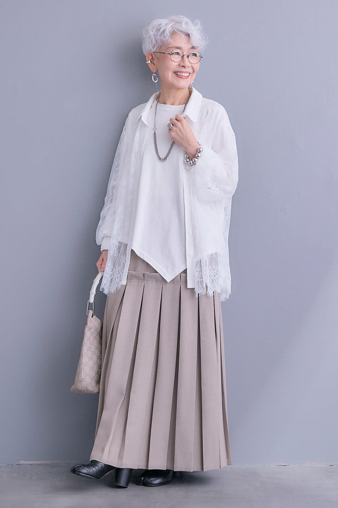 【SET】アイラッシュレースボリュームスリーブシャツ+アシンメトリーロンT+ボックスプリーツロングスカート(3set)