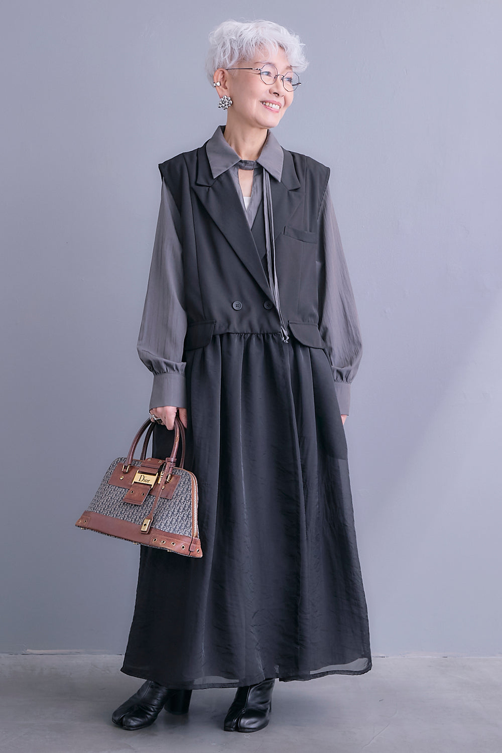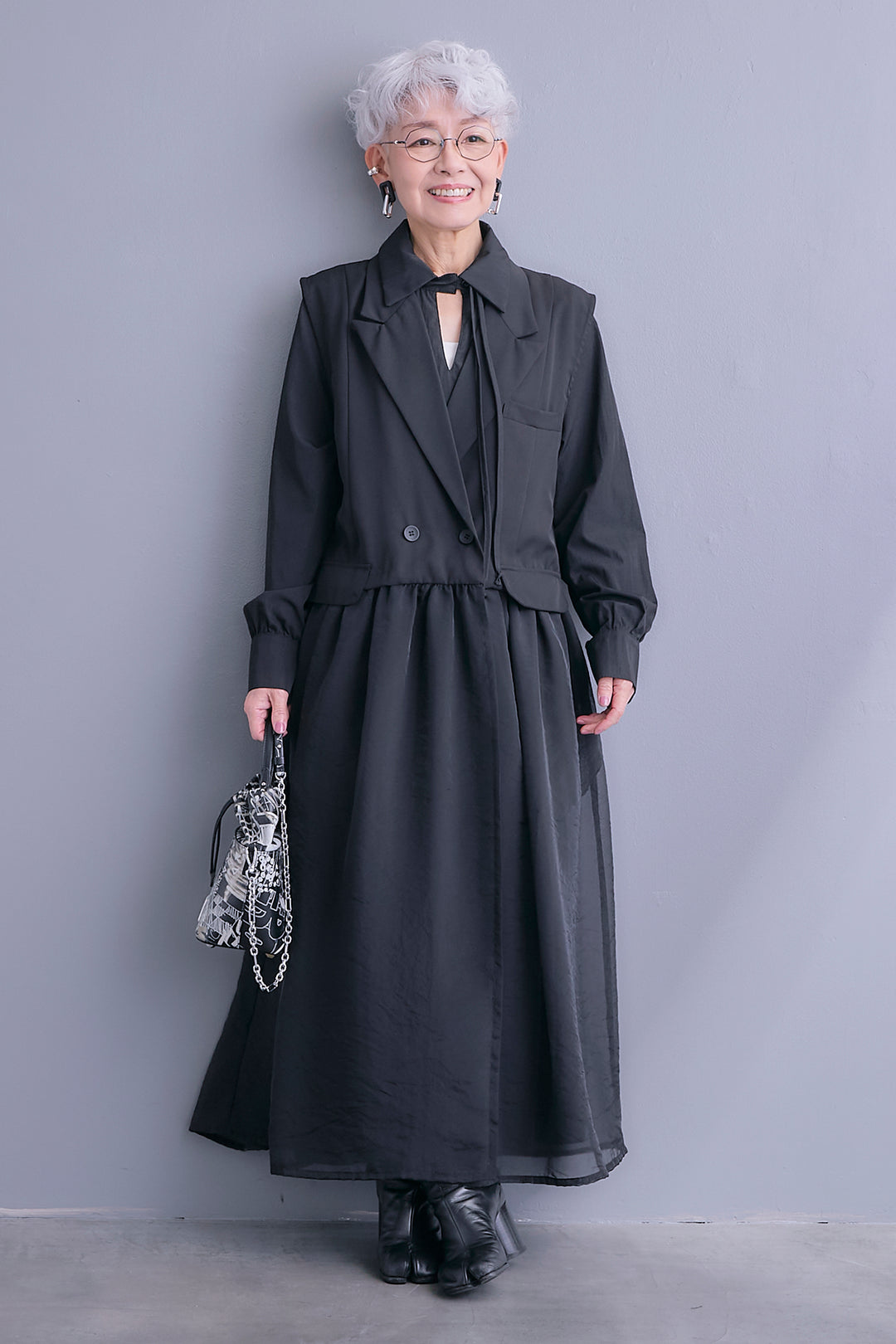 【SET】シアーオーガンジージャケットベスト+コードキーネックシャーリングデザインワンピース(2set)