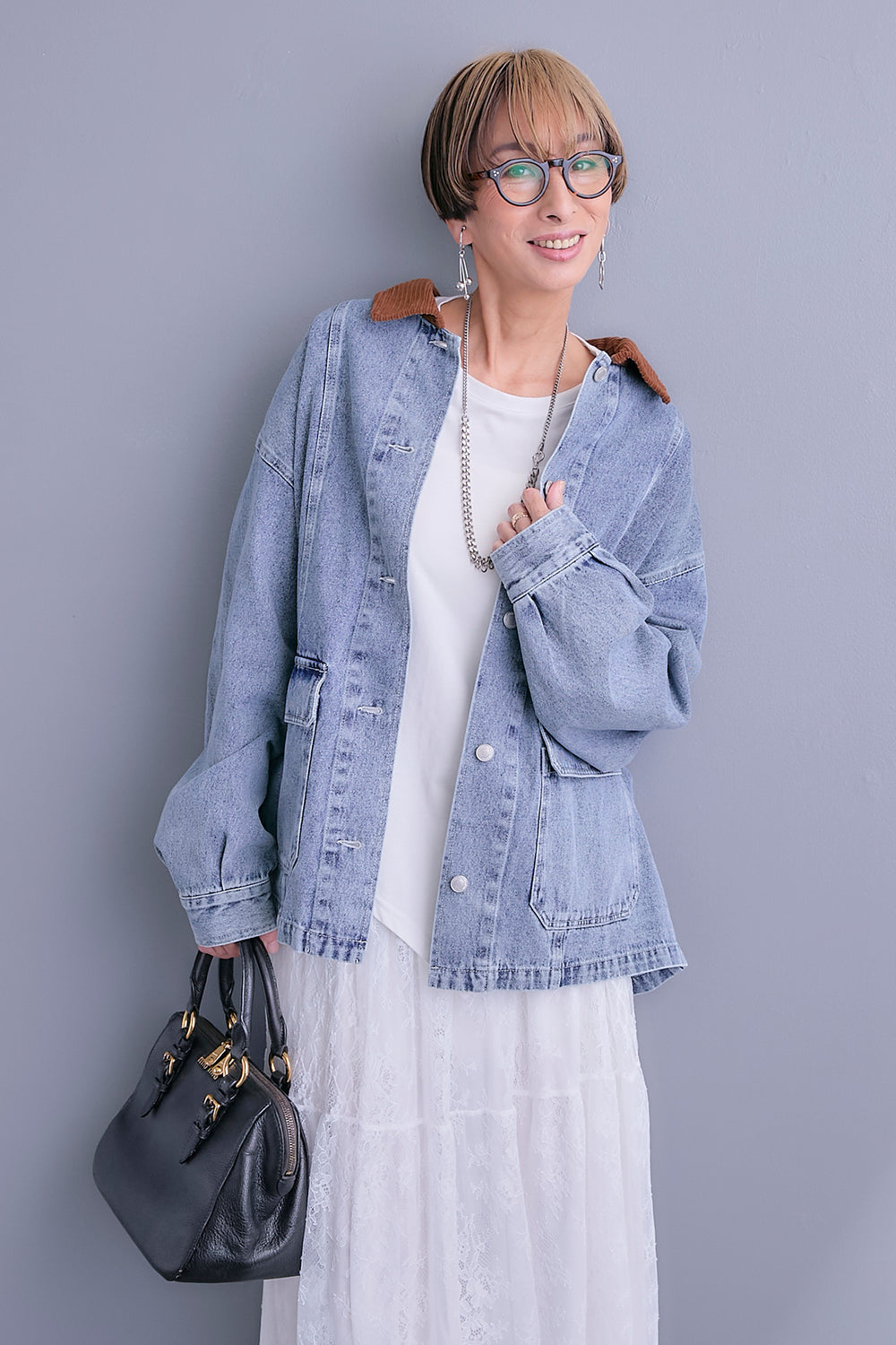 【SET】コーデュロイカラー10ozデニムジャケット+アシンメトリーロンT+アイラッシュレースロングスカート(3set)