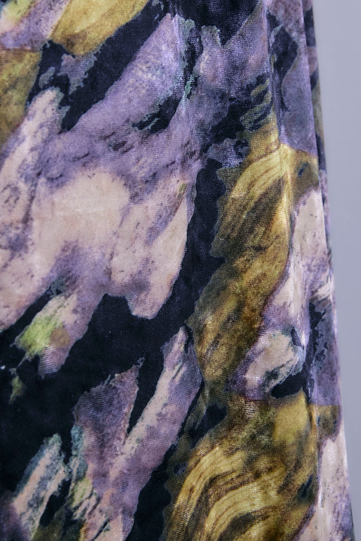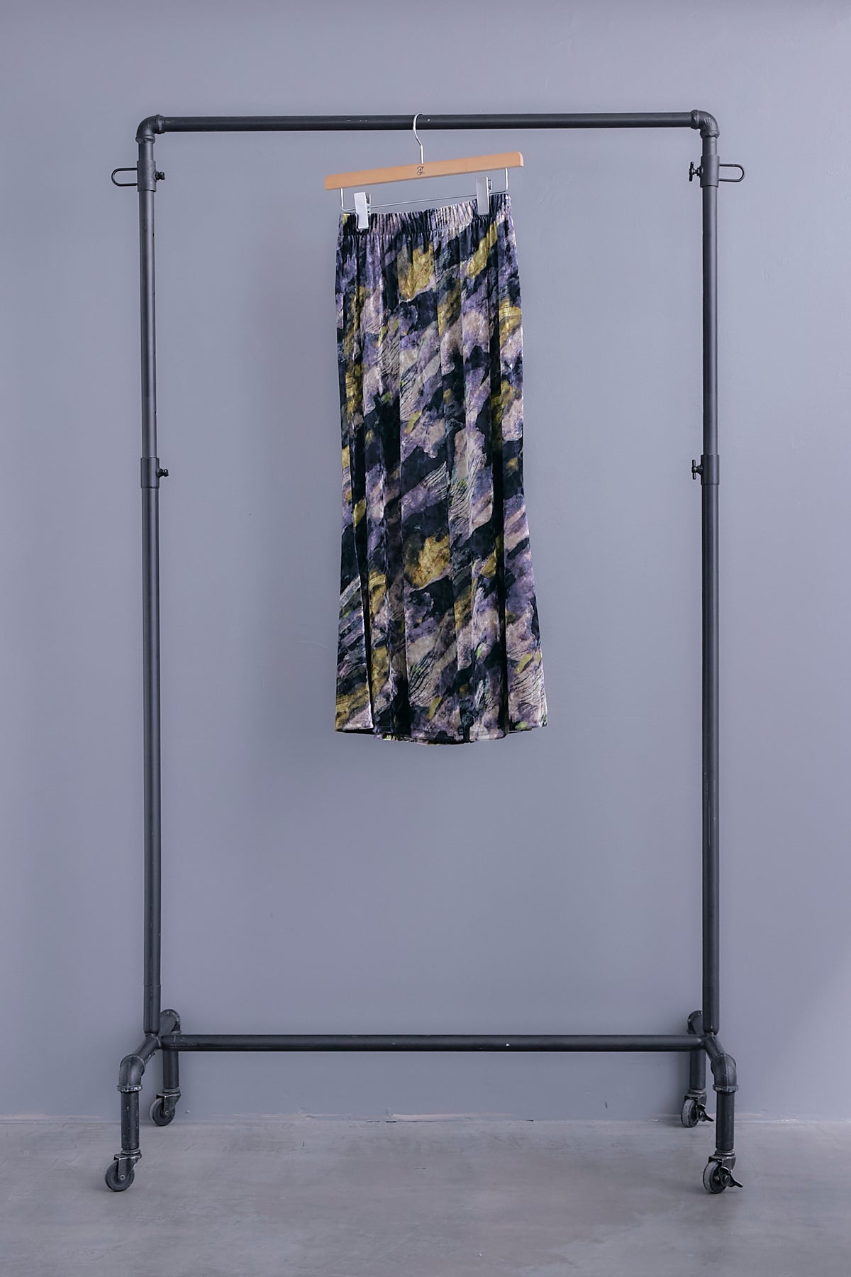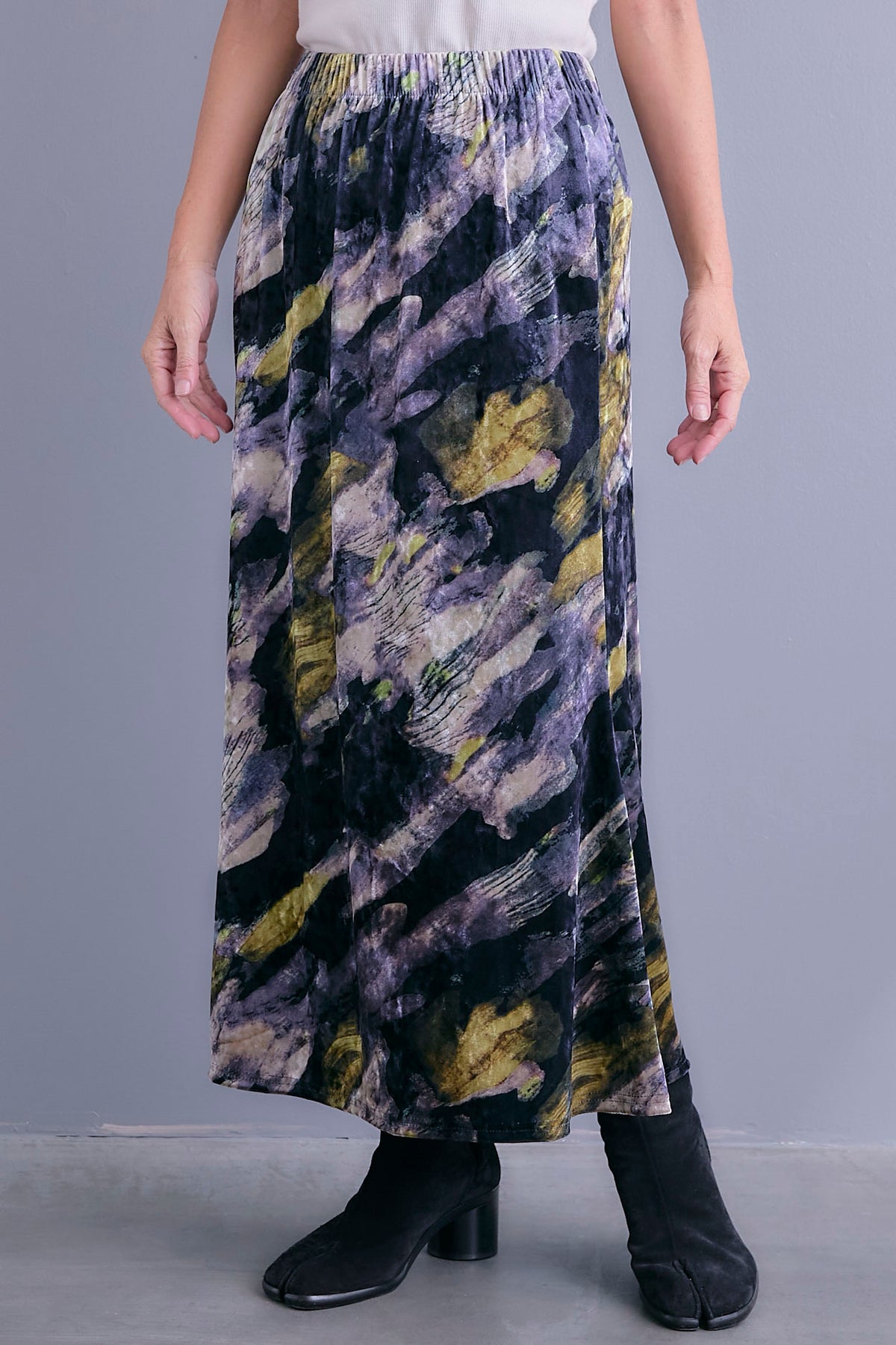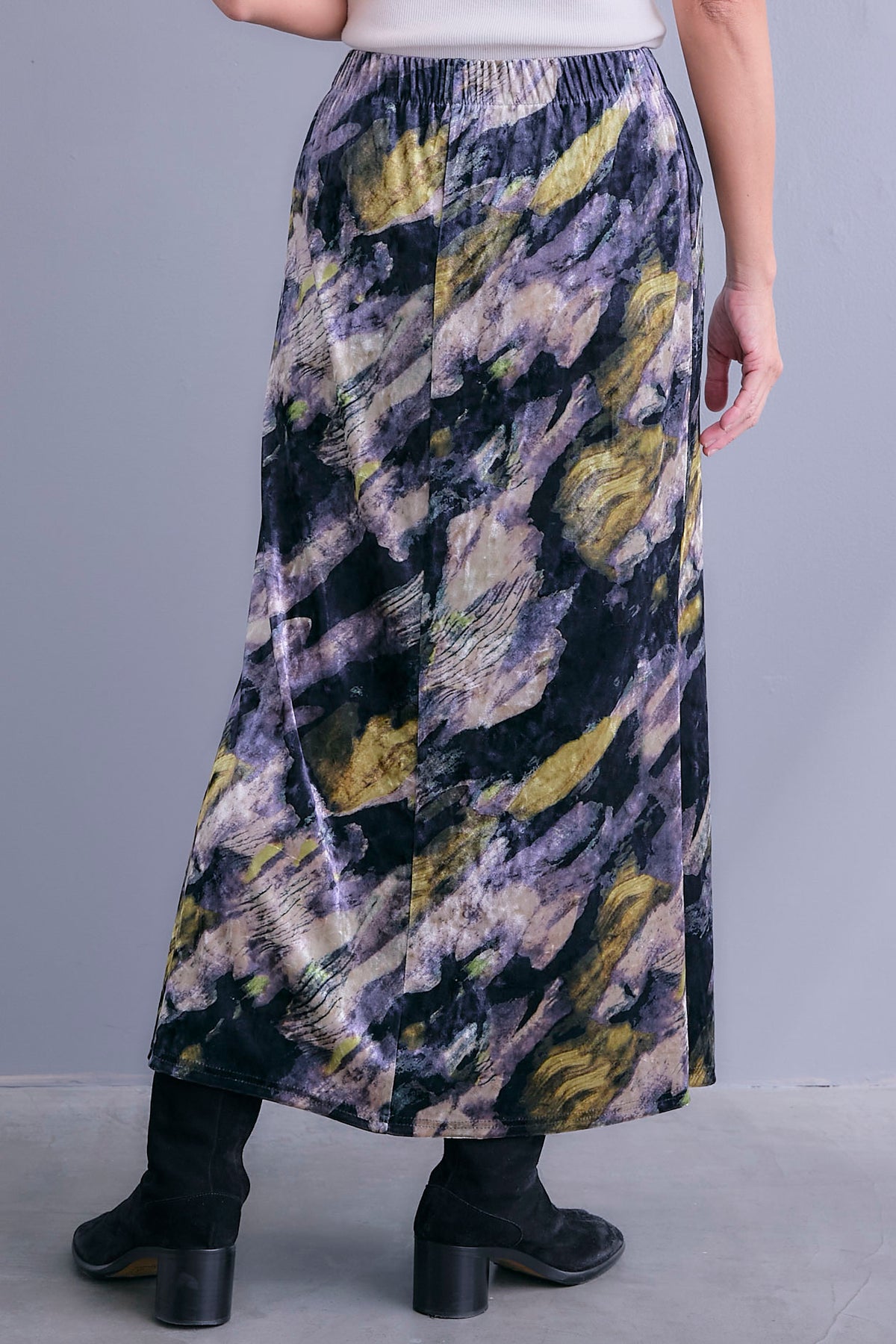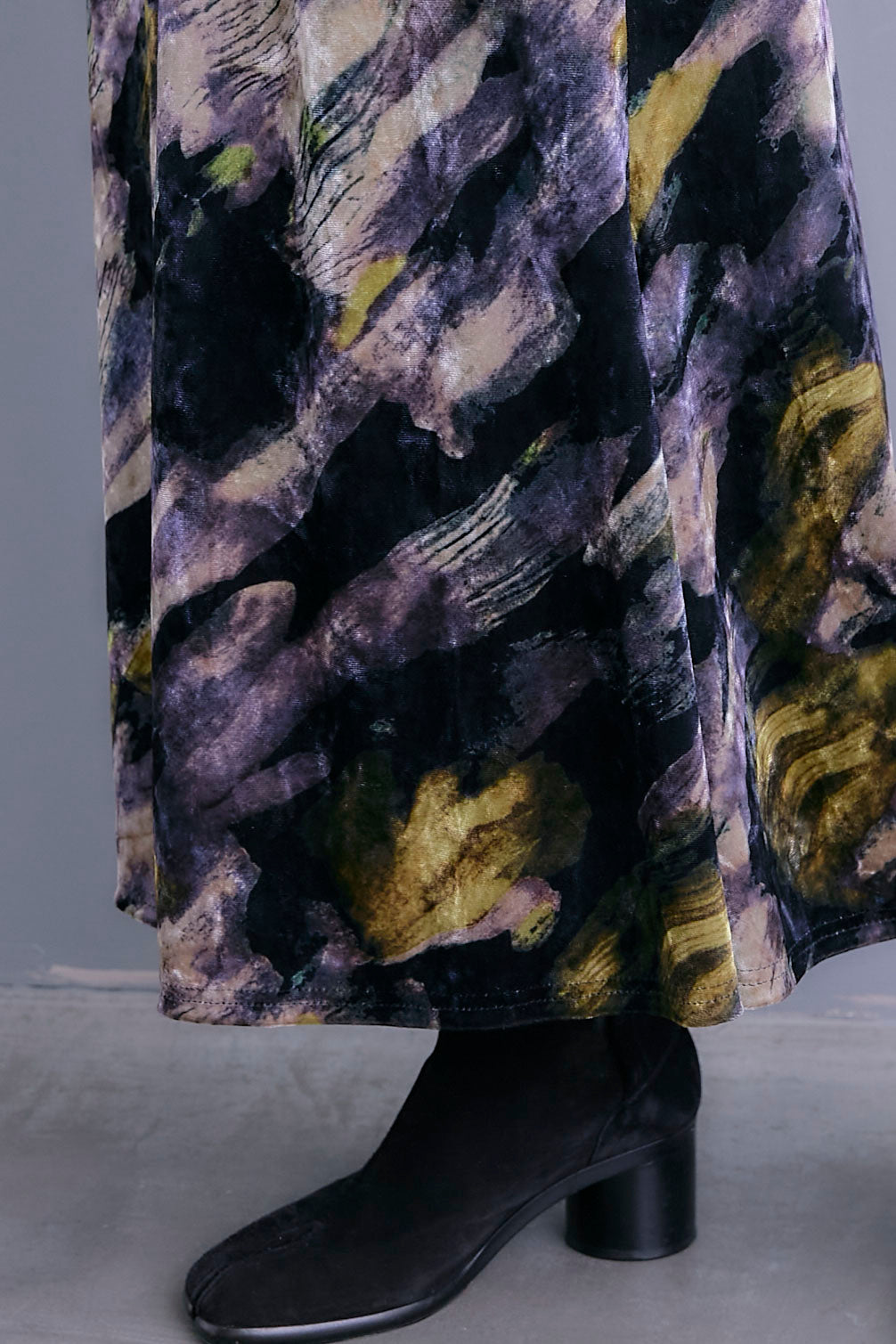 深みのあるベロア素材に、抽象的なアート柄を重ねたニュアンススカート。光の当たり方で表情が変わる質感が、装いに奥行きをもたらします。歩くたびに揺れるシルエットは重たく見えず、トップスを選ばず取り入れやすいバランス。シンプルなニットやシャツと合わせるだけで、コーディネートにさりげない個性が加わる一枚です。