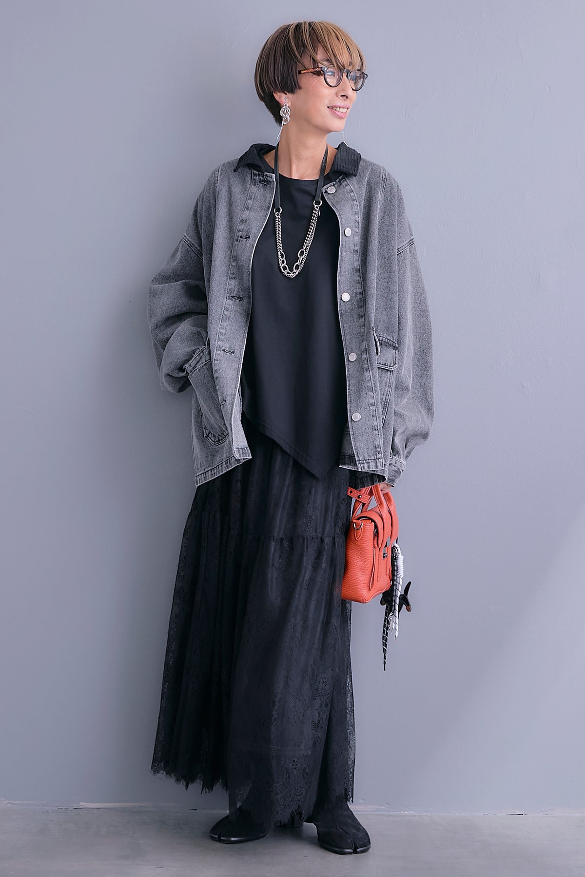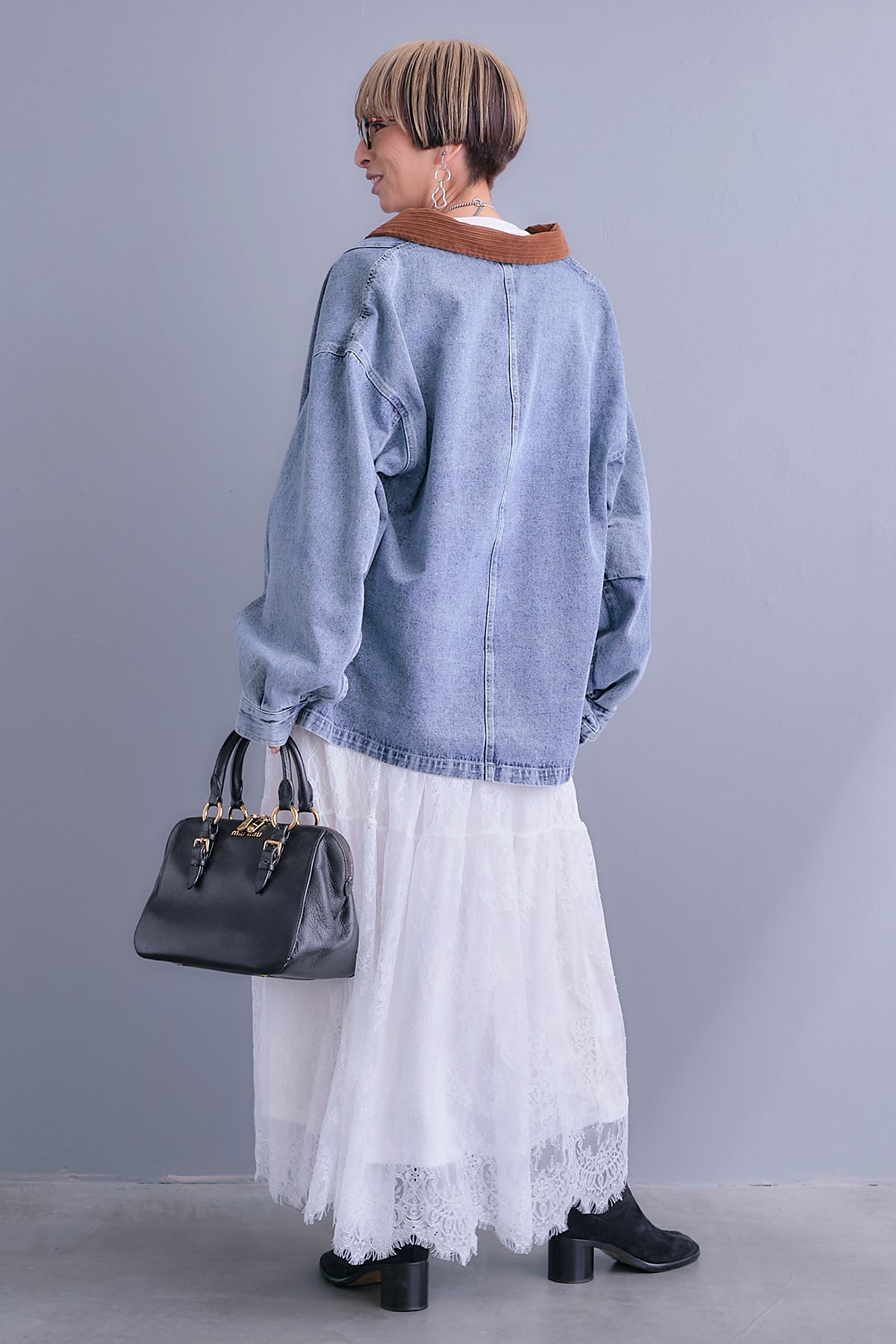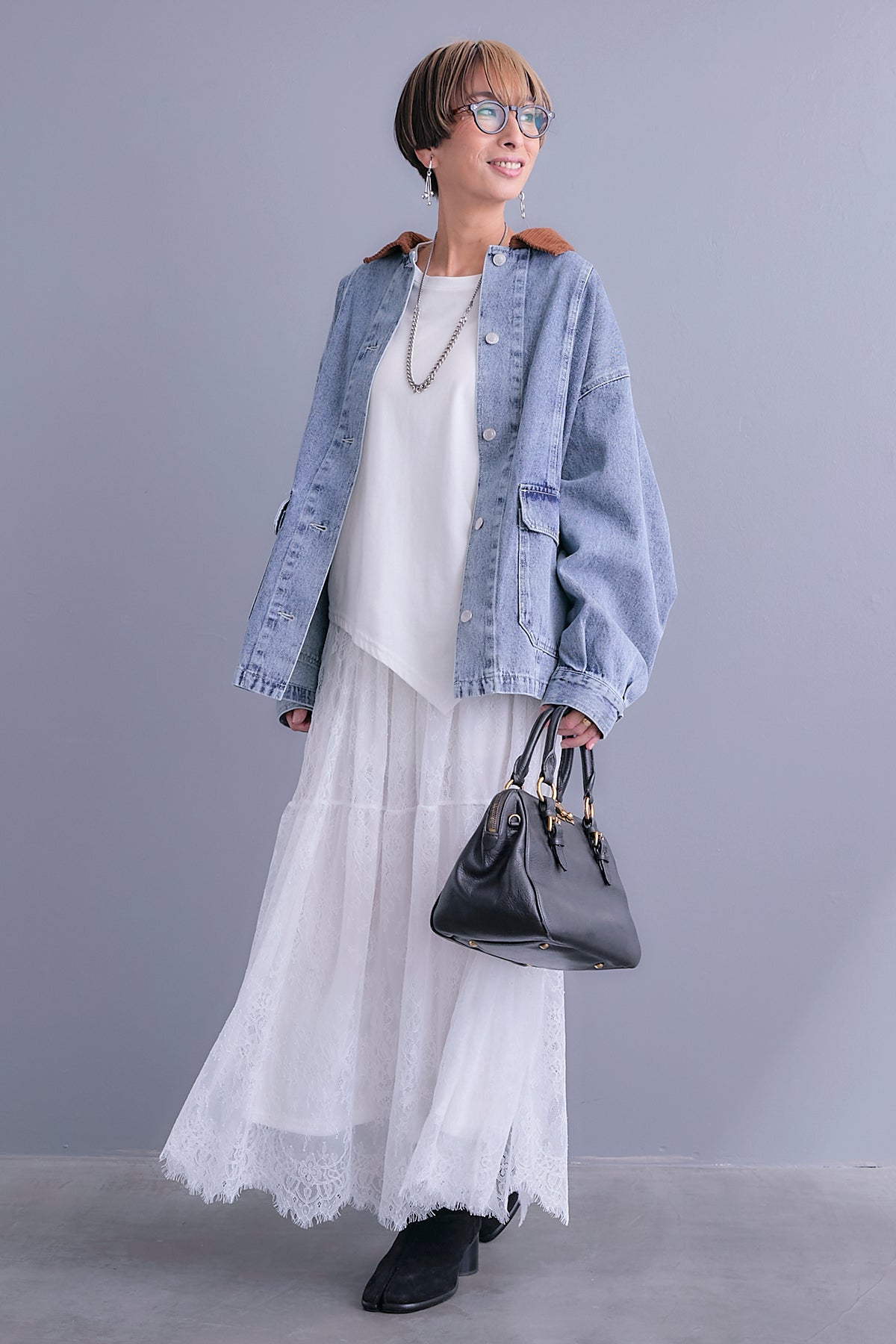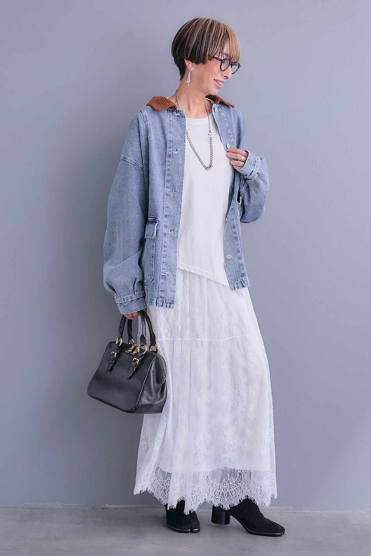 【SET】コーデュロイカラー10ozデニムジャケット+アシンメトリーロンT+アイラッシュレースロングスカート(3set)