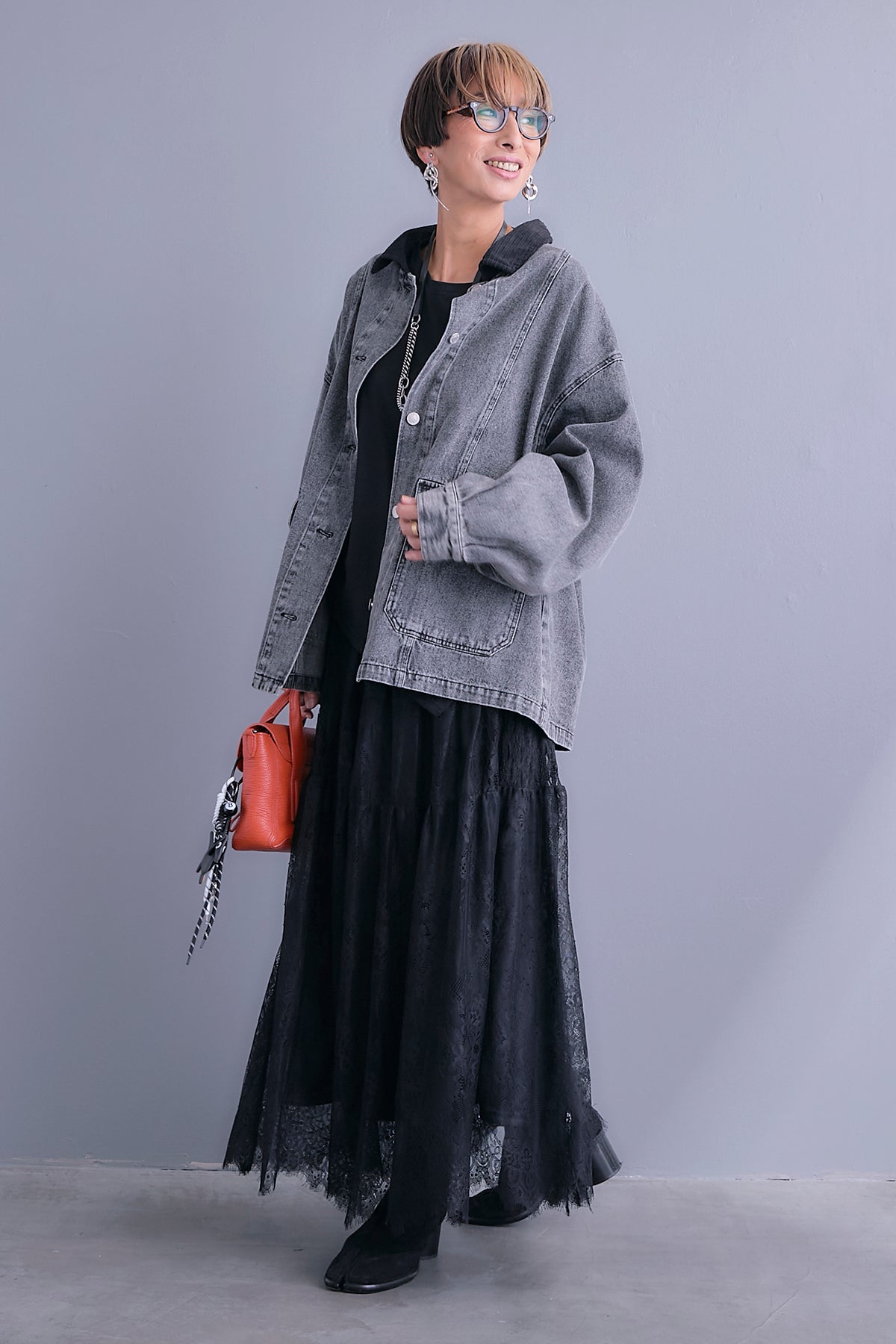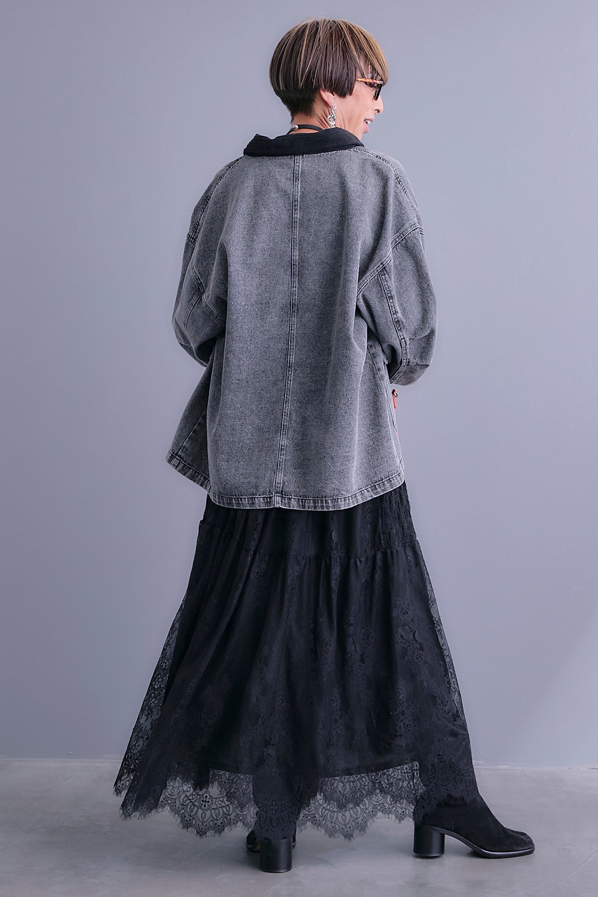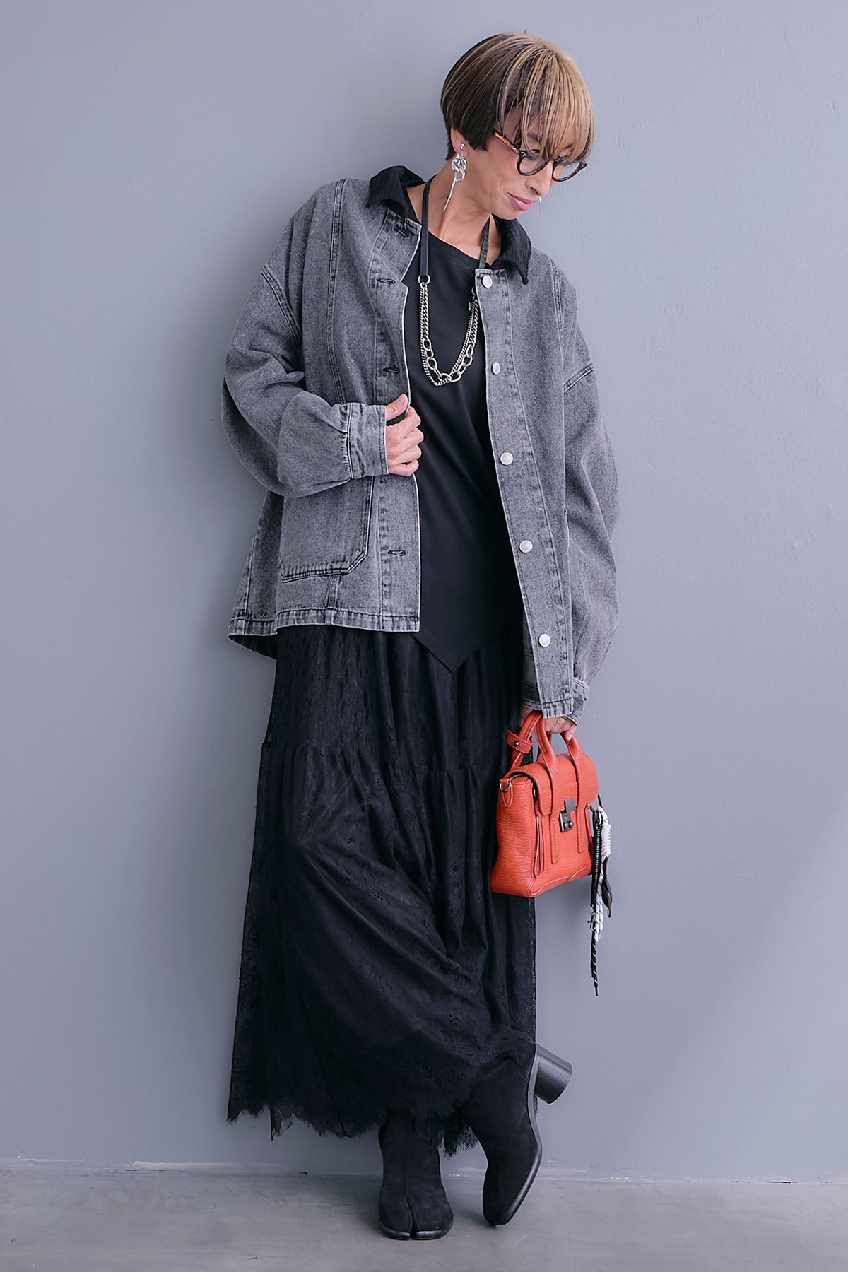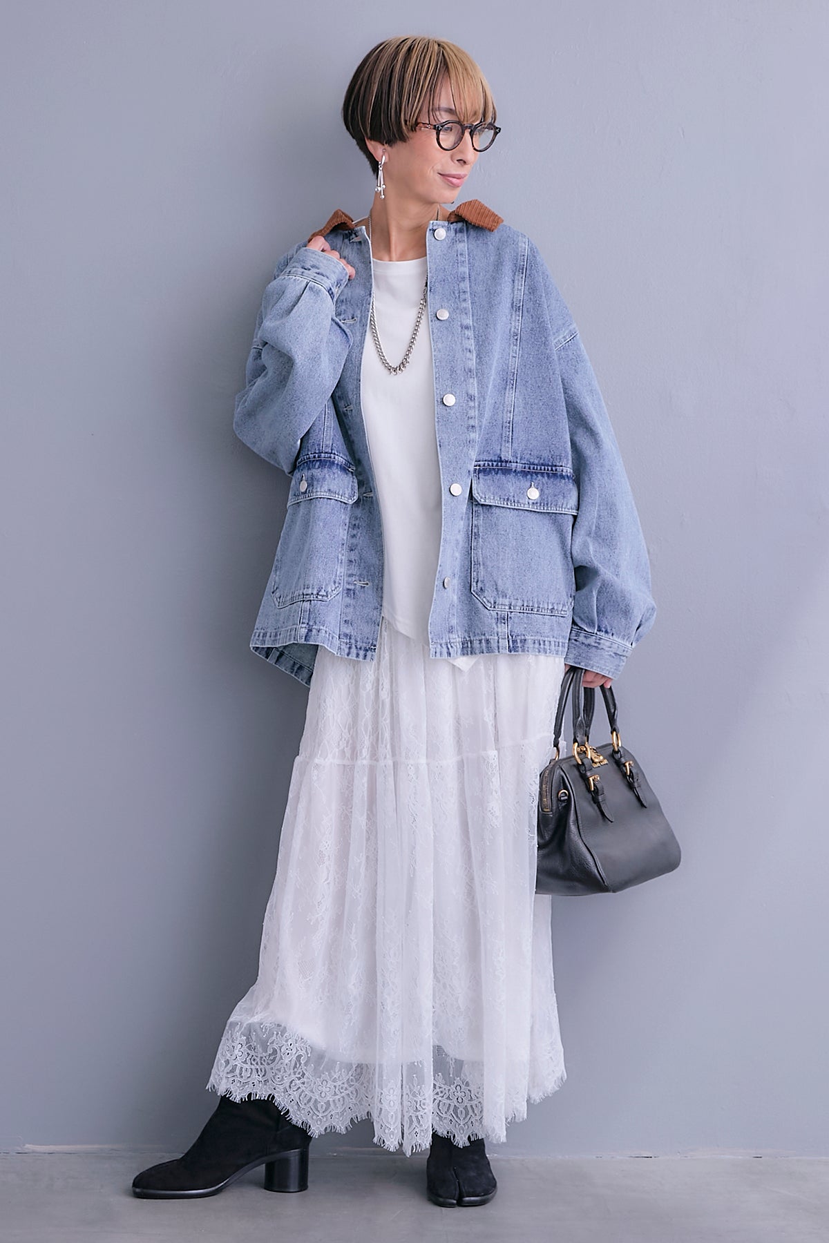 【SET】コーデュロイカラー10ozデニムジャケット+アシンメトリーロンT+アイラッシュレースロングスカート(3set)
