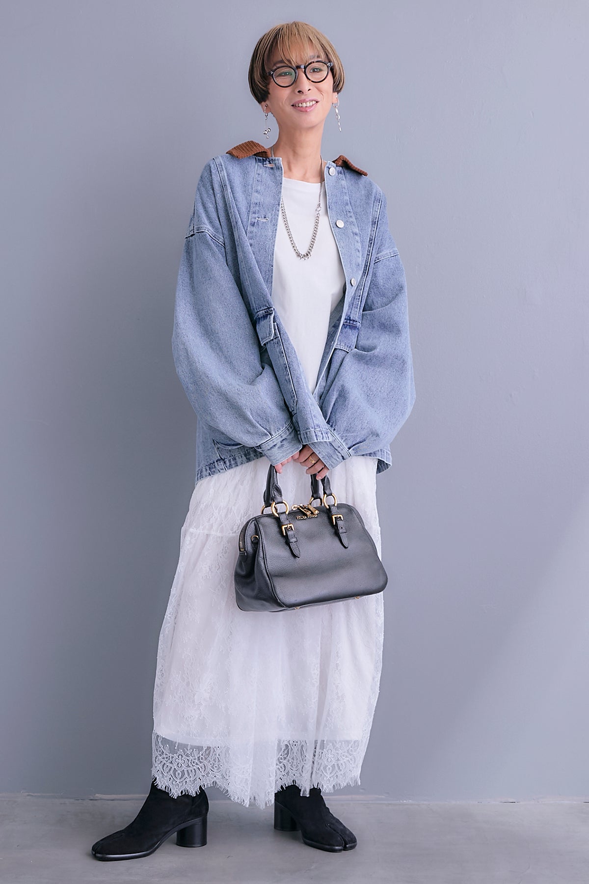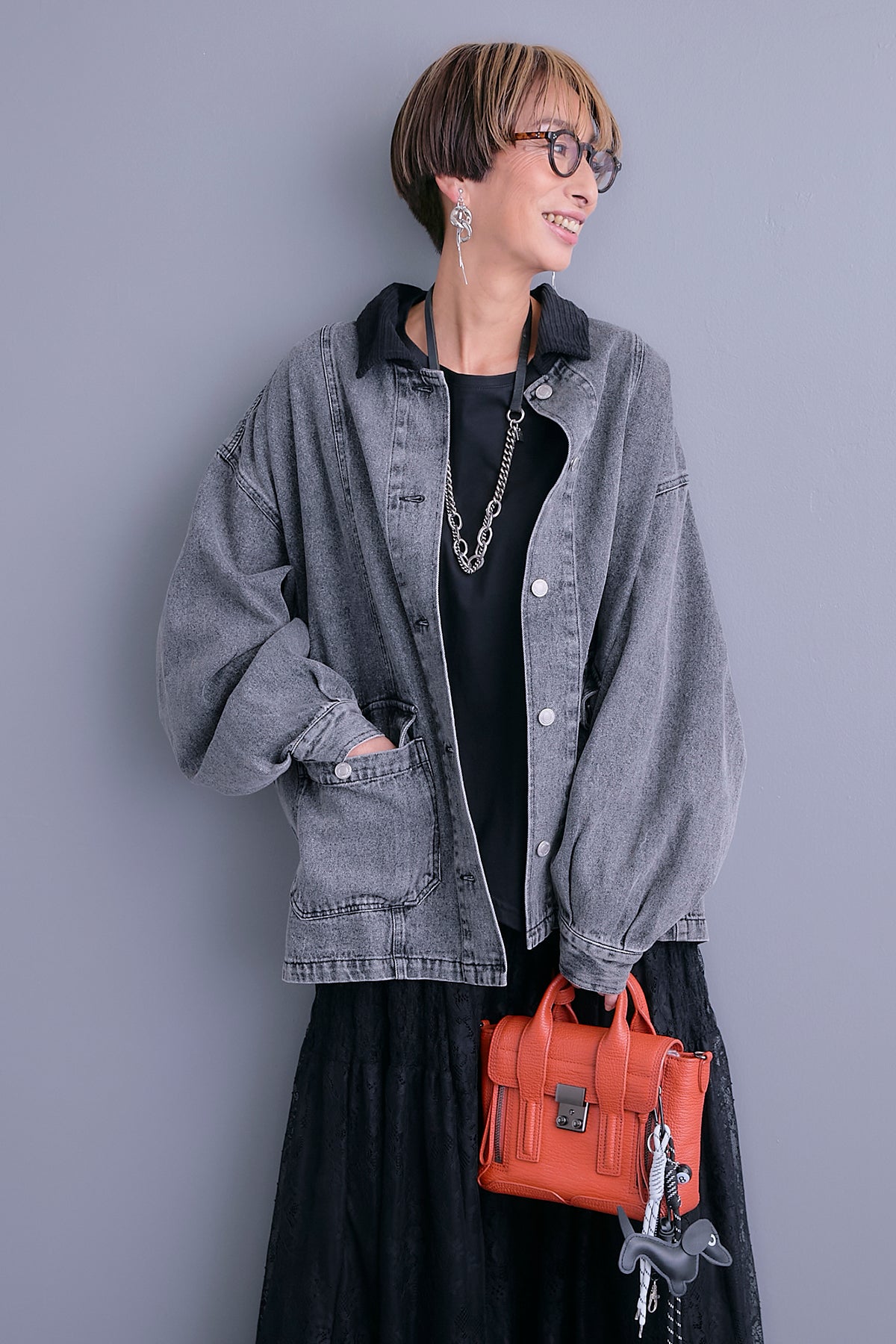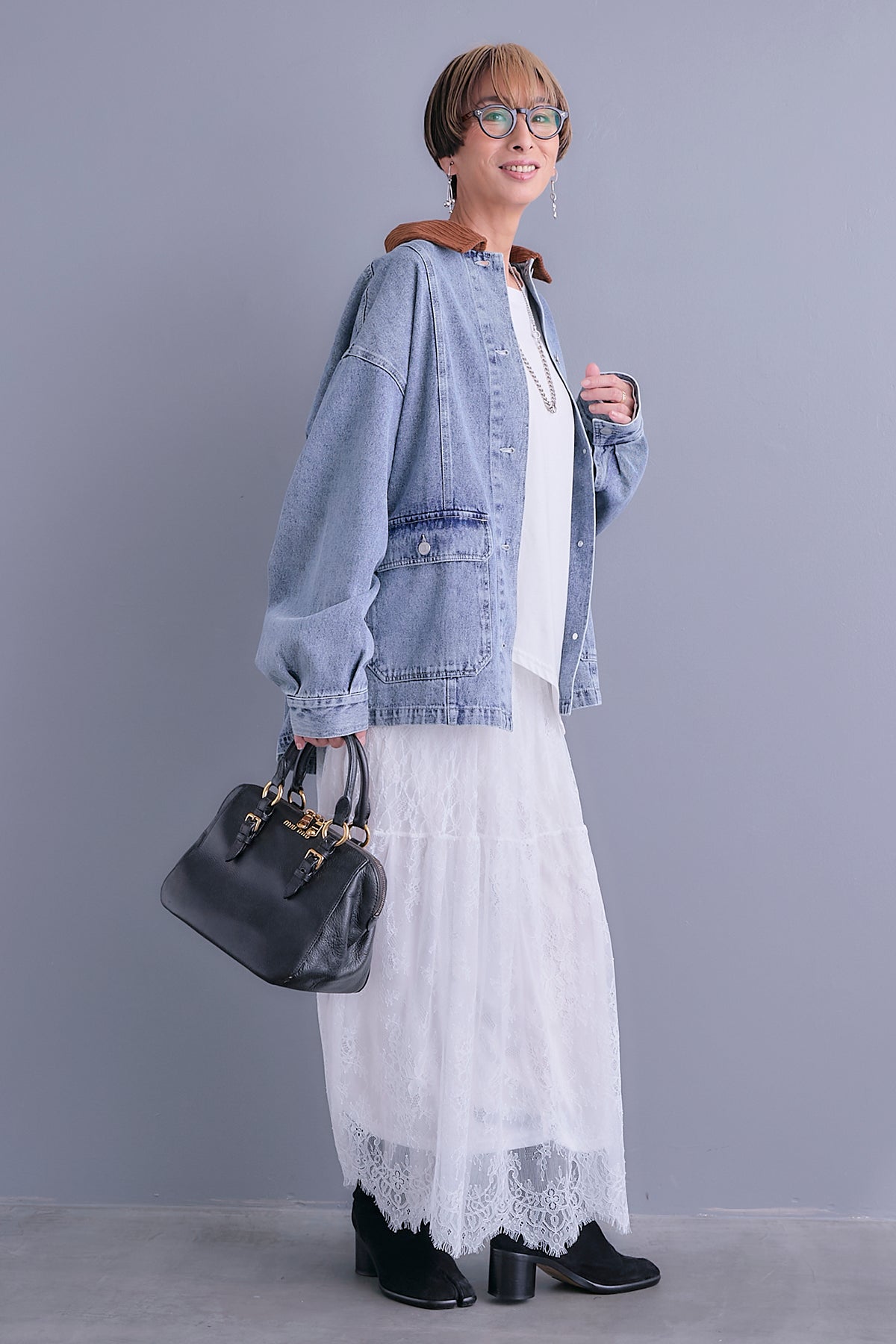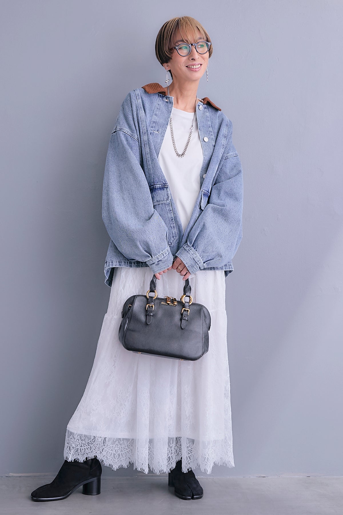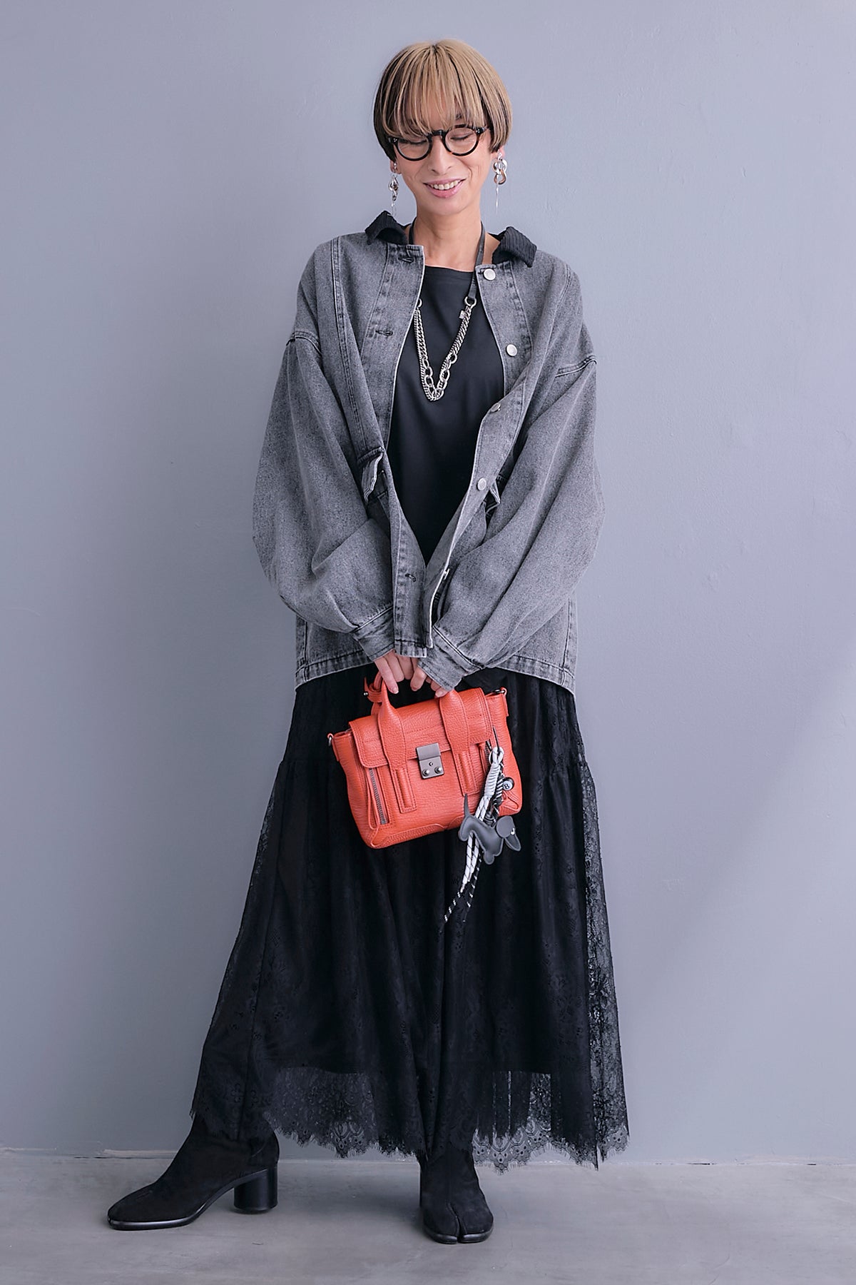 【SET】コーデュロイカラー10ozデニムジャケット+アシンメトリーロンT+アイラッシュレースロングスカート(3set)