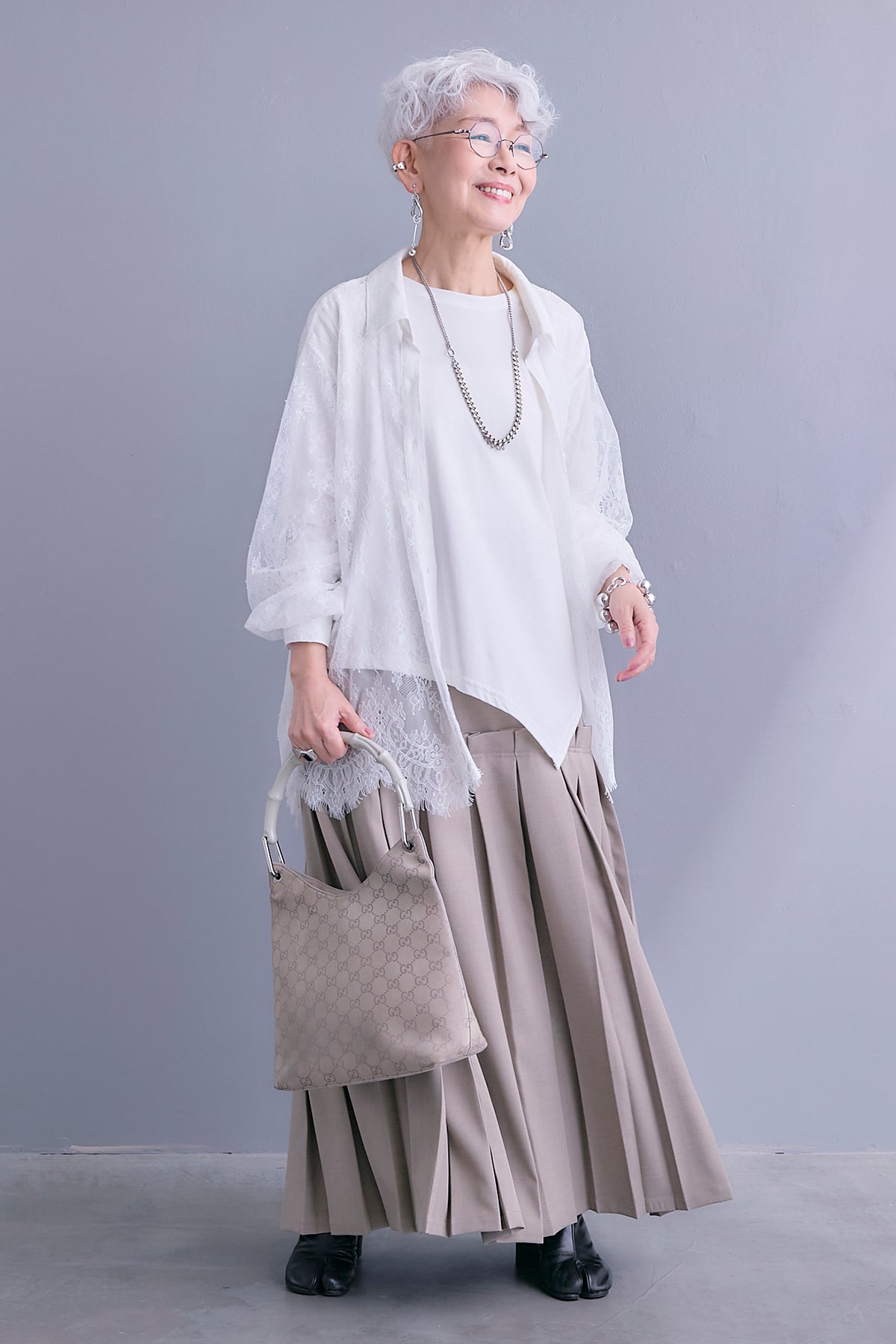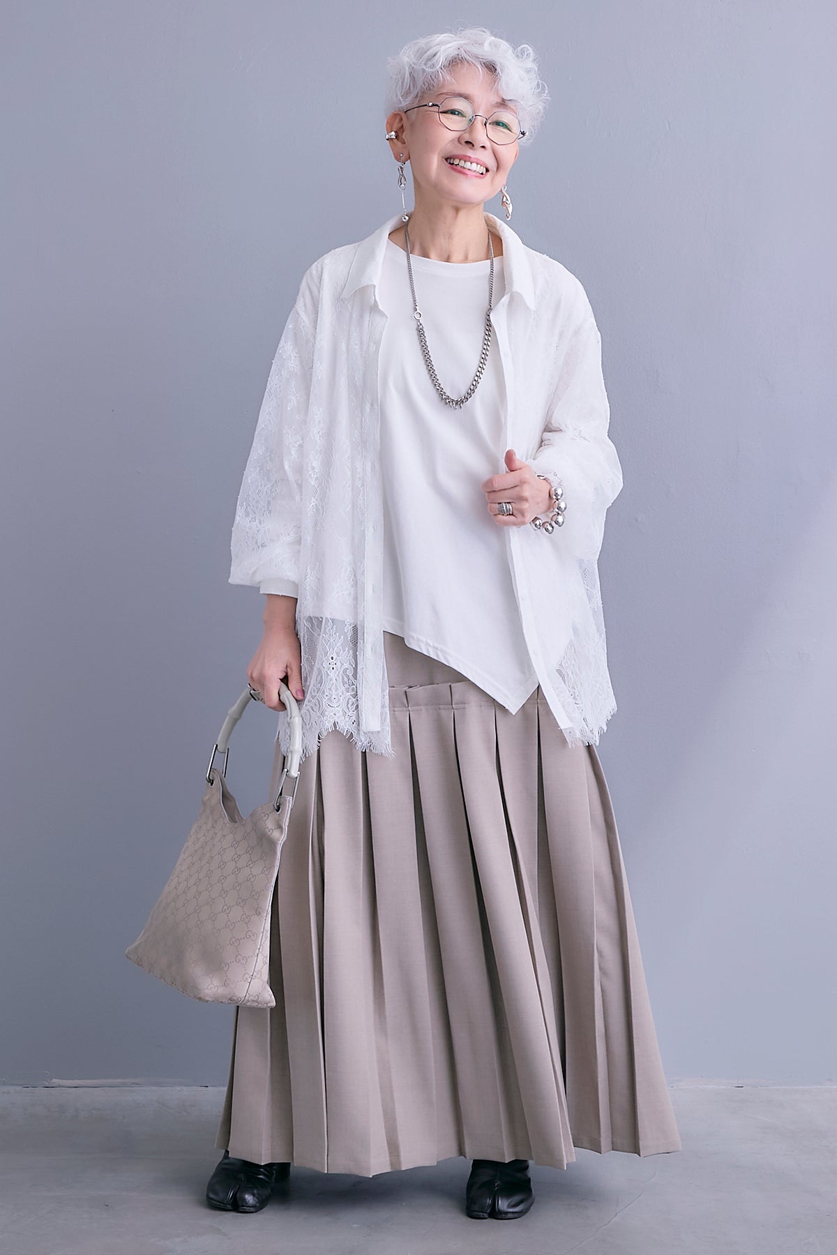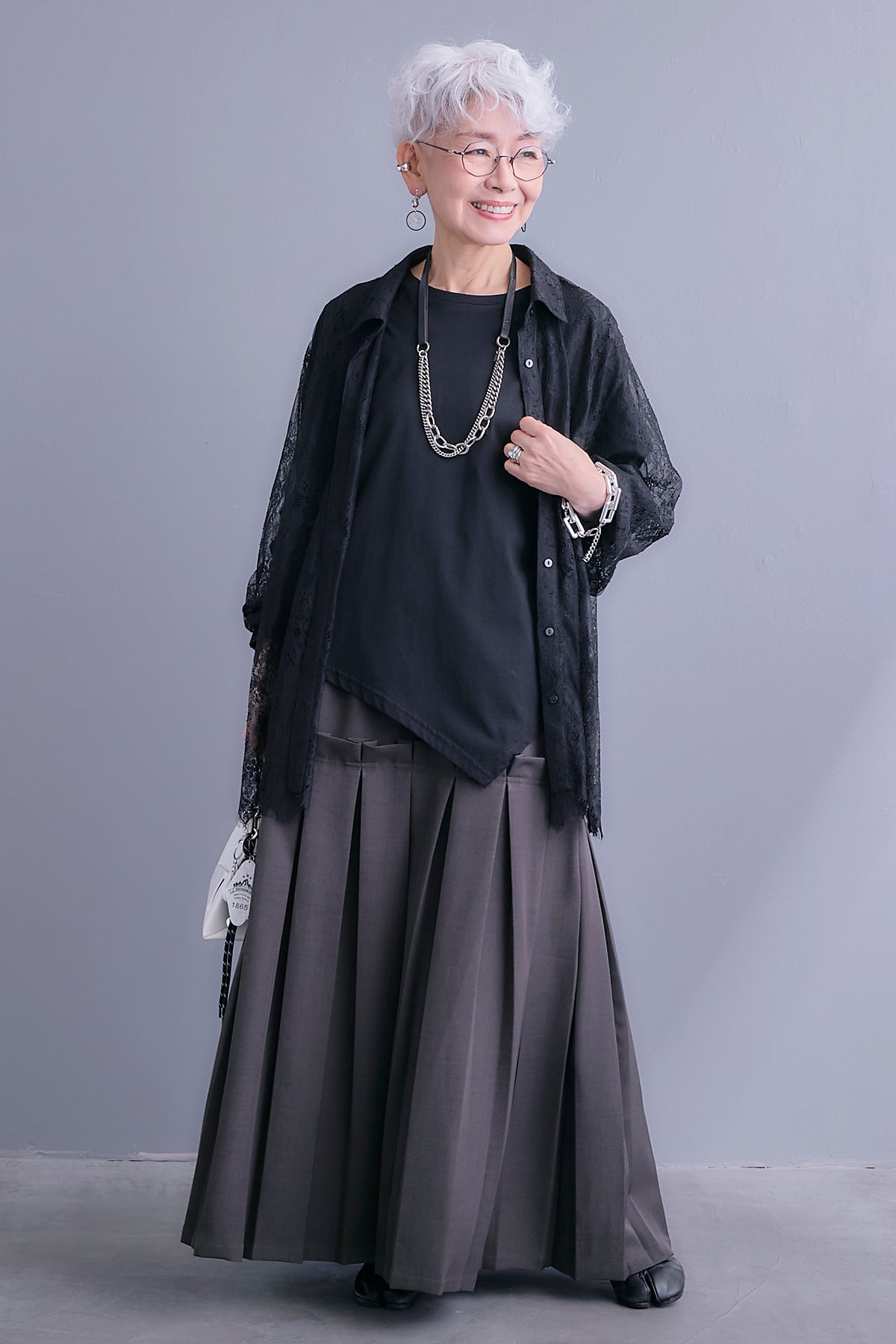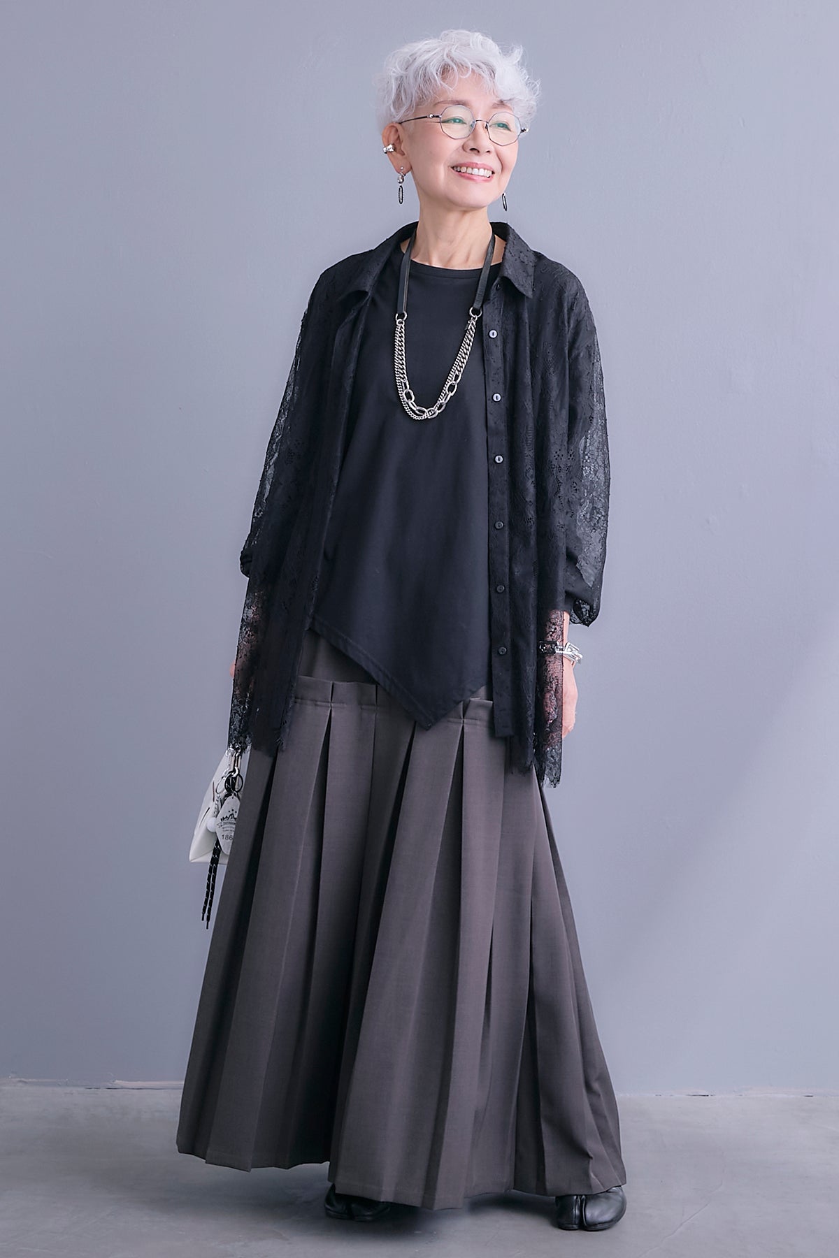【SET】アイラッシュレースボリュームスリーブシャツ+アシンメトリーロンT+ボックスプリーツロングスカート(3set)