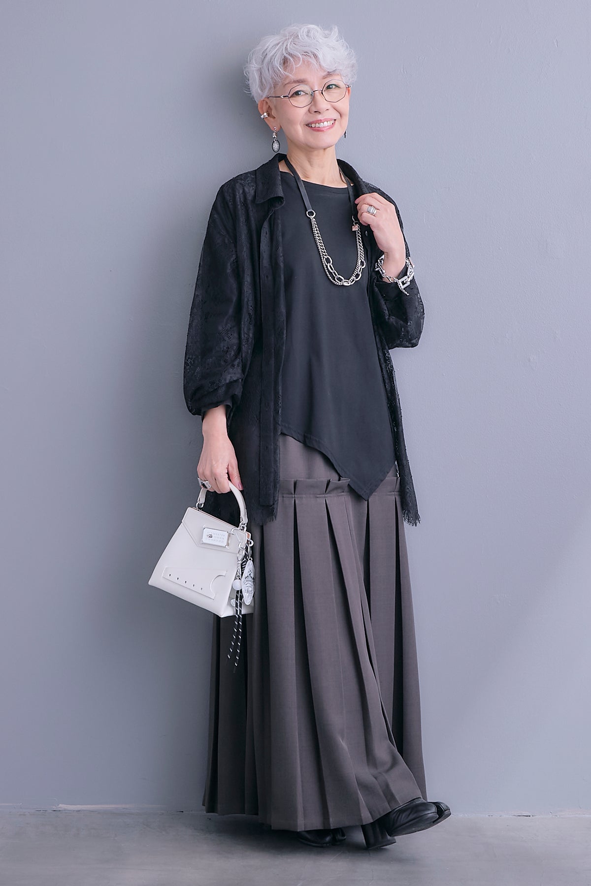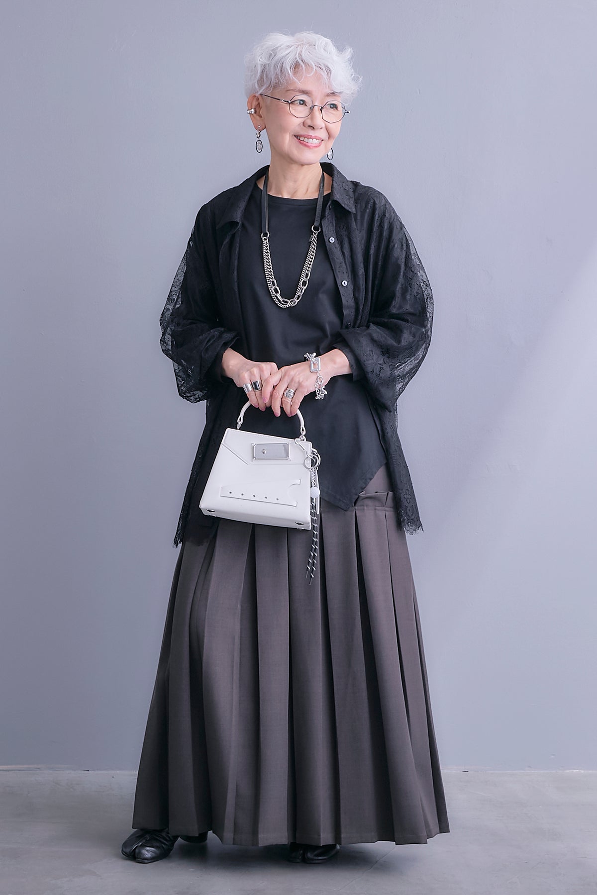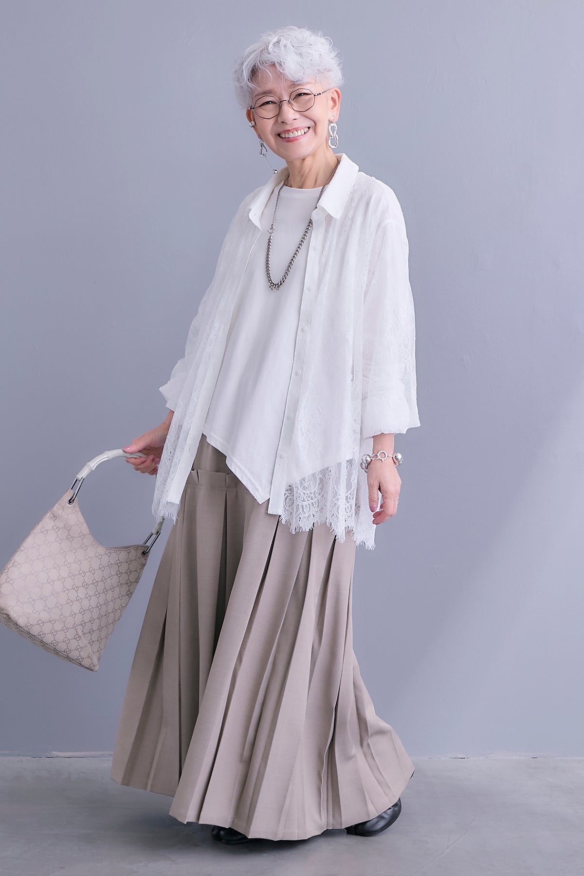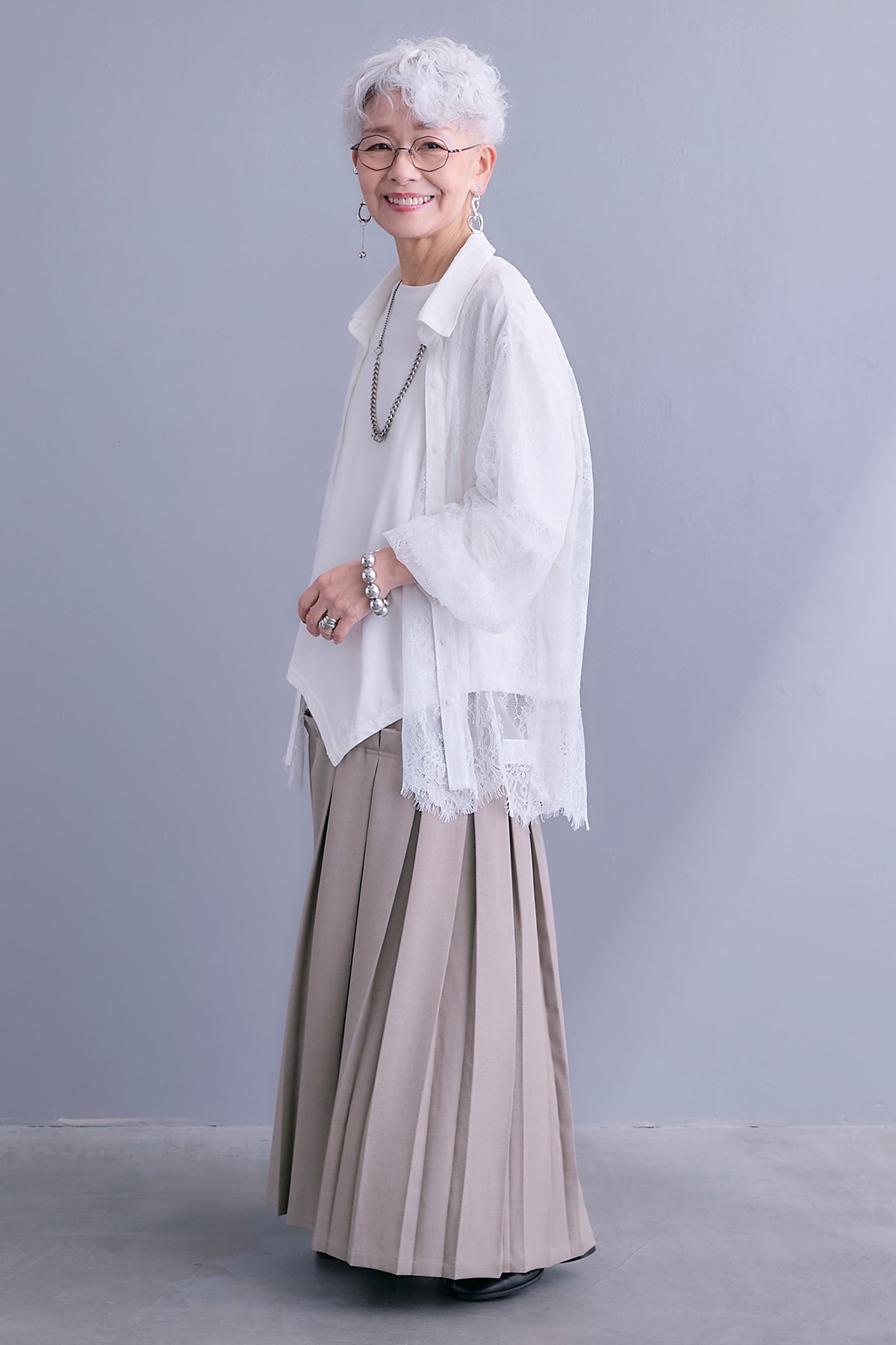 【SET】アイラッシュレースボリュームスリーブシャツ+アシンメトリーロンT+ボックスプリーツロングスカート(3set)