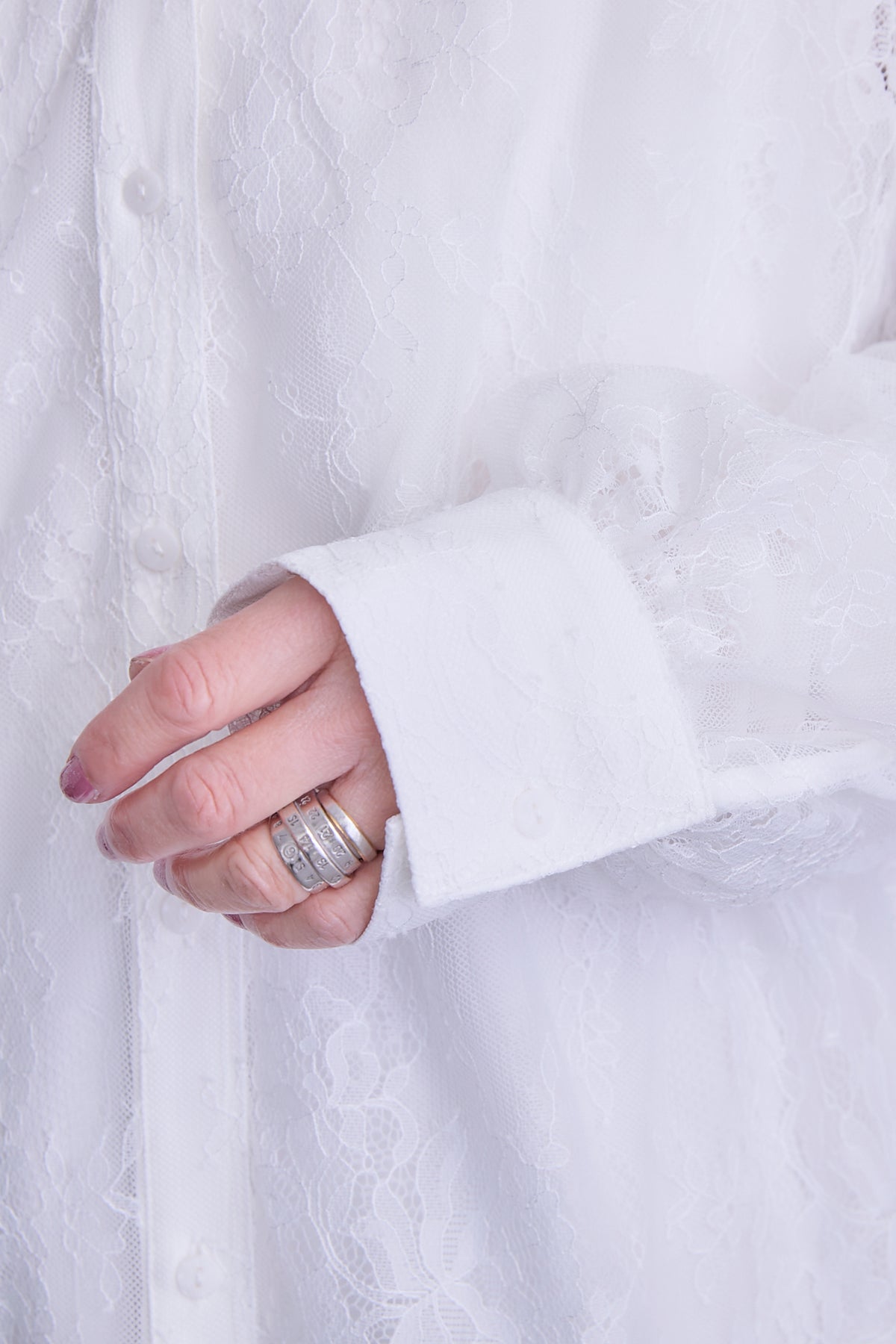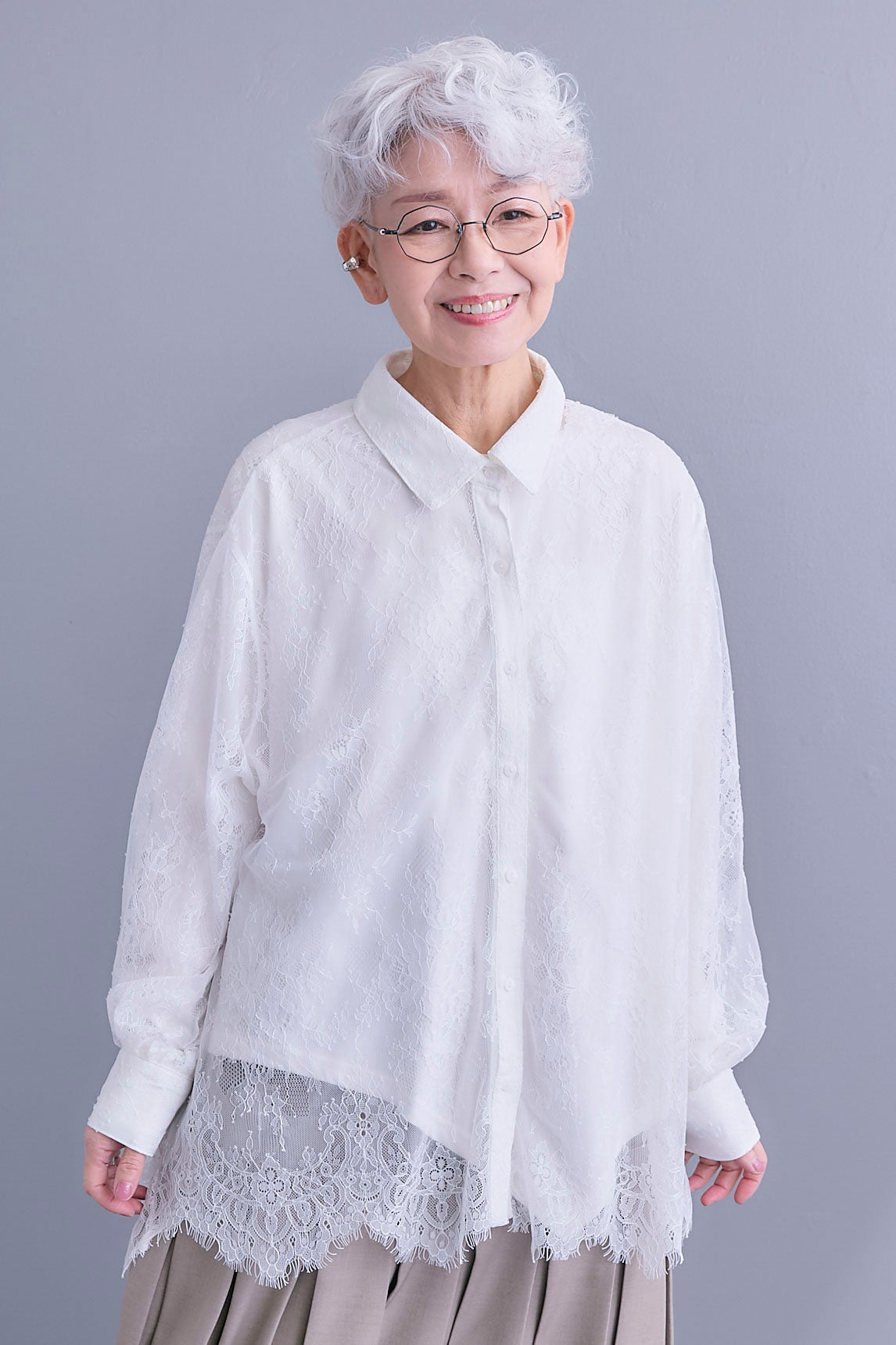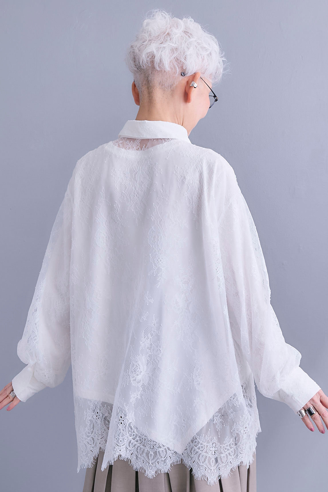 繊細なアイラッシュレースを贅沢に重ねたボリュームスリーブシャツ。程よい透け感がレイヤードに奥行きを与え、軽やかな印象に仕上がります。袖に分量を持たせつつ、身頃はすっきりとまとめたバランスで、甘さを抑えた佇まいに。前開き仕様で羽織りとしても活躍し、インナー次第で表情が変わる一枚。日常のスタイリングに自然な変化を加えてくれます。