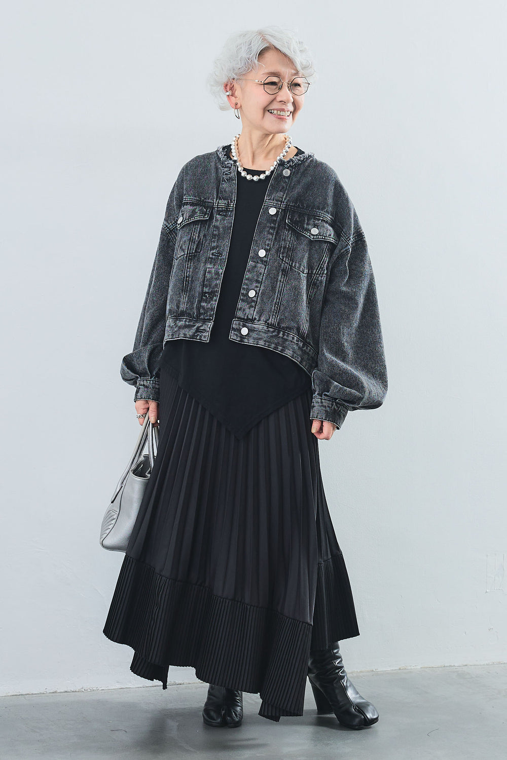 【SET】アシンメトリーロンT+ボリュームスリーブノーカラーデニムジャケット+アシンメトリープリーツスカート(3set)