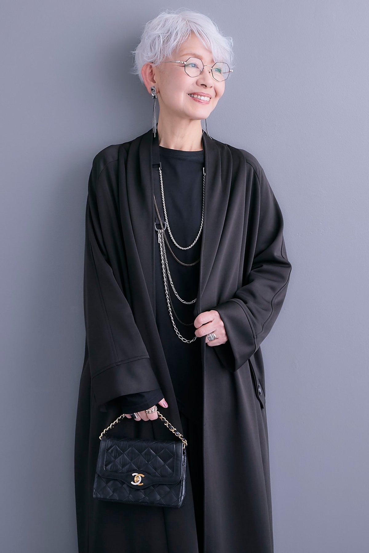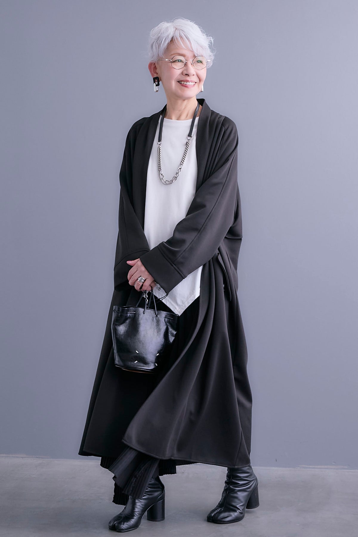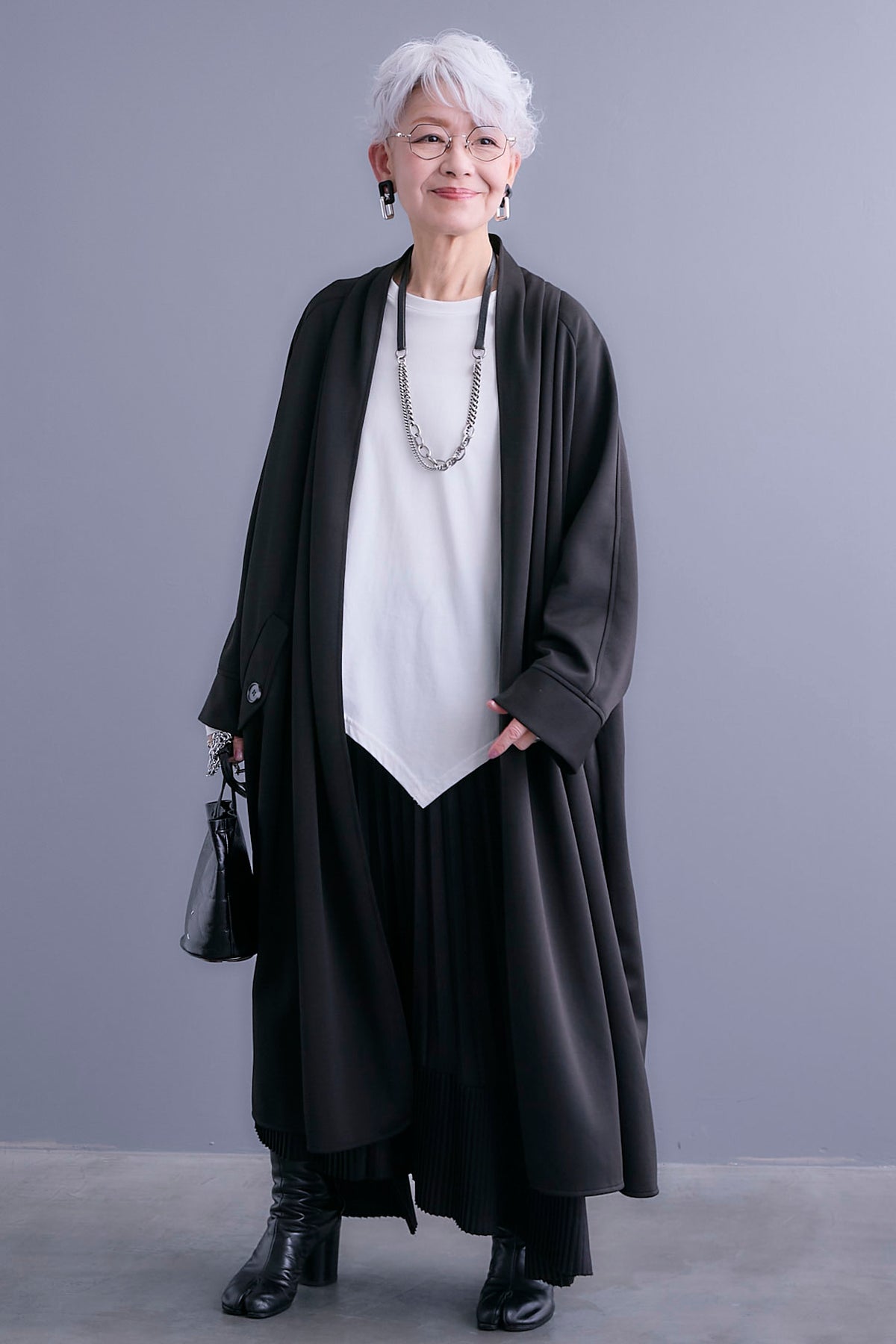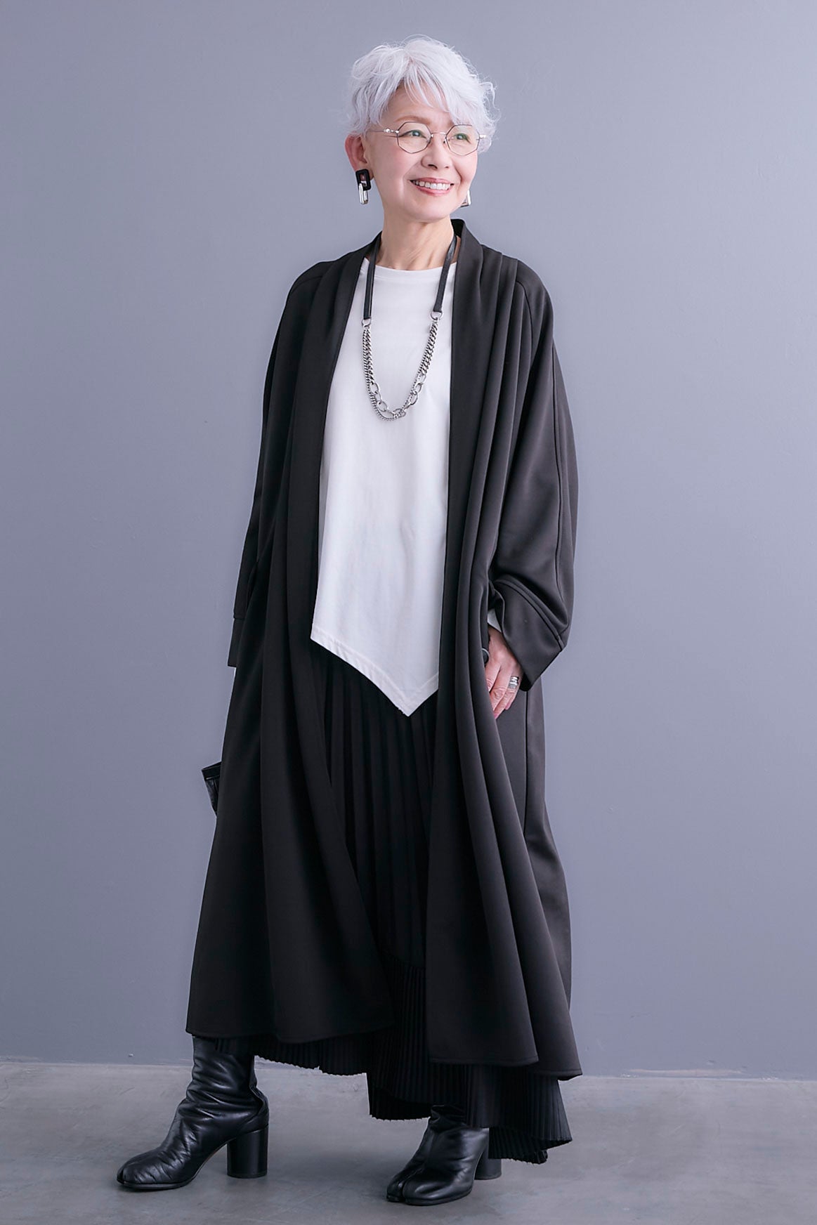 軽やかな落ち感が魅力のノーカラーワイドロングカーディガン。程よいゆとりのあるシルエットで体型を選ばず、シンプルなデザインながらも上品な印象を与えます。季節の変わり目や冷房対策の羽織としても活躍し、デイリーからオフィスまで幅広く使える一枚です。