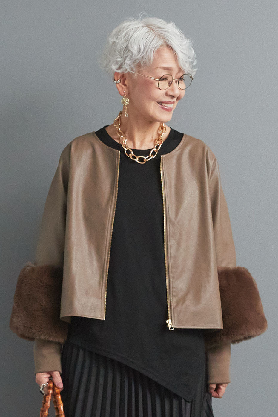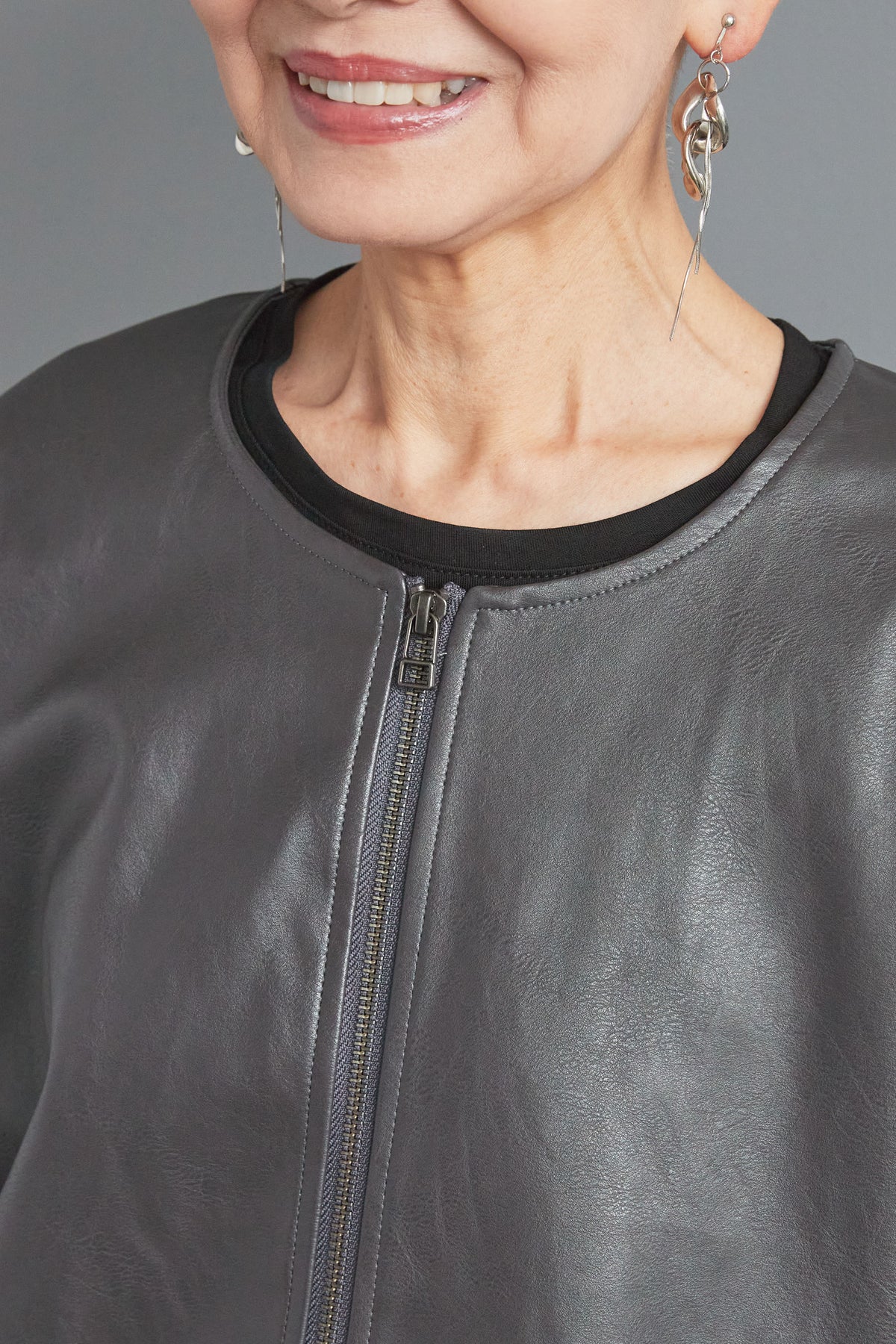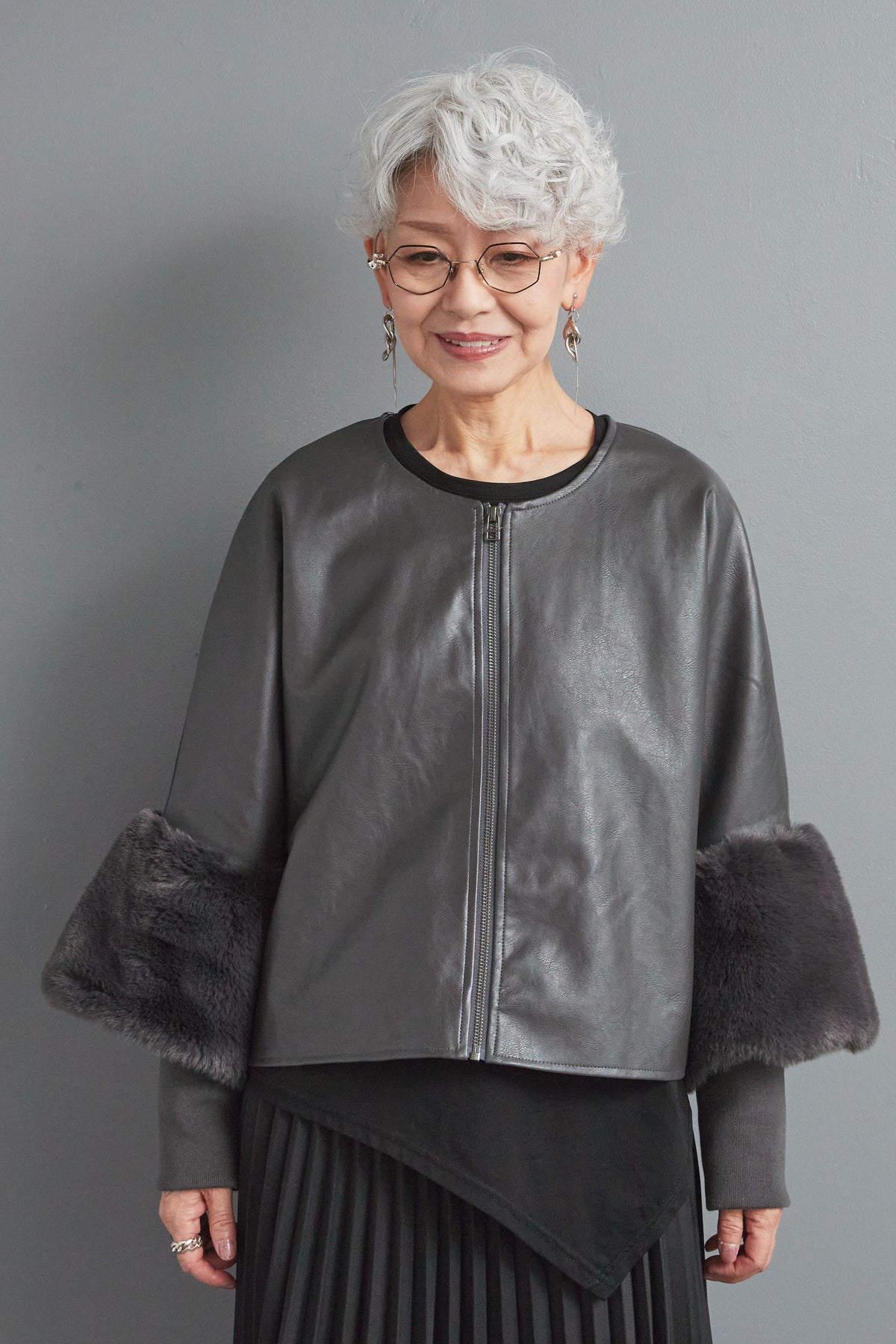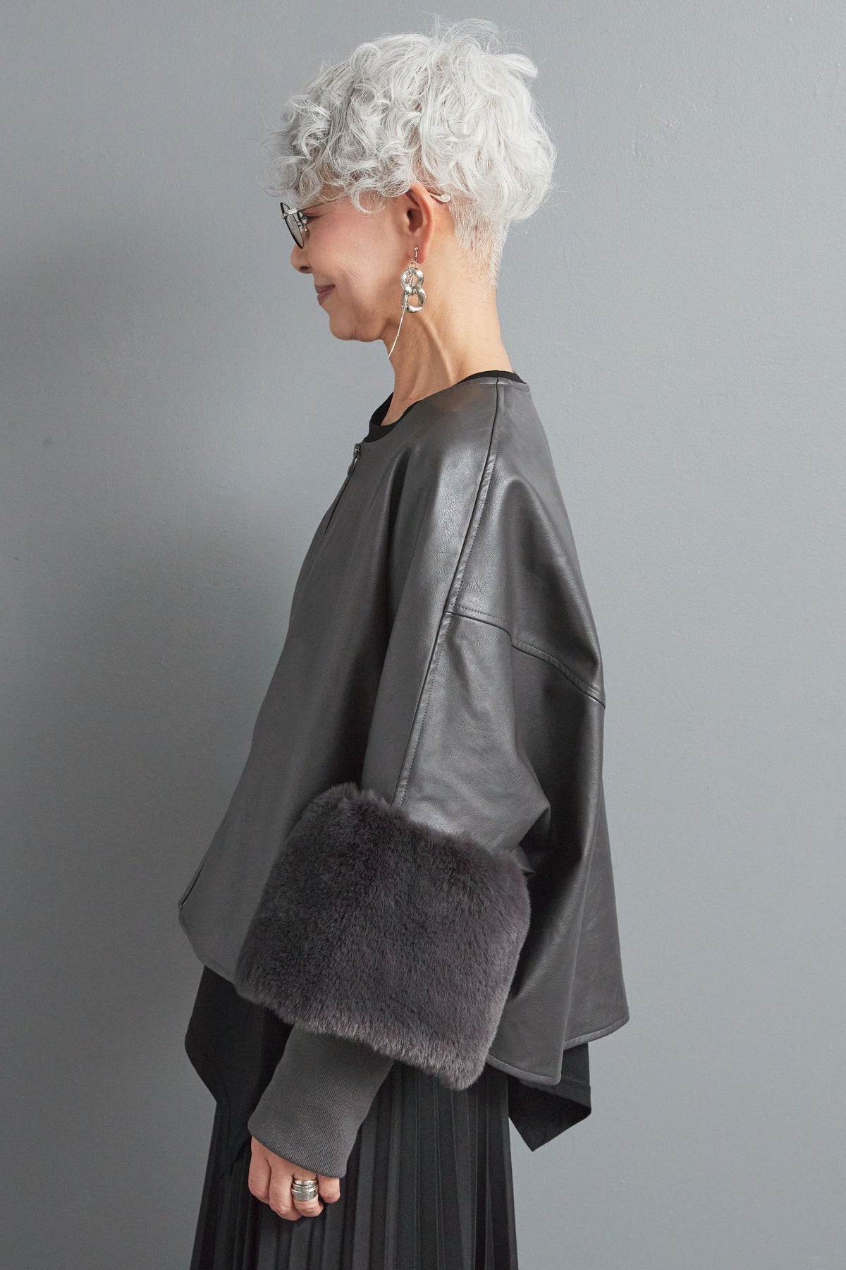 柔らかなエコレザーを使用したノーカラージャケット。袖口にふんわりとあしらわれたファーが華やかなアクセントを添えます。ゆったりとしたドルマンスリーブが抜け感を演出し、軽やかな着心地も魅力。デイリーから特別なお出かけまで幅広く活躍する上品な一枚です。