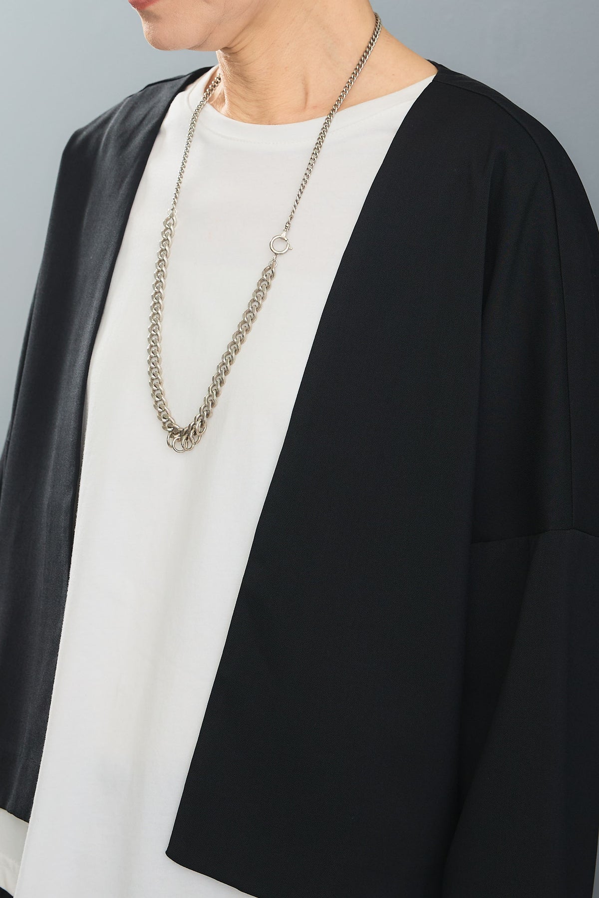 洗練されたノーカラーデザインが魅力のショートジャケット。ドッキング仕様で立体感をプラスし、羽織るだけでこなれた印象に仕上がります。ショート丈がウエスト位置を高く見せ、スタイルアップ効果も抜群。ワンピースやハイウエストボトムとの相性が良く、きれいめからカジュアルまで幅広く対応します。軽やかな着心地でシーズンレスに活躍する、ワードローブに取り入れたい万能ジャケットです。