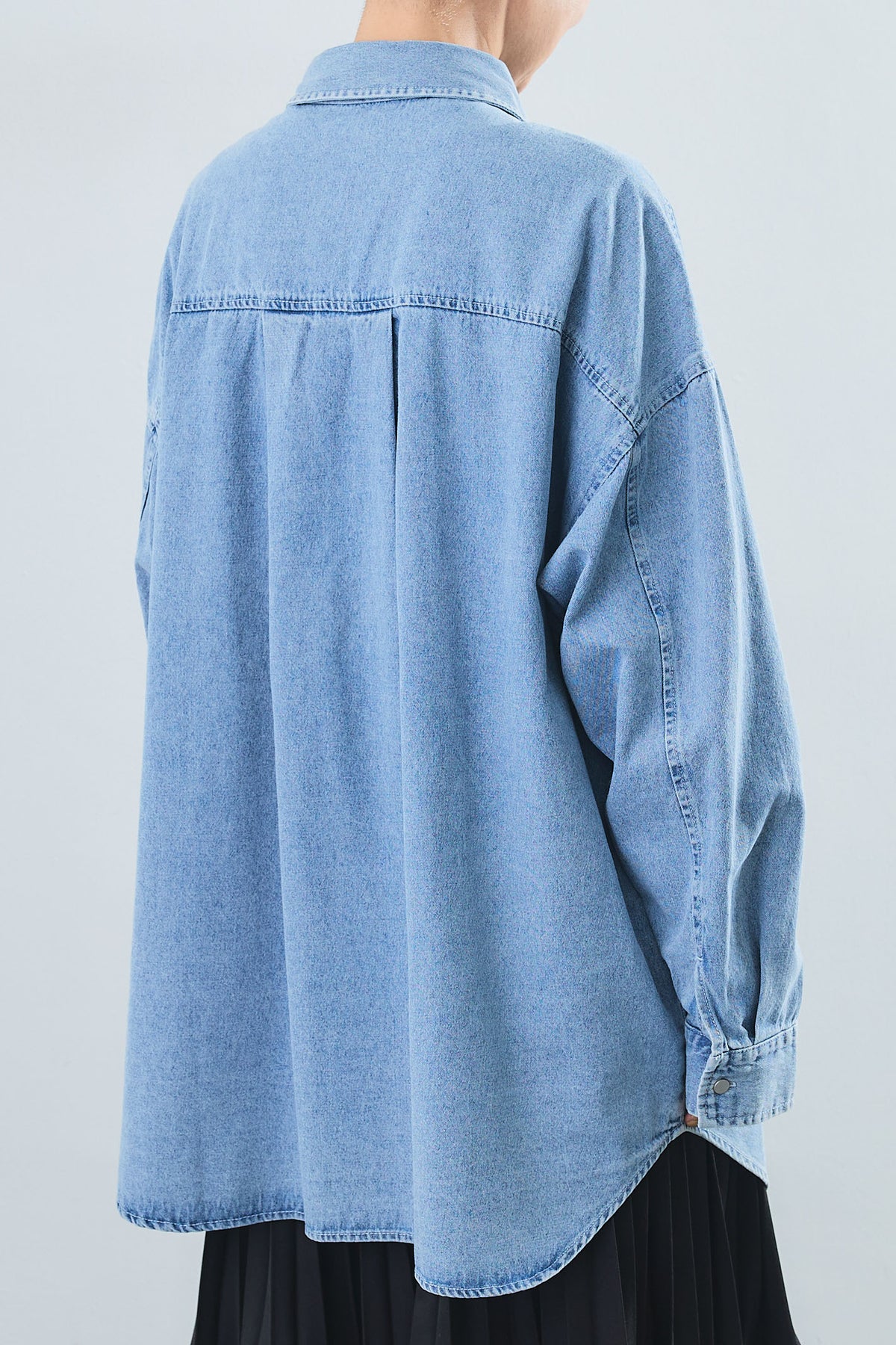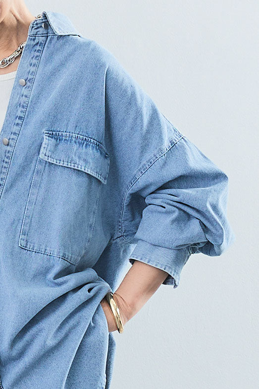 8ozオーバーサイズデニムシャツジャケットは、リラックス感のあるオーバーサイズのシルエットが特徴的なデニムシャツジャケットです。軽量で柔らかな8ozデニム素材を使用しており、春や秋のコーディネートにぴったり。シンプルながらも、フロントのスナップボタンと大きめのポケットがアクセントとなり、カジュアルな中にスタイリッシュさをプラスしています。デニムの風合いが柔らかく、さまざまなコーディネートに合わせやすいアイテムです。軽い羽織りとしても使える万能ジャケットです。