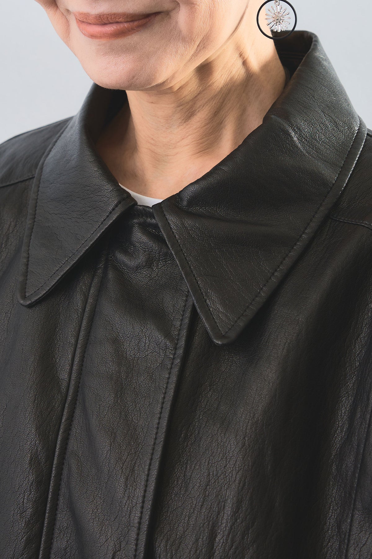 ヴィンテージグロッシーエコレザージャケットは、光沢感のあるヴィンテージ風エコレザーを使用したジャケットで、程よくハードな印象を与えつつも女性らしいシルエットに仕上げています。フロントのジップデザインやポケットディテールがアクセントになり、カジュアルにもモードにも合わせやすい一着です。