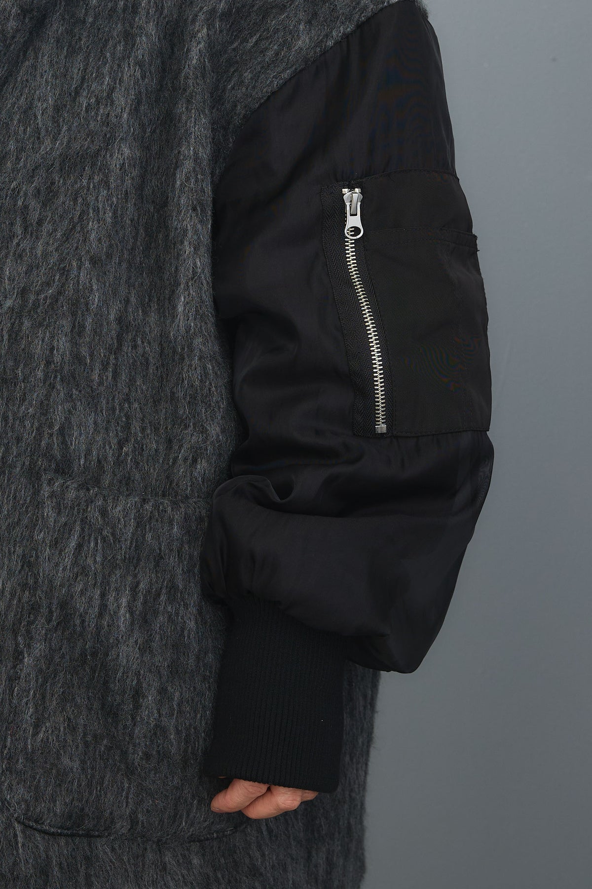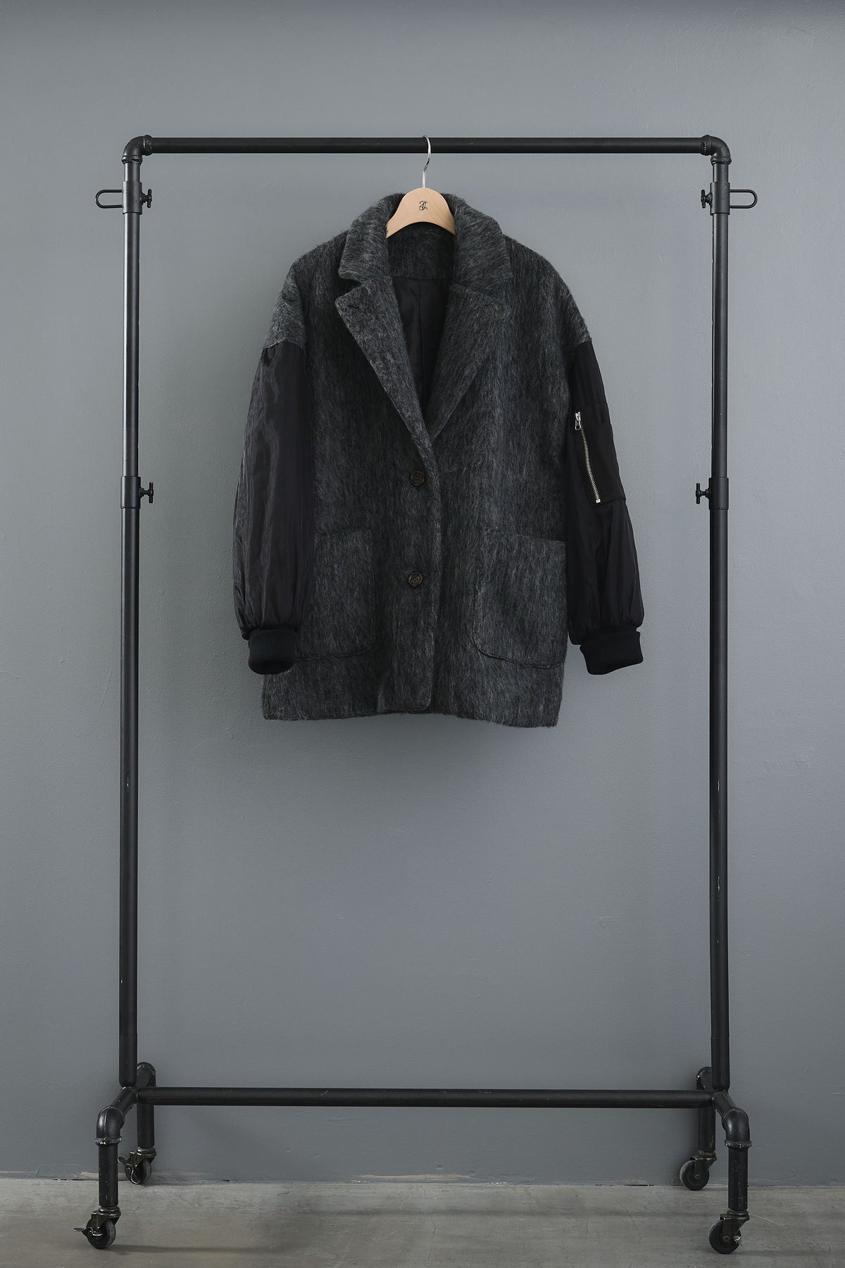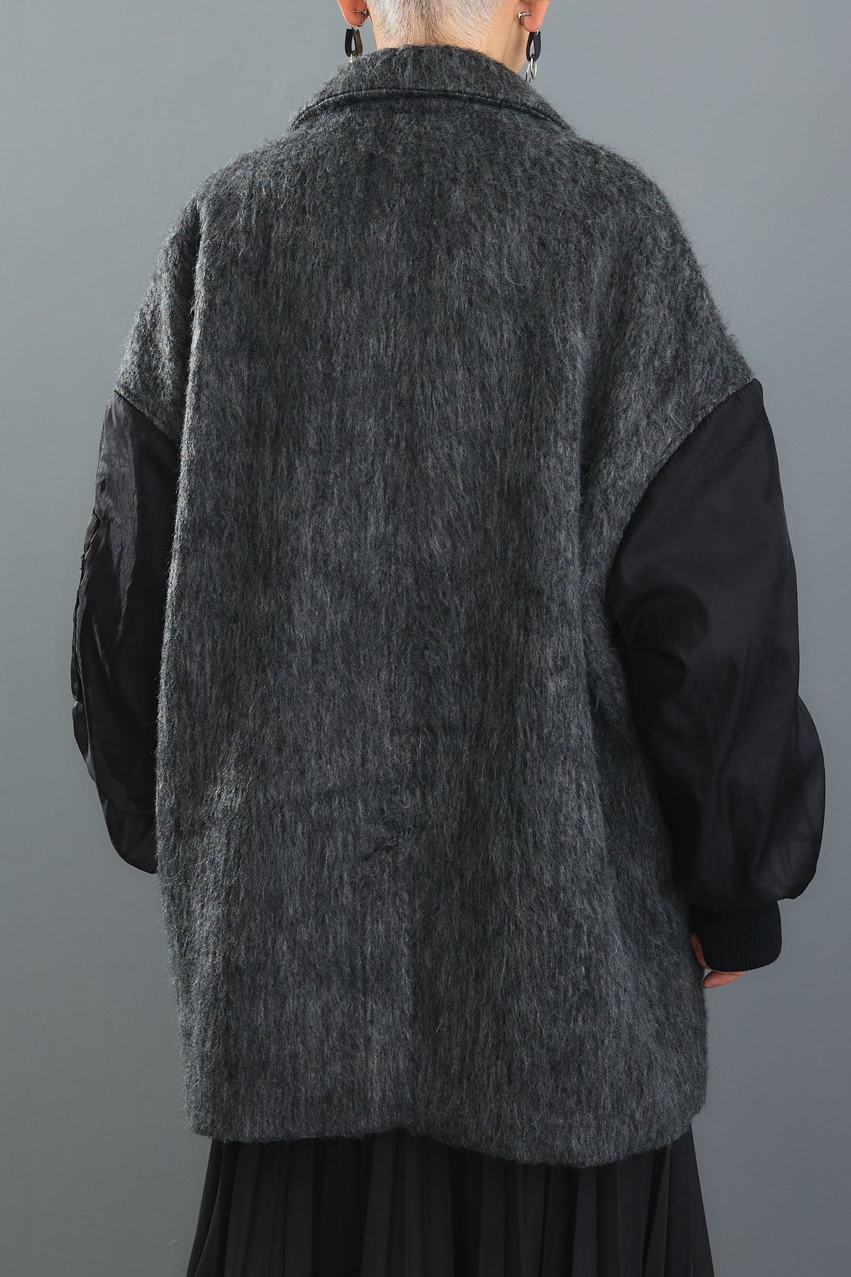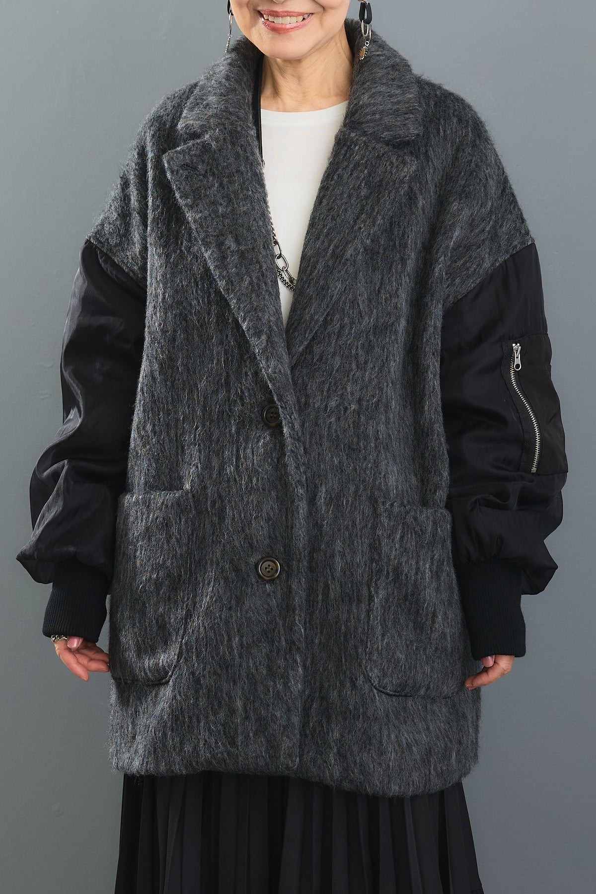 シャギー素材の温もりある風合いに、MA-1ディテールとチュールレイヤードを組み合わせたデザイン性の高いオーバーコート。程よくボリュームのあるシルエットが存在感を放ち、羽織るだけでトレンド感のあるスタイリングが完成します。異素材の組み合わせが奥行きを与え、カジュアルからモードまで幅広いコーディネートにマッチ。防寒性とデザイン性を兼ね備えた主役級アウターです。