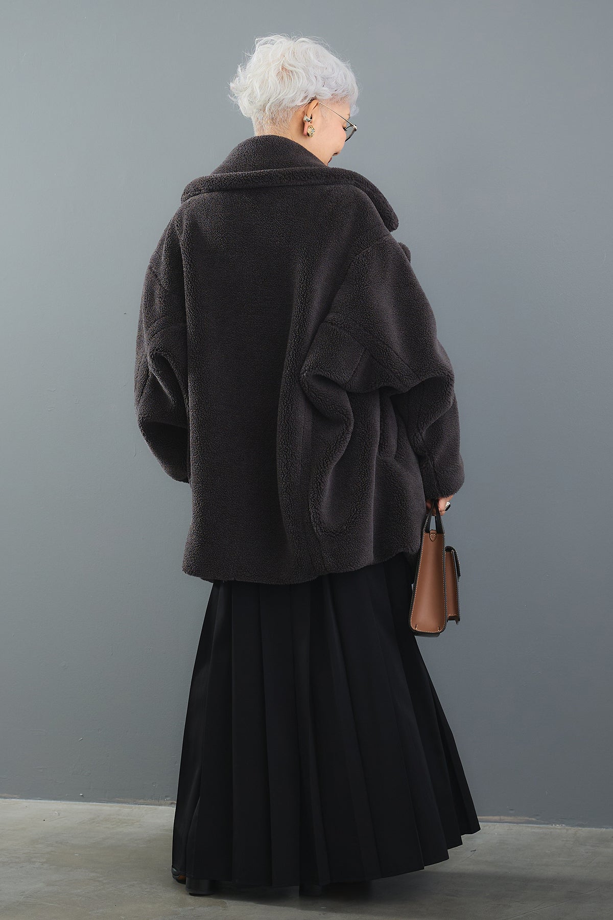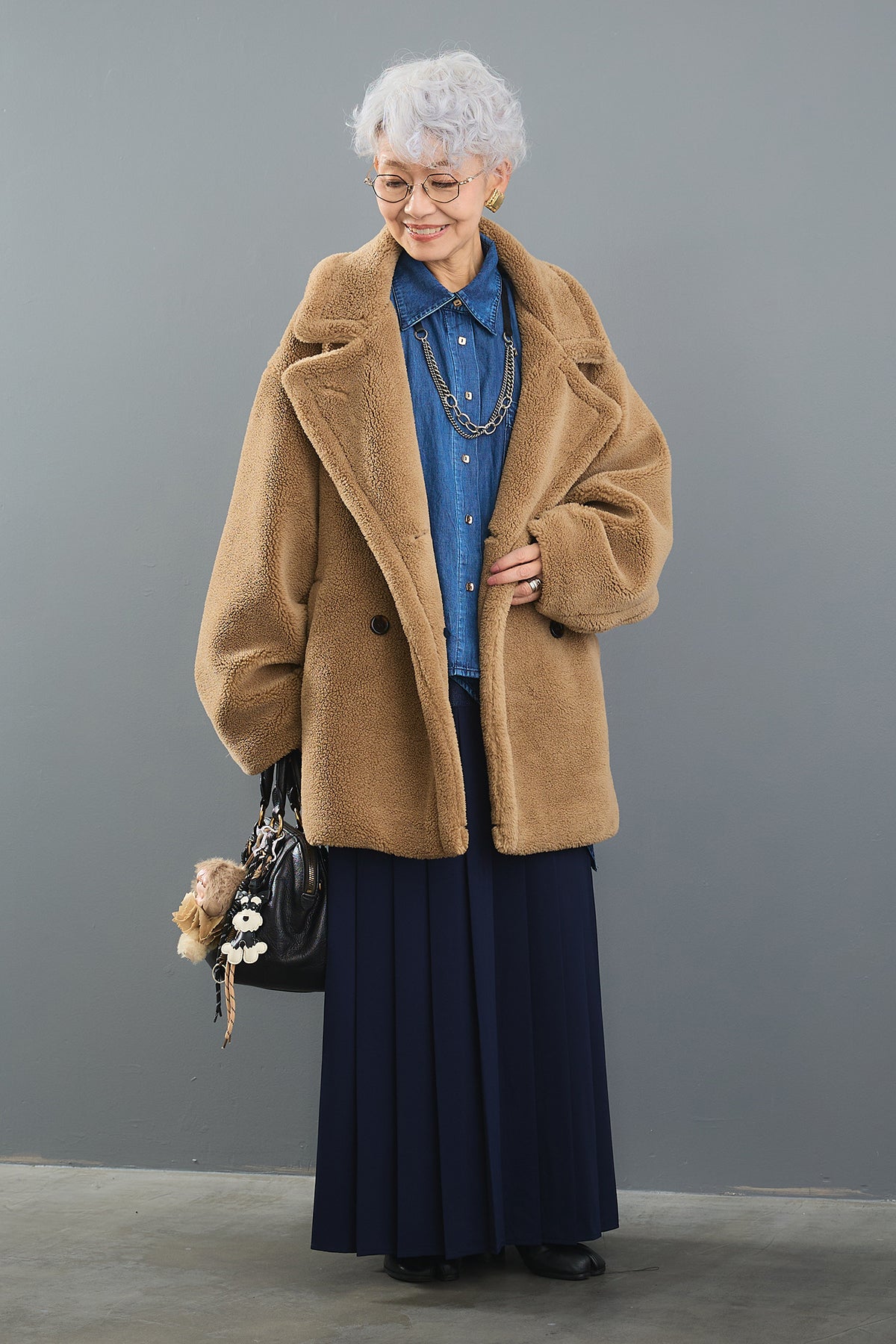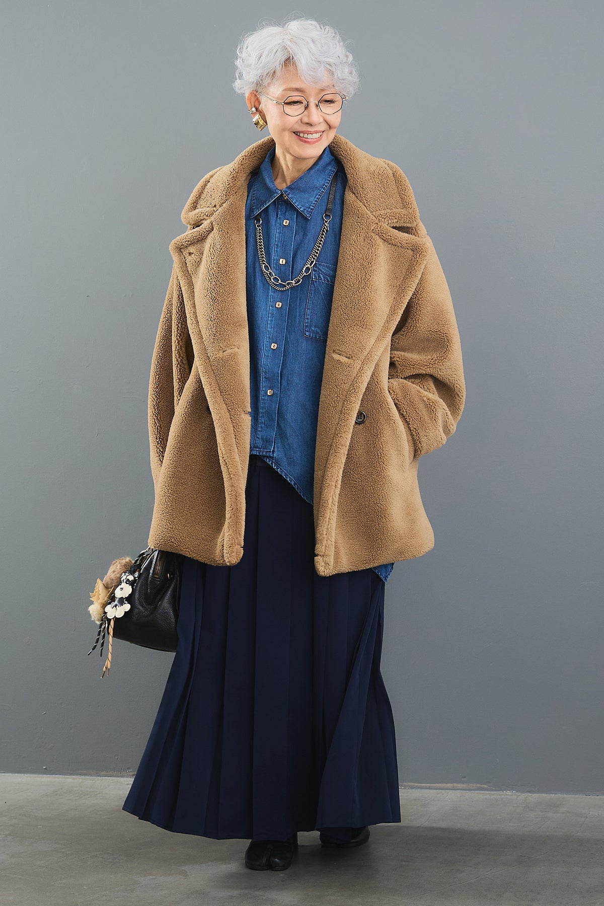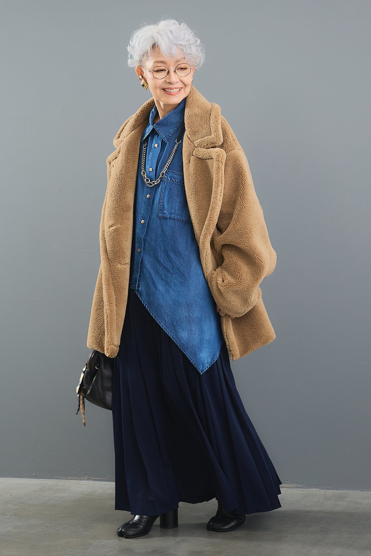 【SET】ヴィンテージアシンメトリーデニムシャツ+テディボアミディコート+デニムドッキングプリーツスカート(3set)