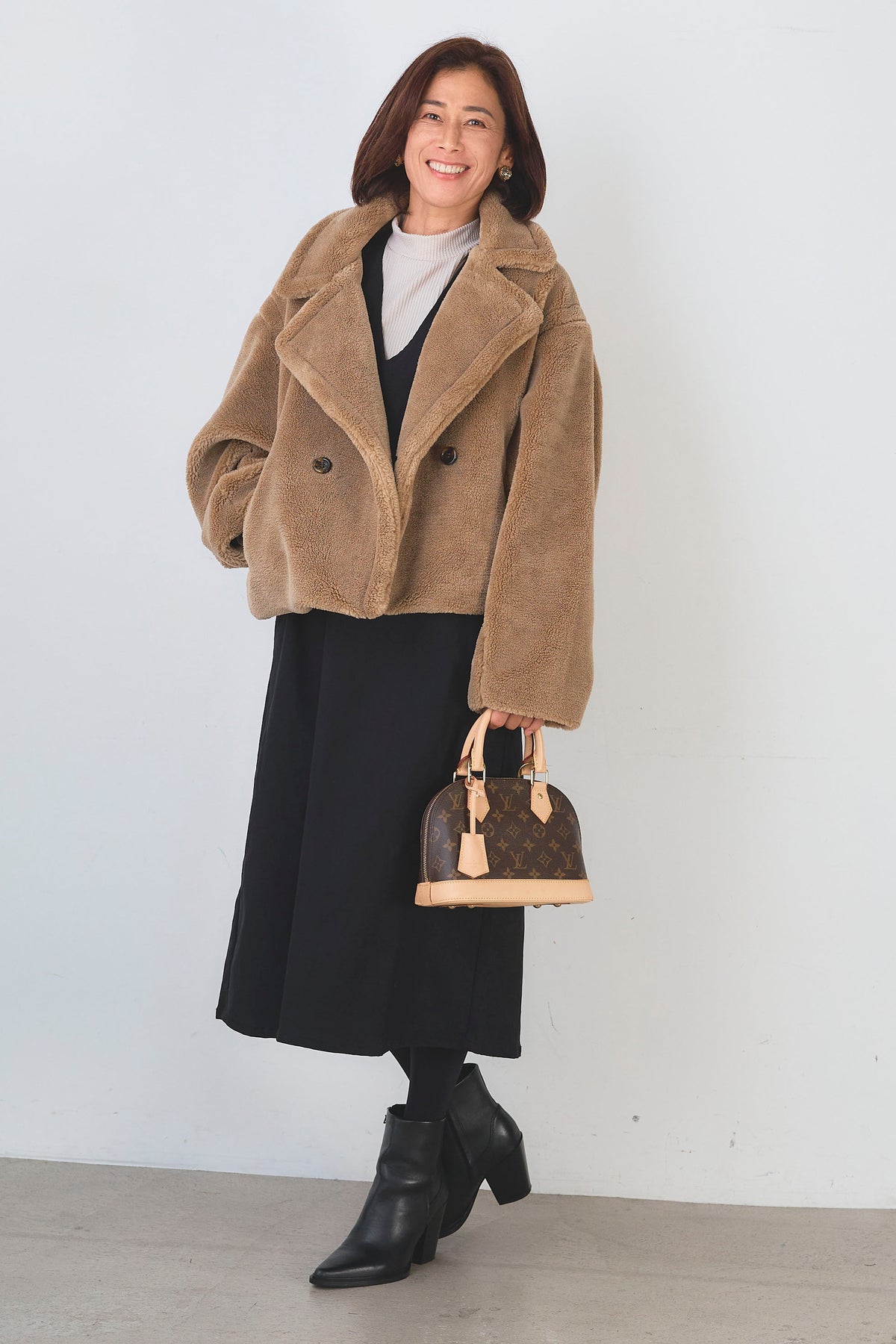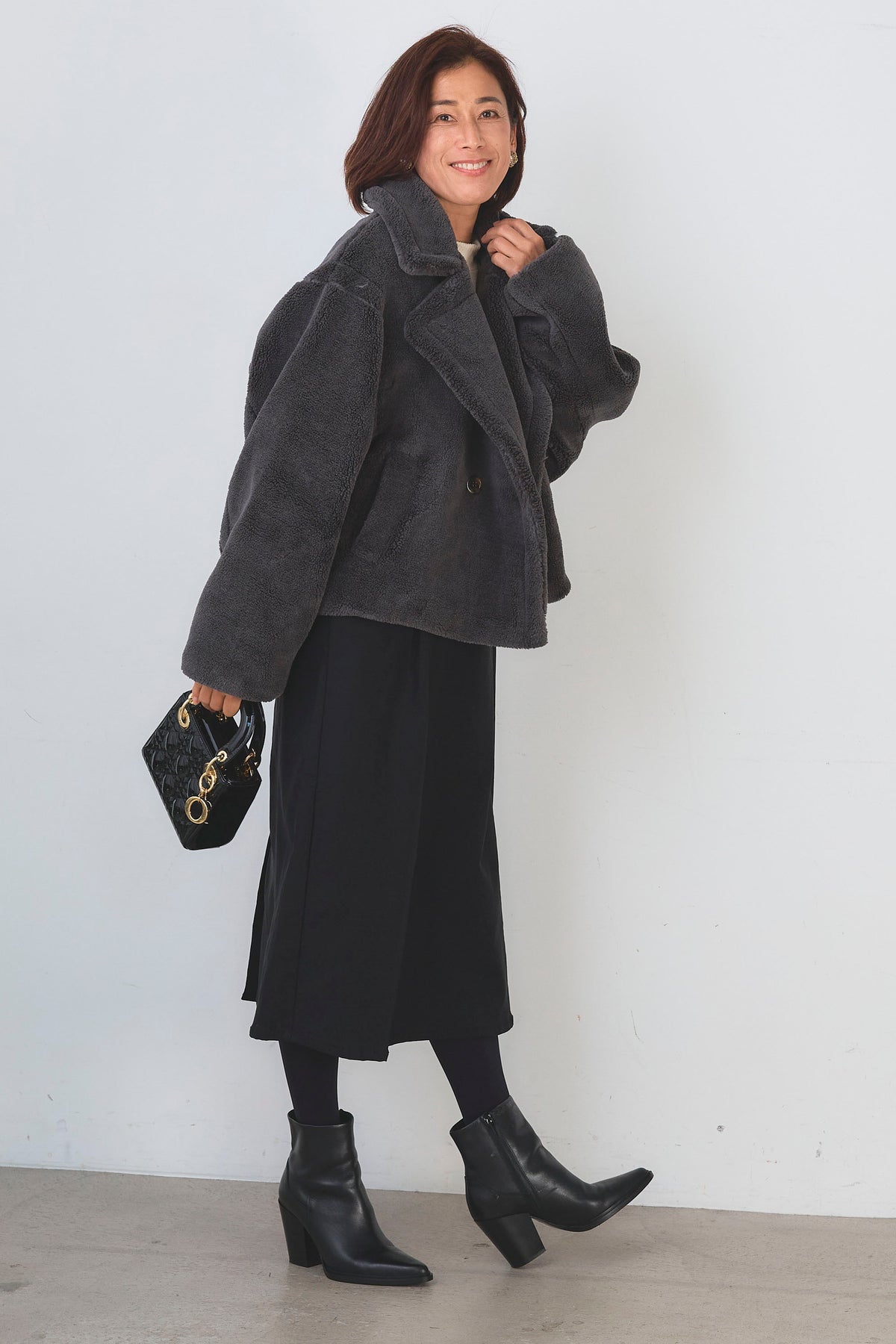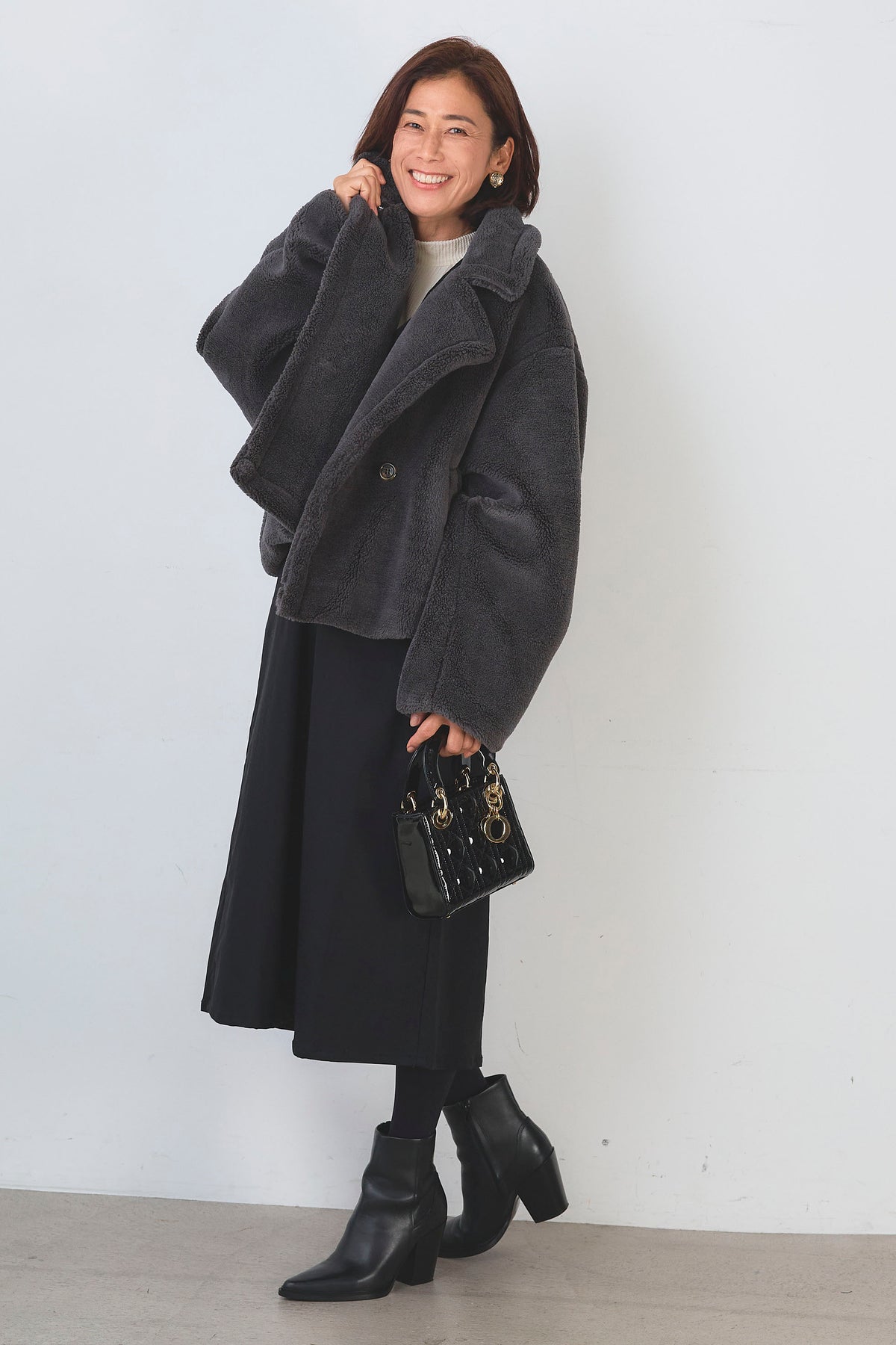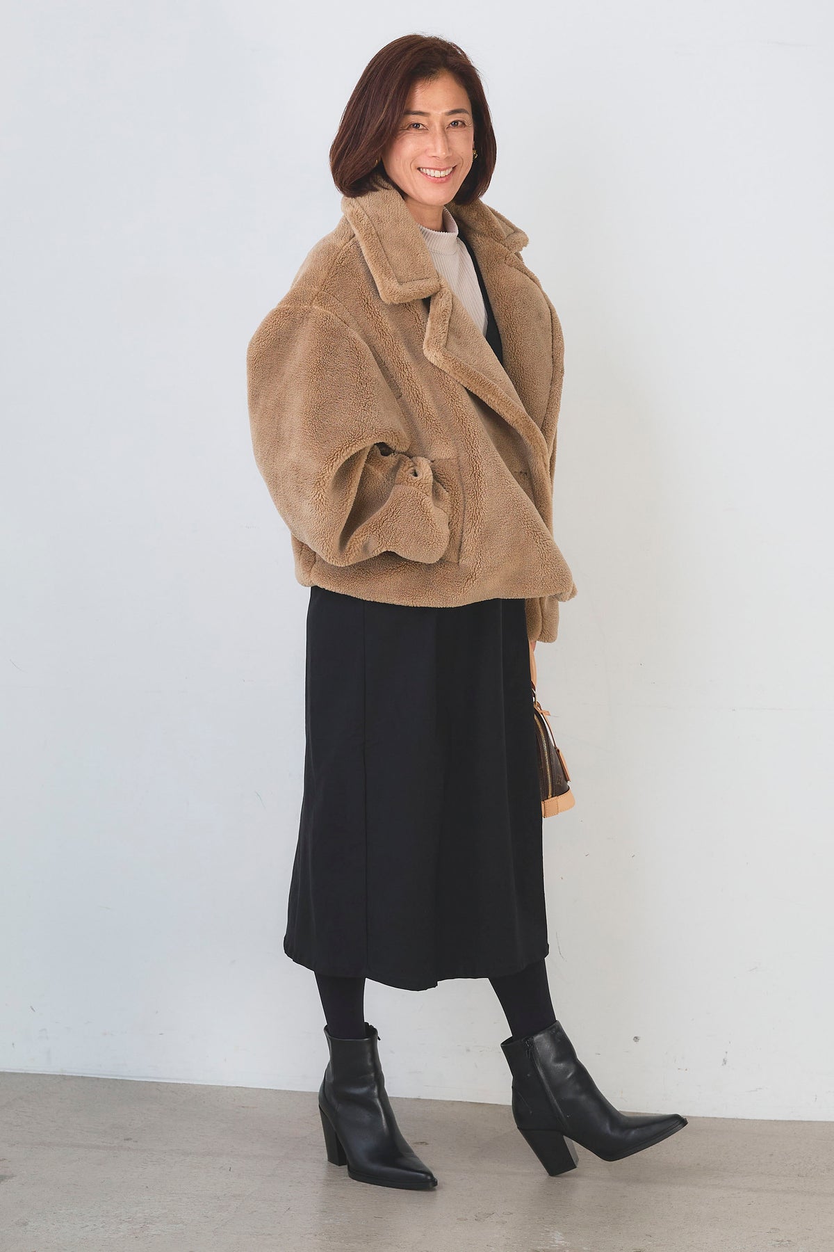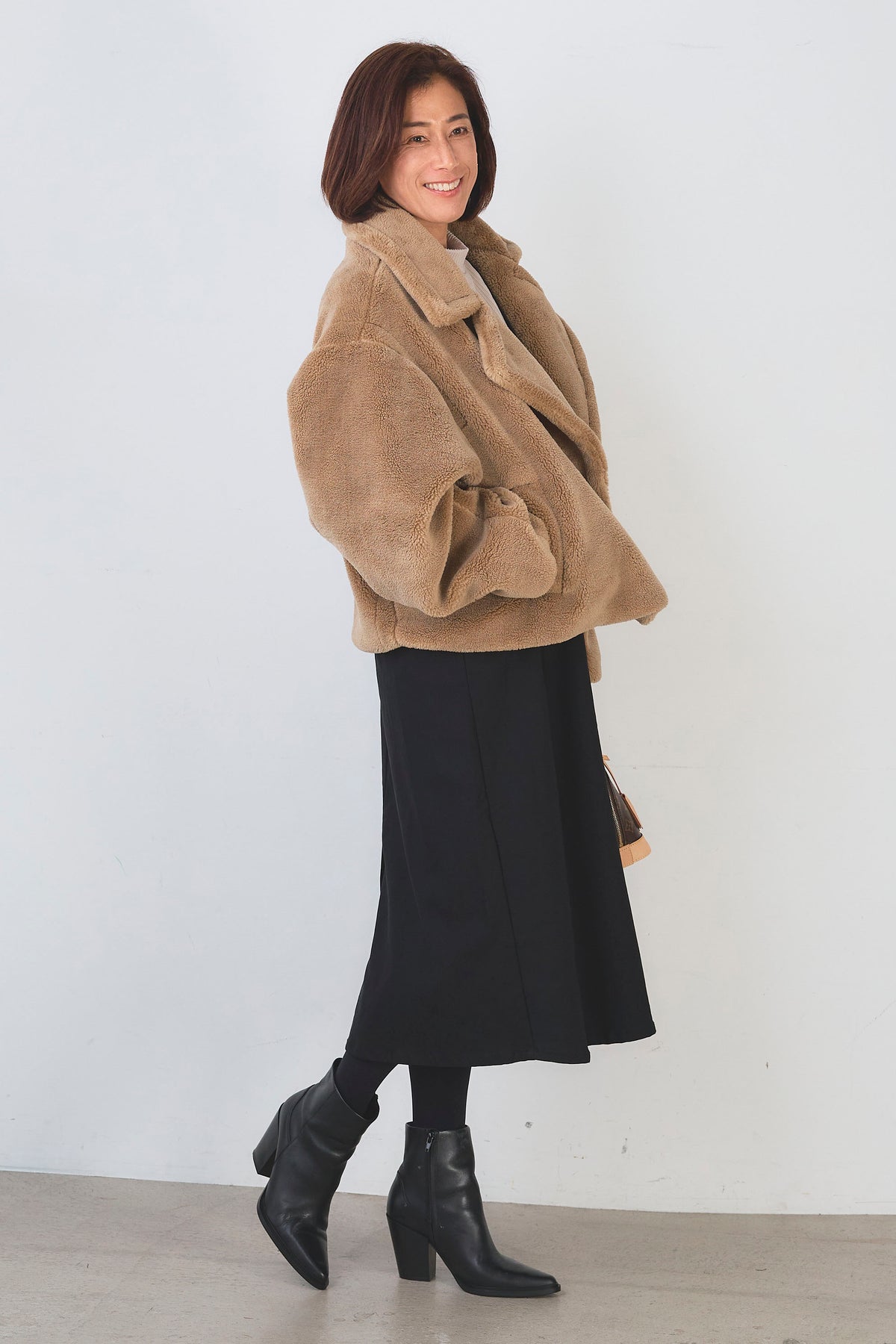 裏起毛ジャンスカとストレッチジャガードリブハイネックトップスに、テディボアショートコートを加えたコーディネートは、暖かさと洗練さを両立したスタイルです。ジャンスカのシンプルで美しいラインに、ハイネックトップスが程よいアクセントを添えています。さらに、テディボアショートコートがボリューム感とトレンド感をプラスし、全体を柔らかでリッチな印象に仕上げています。足元にはブラックのショートブーツを合わせ、季節感とモード感を演出。コンパクトなバッグがスタイリングのアクセントとなり、洗練された大人のカジュアルを引き立てます。