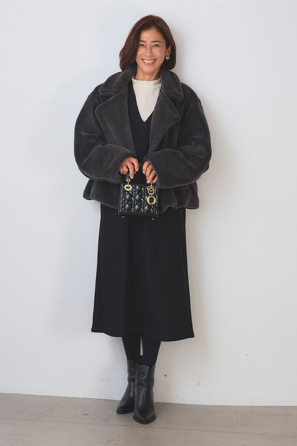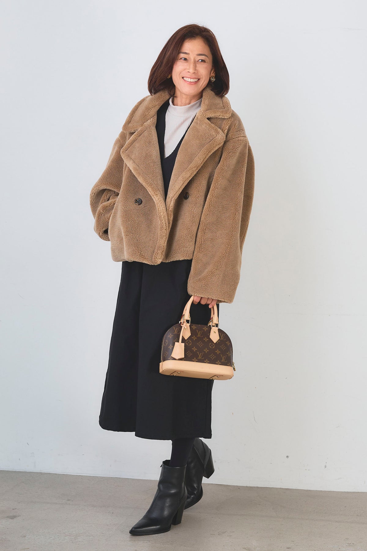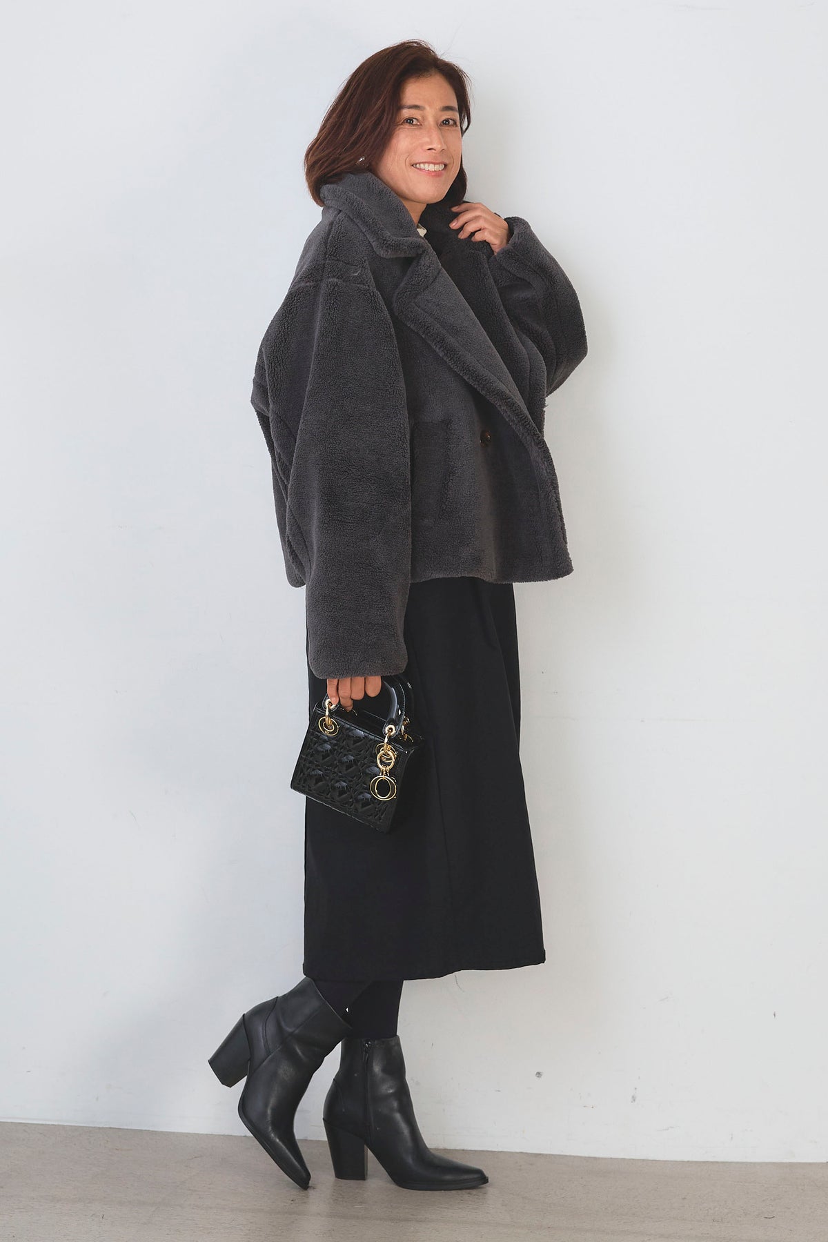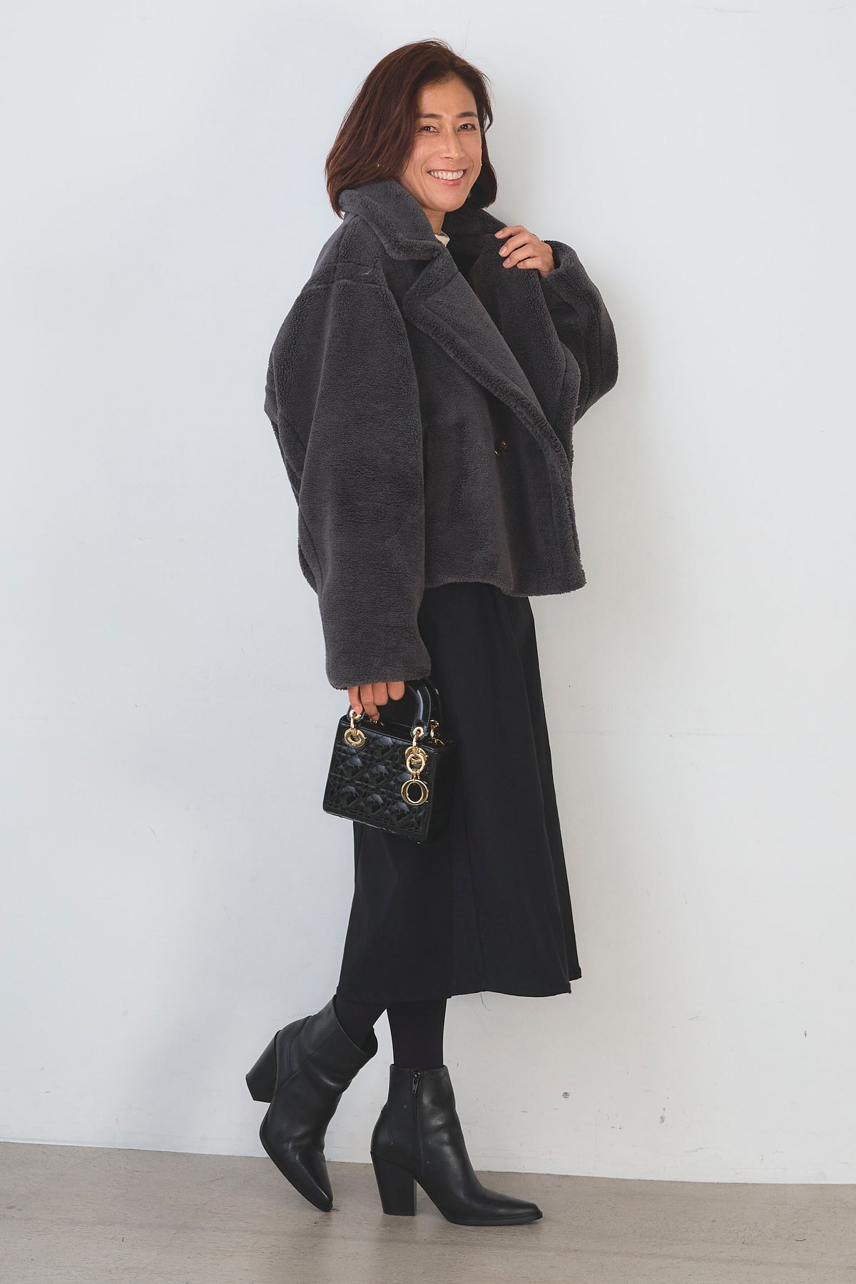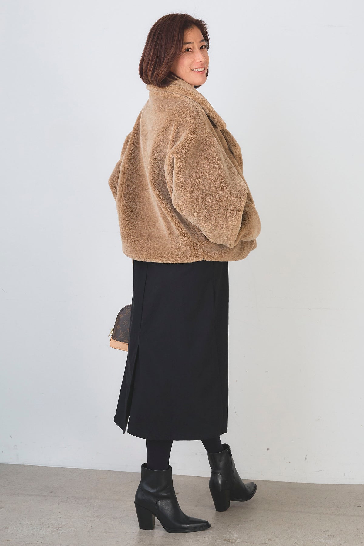 裏起毛ジャンスカとストレッチジャガードリブハイネックトップスに、テディボアショートコートを加えたコーディネートは、暖かさと洗練さを両立したスタイルです。ジャンスカのシンプルで美しいラインに、ハイネックトップスが程よいアクセントを添えています。さらに、テディボアショートコートがボリューム感とトレンド感をプラスし、全体を柔らかでリッチな印象に仕上げています。足元にはブラックのショートブーツを合わせ、季節感とモード感を演出。コンパクトなバッグがスタイリングのアクセントとなり、洗練された大人のカジュアルを引き立てます。