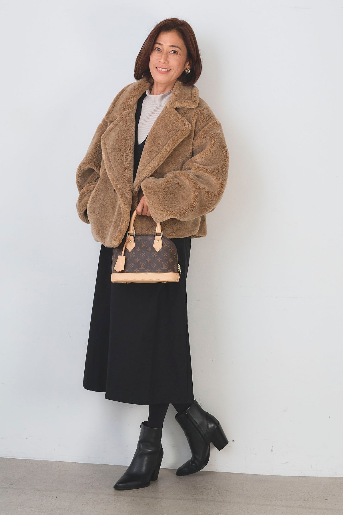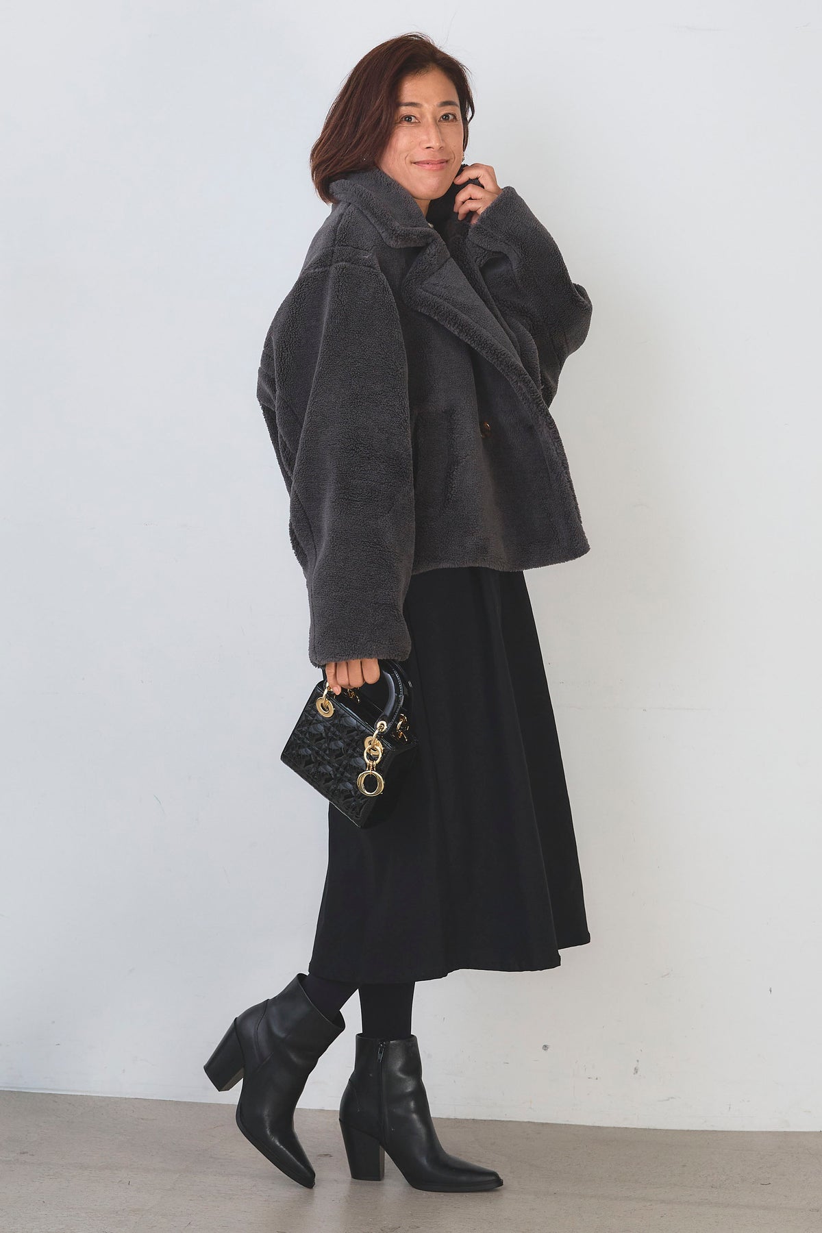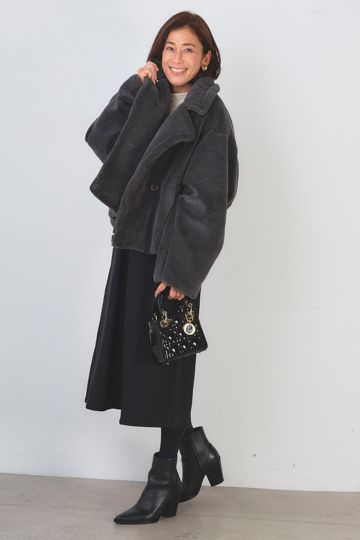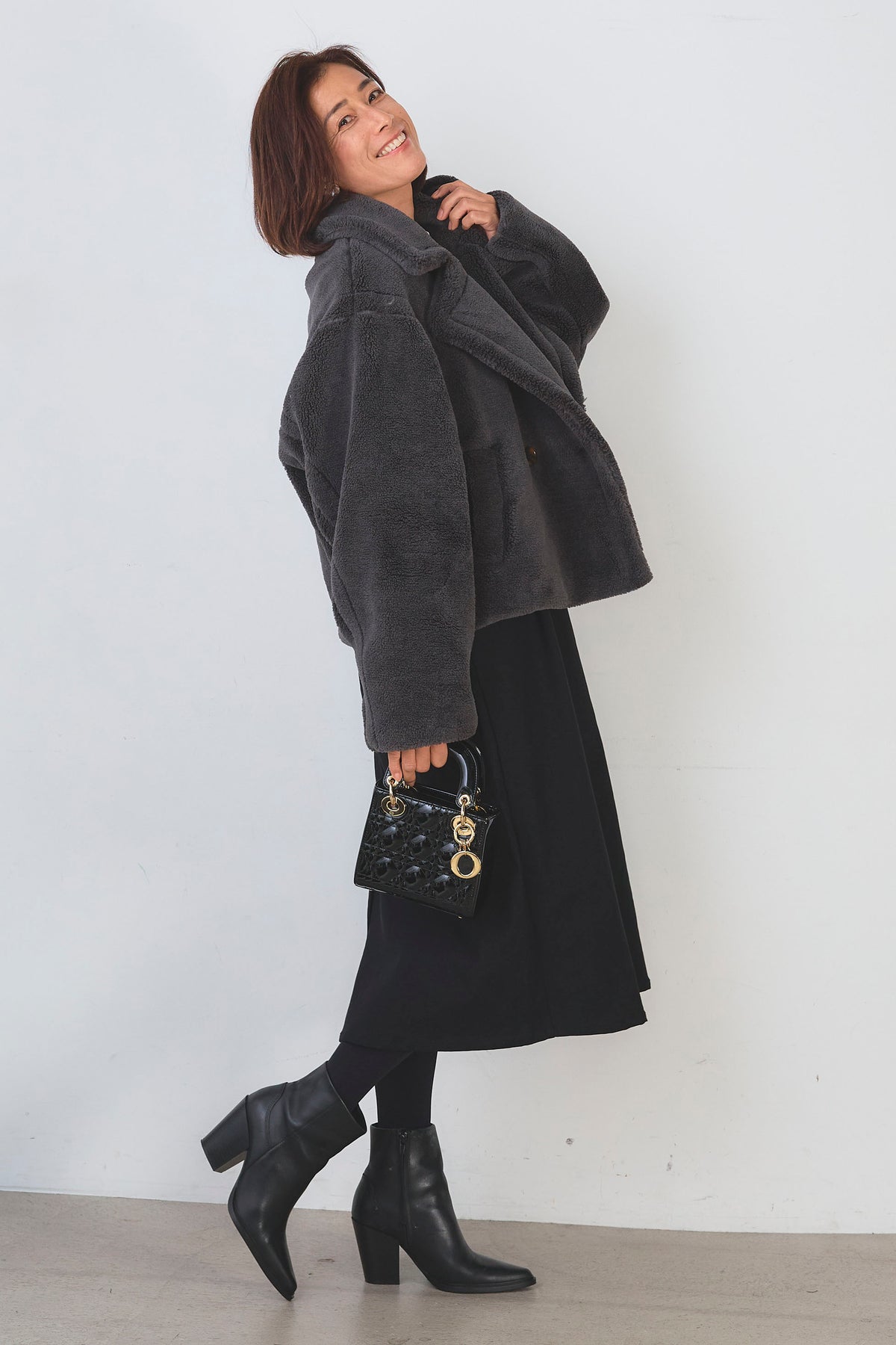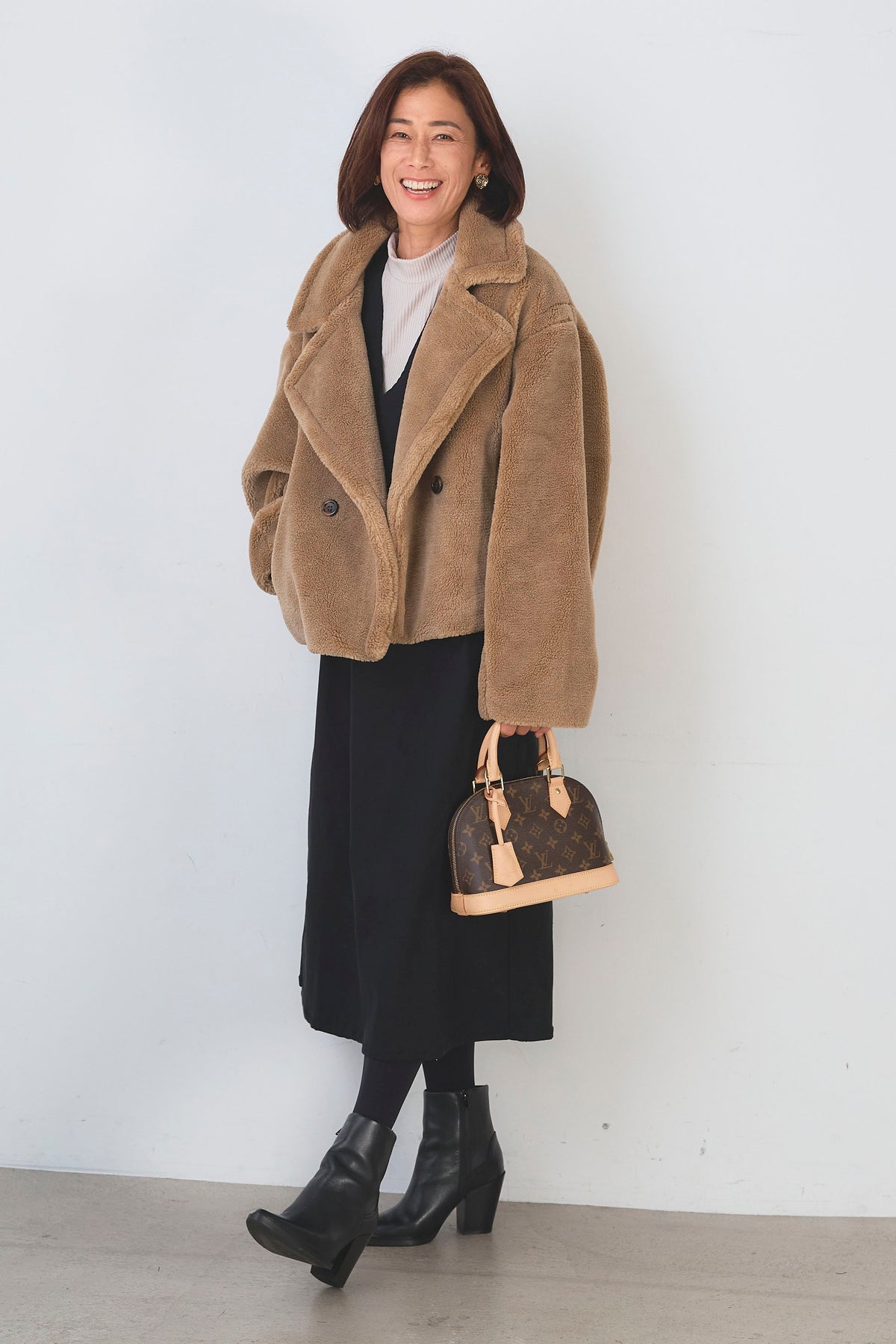 裏起毛ジャンスカとストレッチジャガードリブハイネックトップスに、テディボアショートコートを加えたコーディネートは、暖かさと洗練さを両立したスタイルです。ジャンスカのシンプルで美しいラインに、ハイネックトップスが程よいアクセントを添えています。さらに、テディボアショートコートがボリューム感とトレンド感をプラスし、全体を柔らかでリッチな印象に仕上げています。足元にはブラックのショートブーツを合わせ、季節感とモード感を演出。コンパクトなバッグがスタイリングのアクセントとなり、洗練された大人のカジュアルを引き立てます。