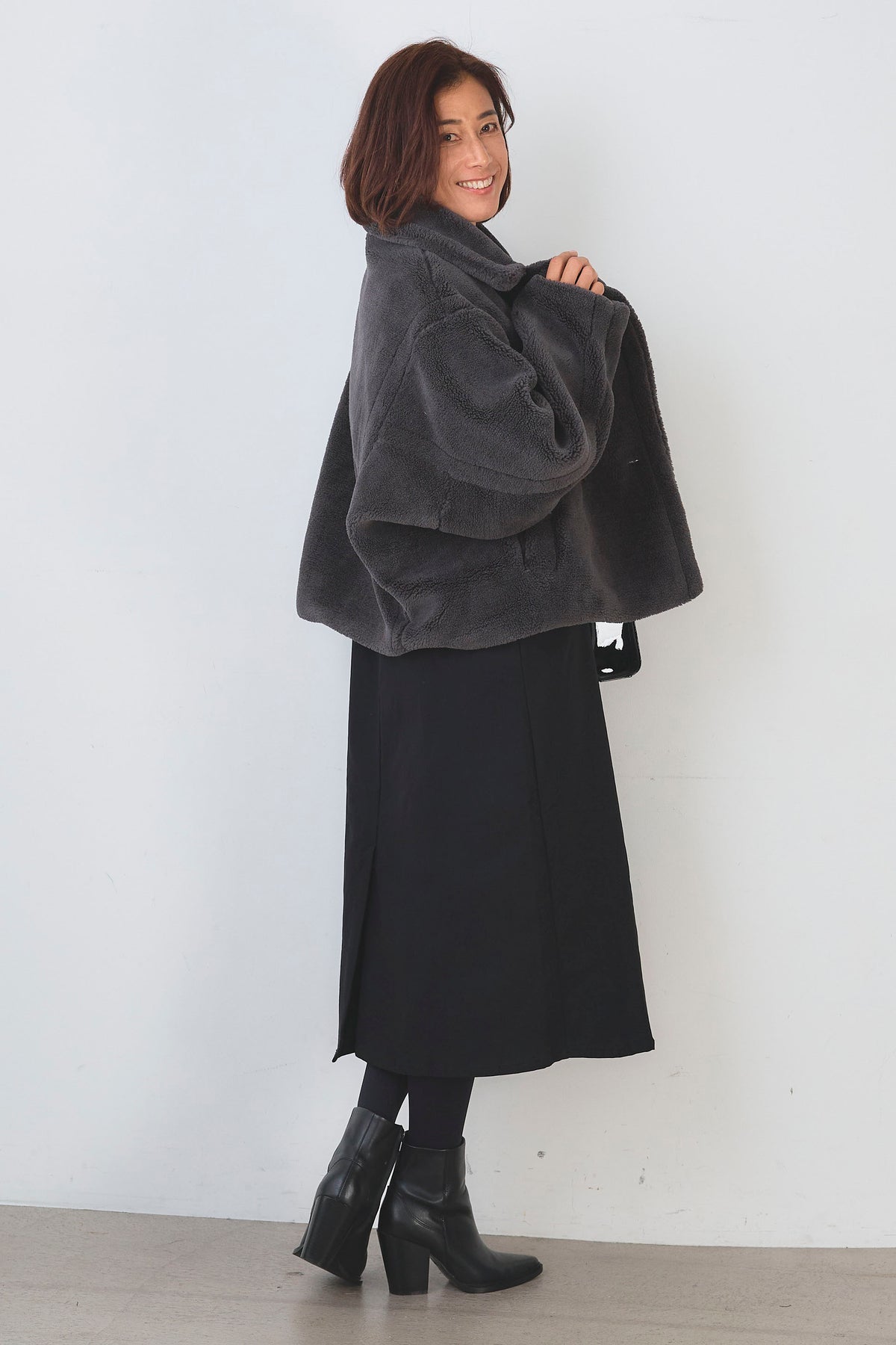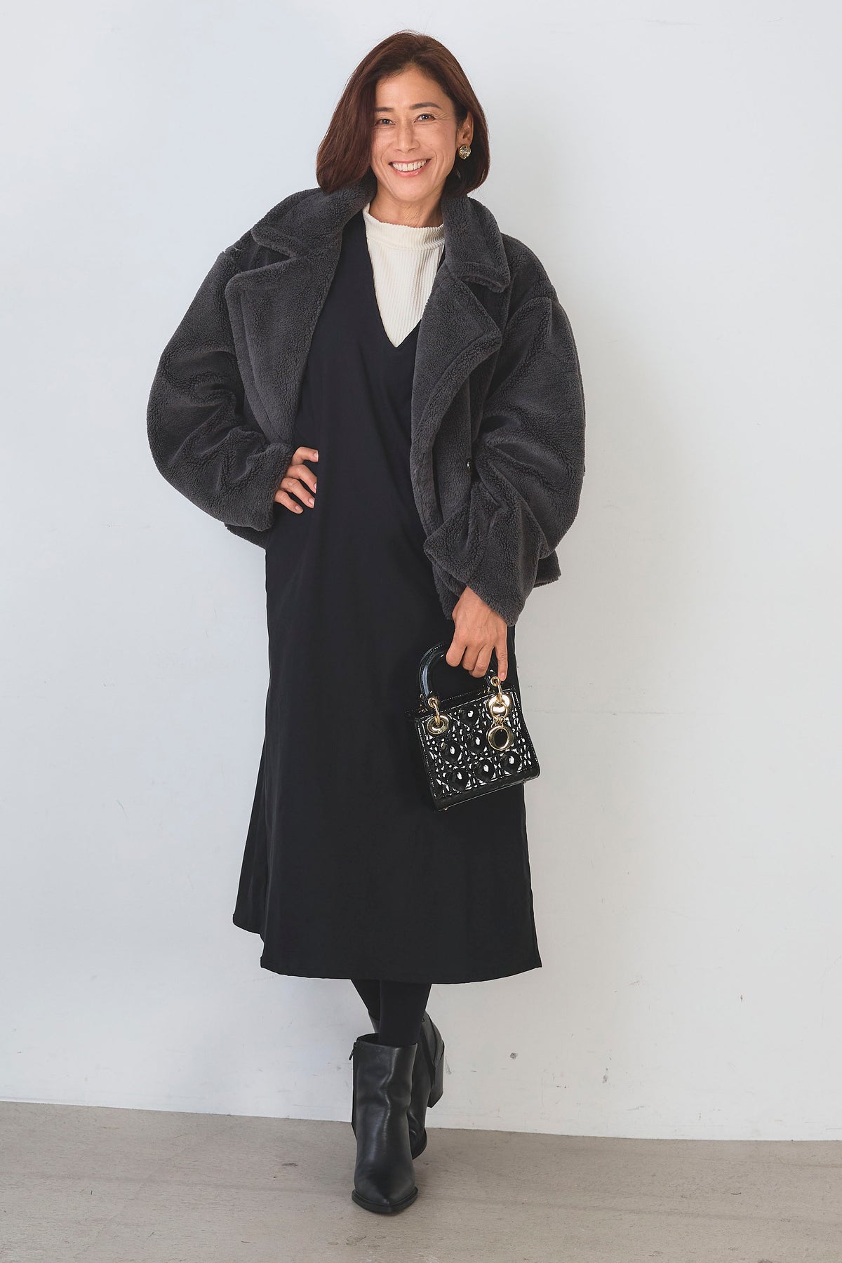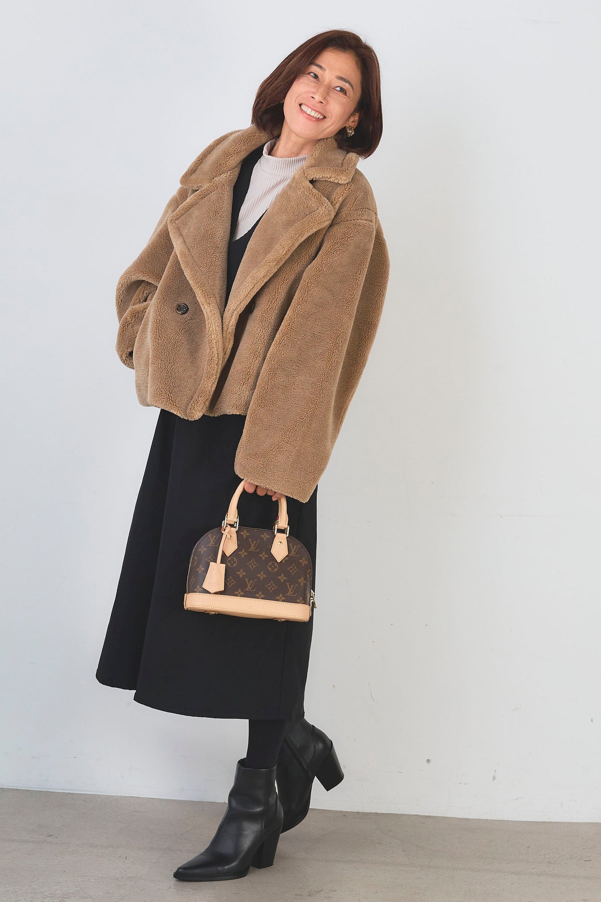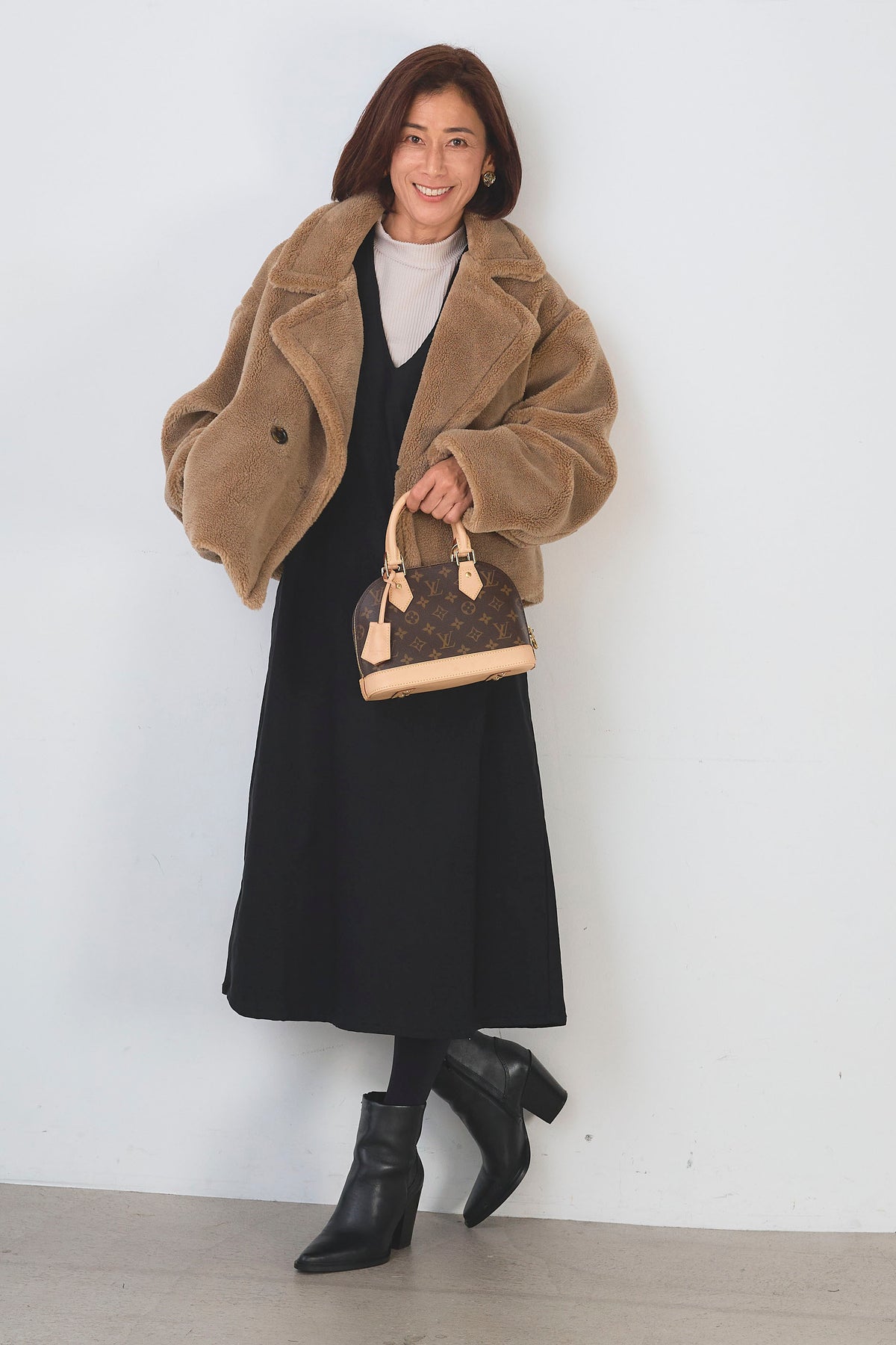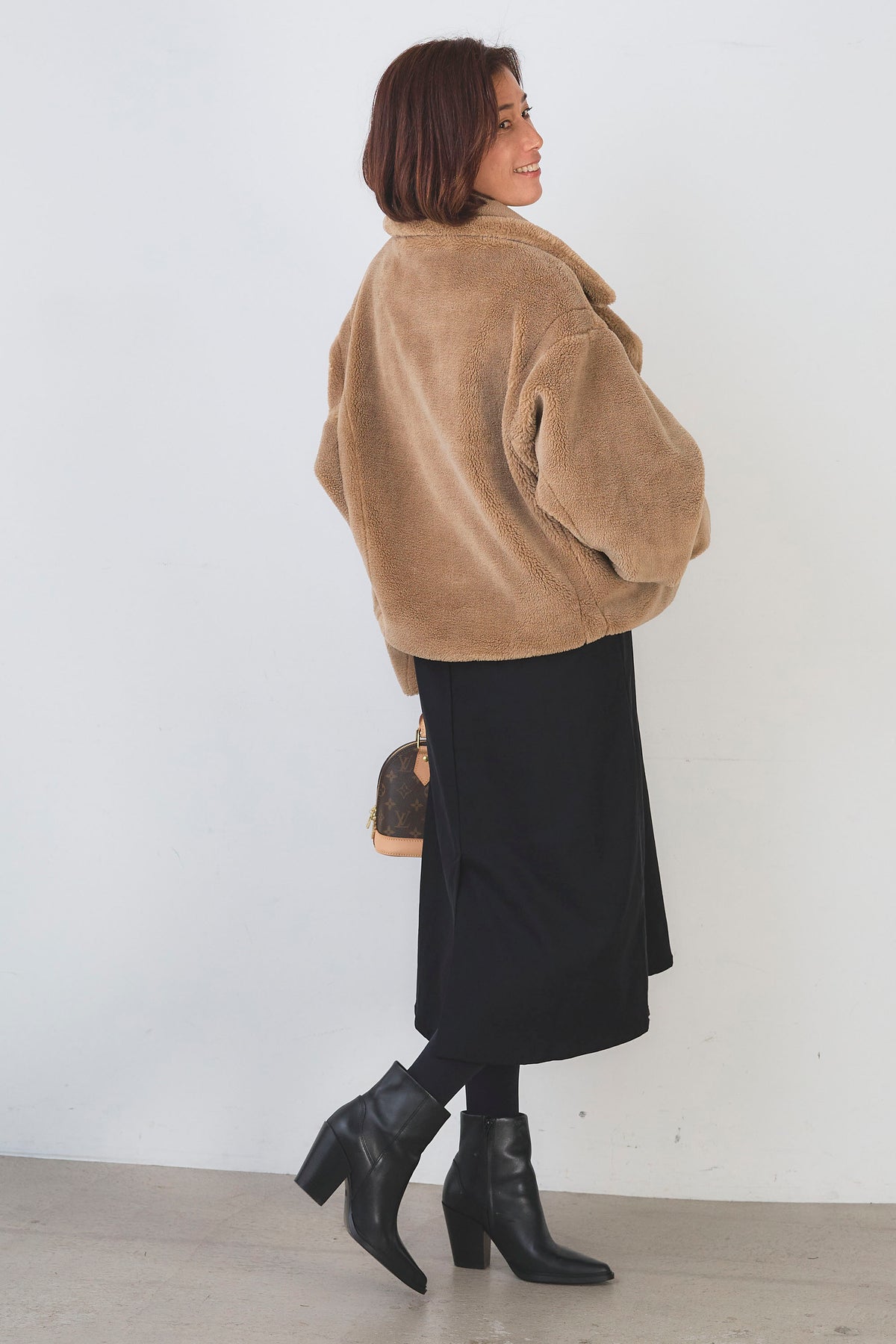 裏起毛ジャンスカとストレッチジャガードリブハイネックトップスに、テディボアショートコートを加えたコーディネートは、暖かさと洗練さを両立したスタイルです。ジャンスカのシンプルで美しいラインに、ハイネックトップスが程よいアクセントを添えています。さらに、テディボアショートコートがボリューム感とトレンド感をプラスし、全体を柔らかでリッチな印象に仕上げています。足元にはブラックのショートブーツを合わせ、季節感とモード感を演出。コンパクトなバッグがスタイリングのアクセントとなり、洗練された大人のカジュアルを引き立てます。