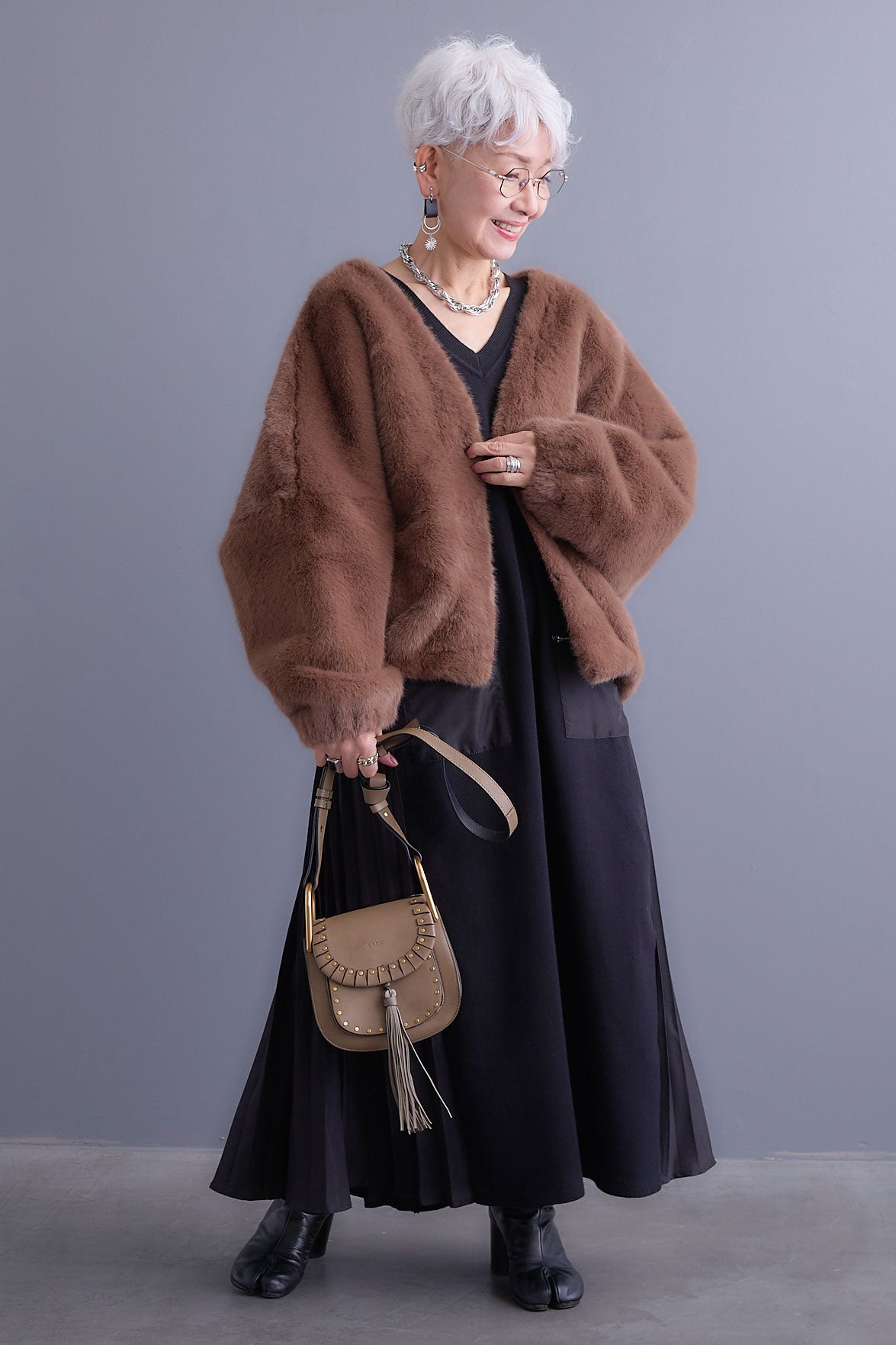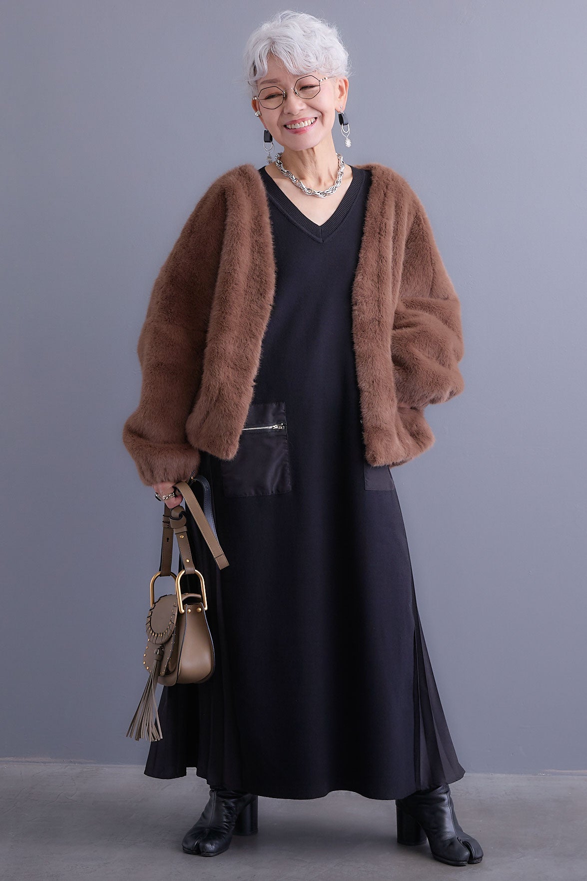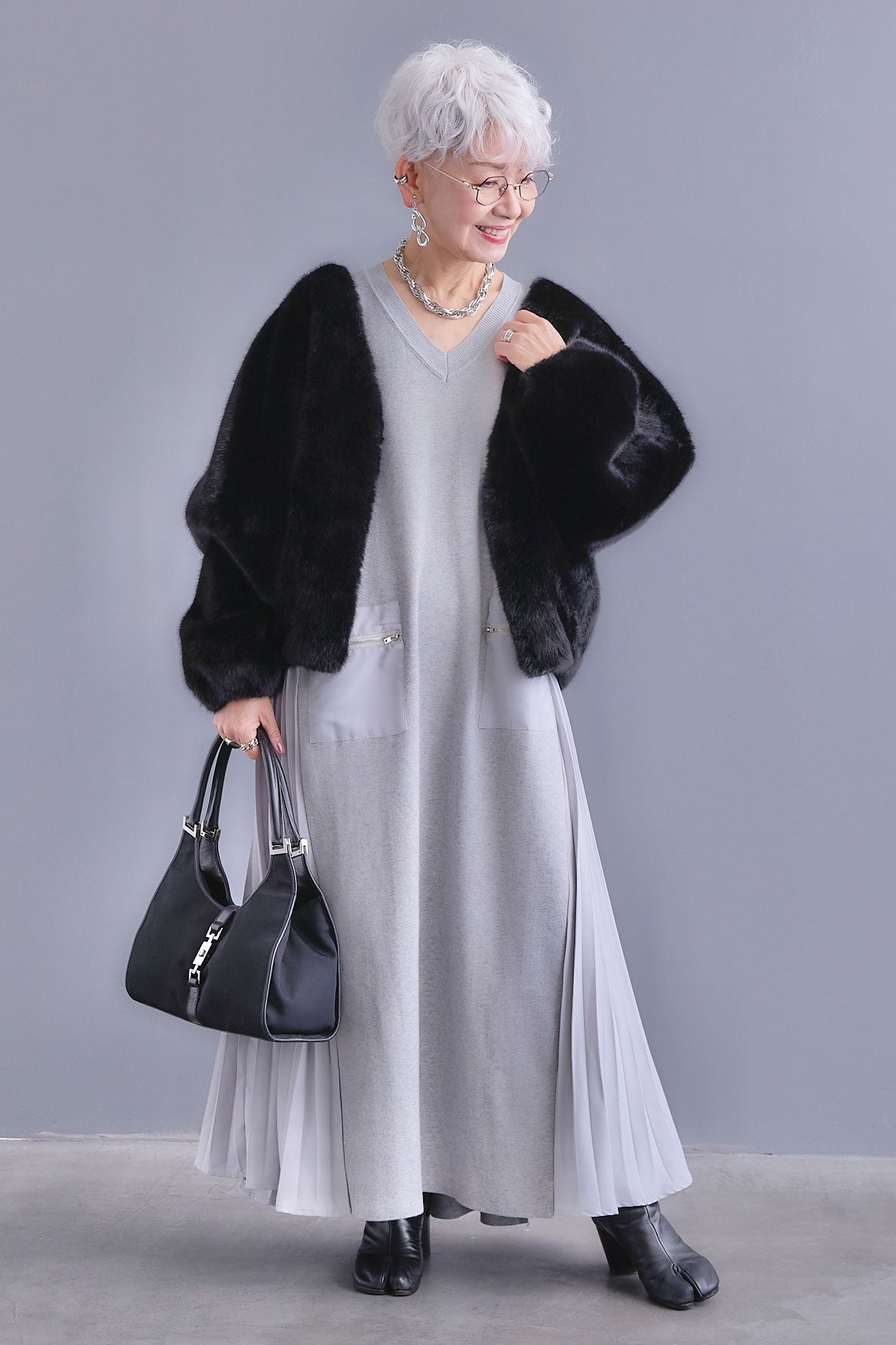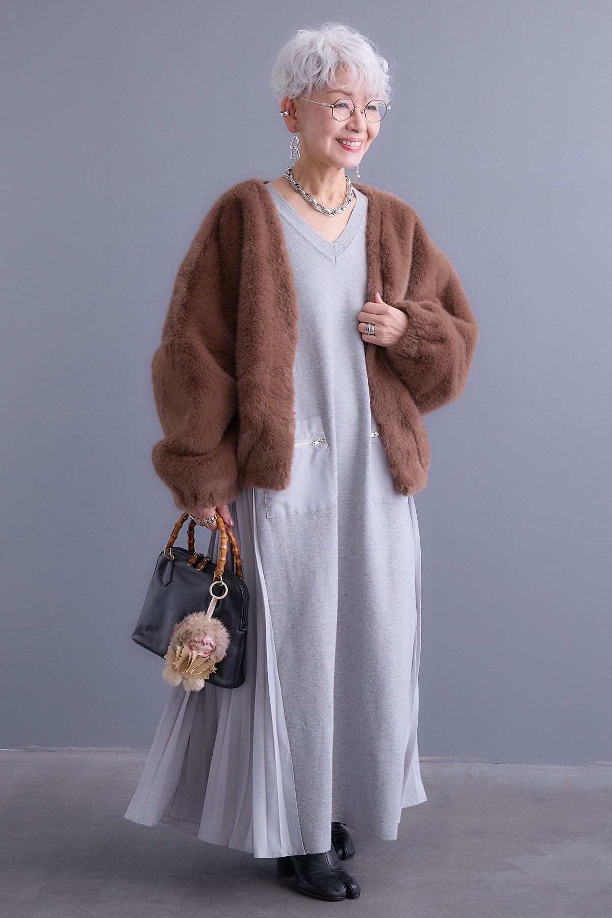 【SET】ZIPポケットサイドプリーツニットワンピース+ノーカラーラウンドシルエットファーコート(2set)