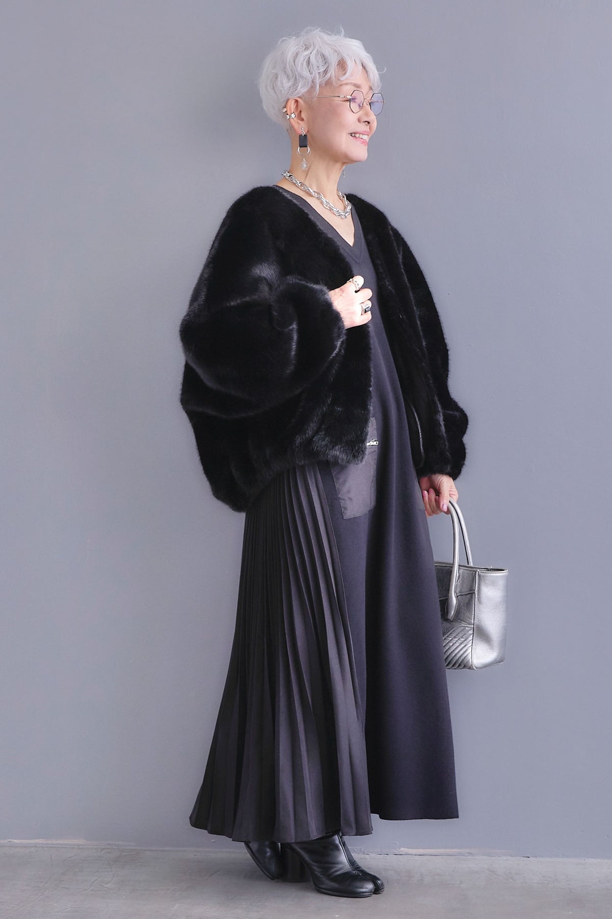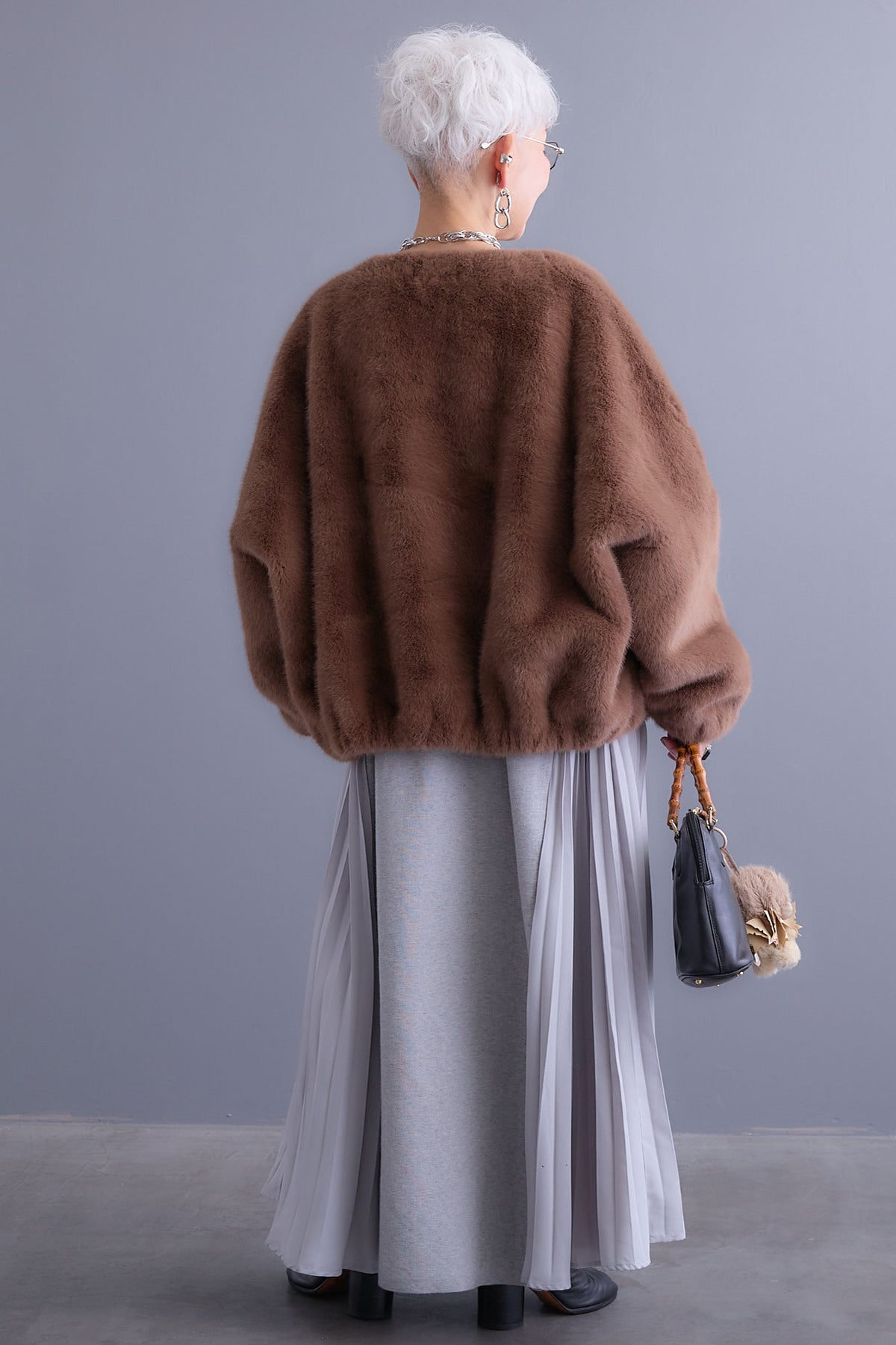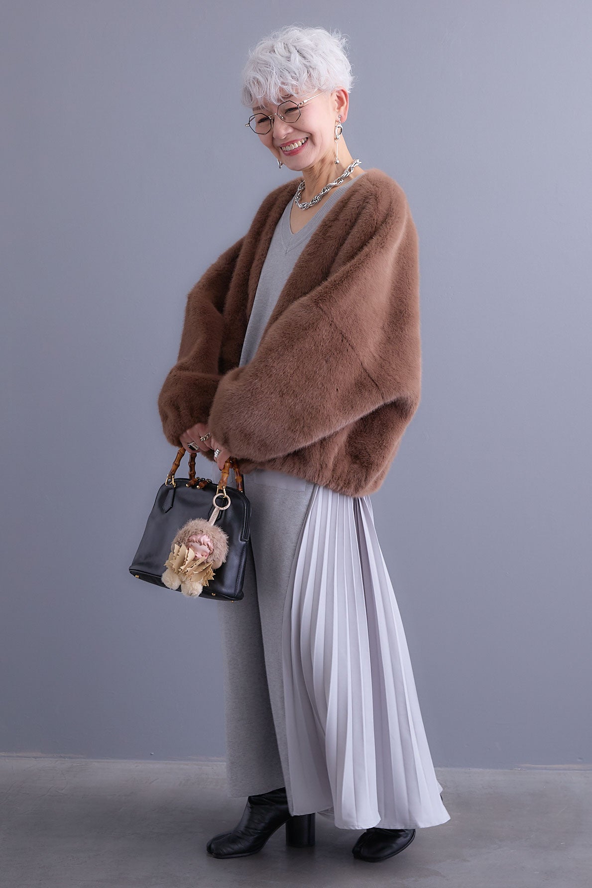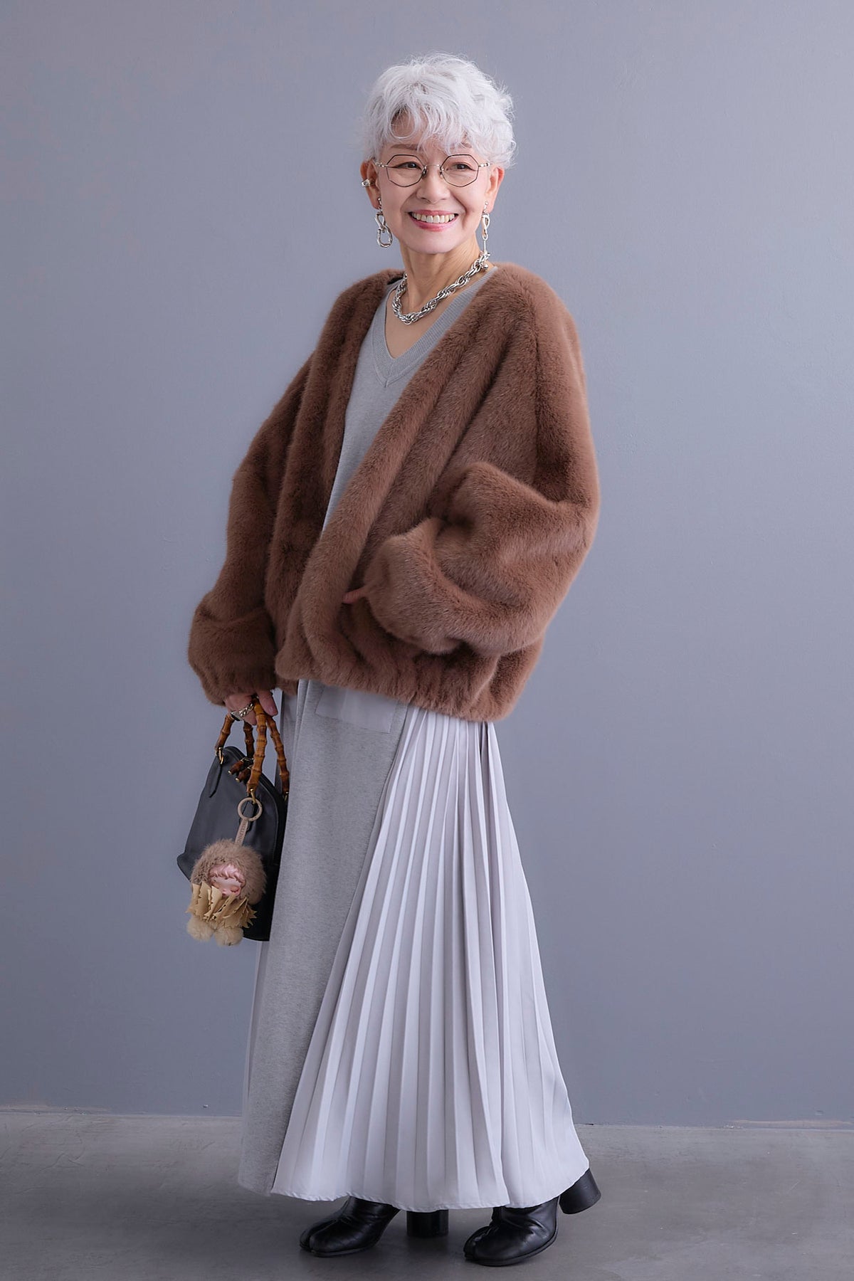 【SET】ZIPポケットサイドプリーツニットワンピース+ノーカラーラウンドシルエットファーコート(2set)