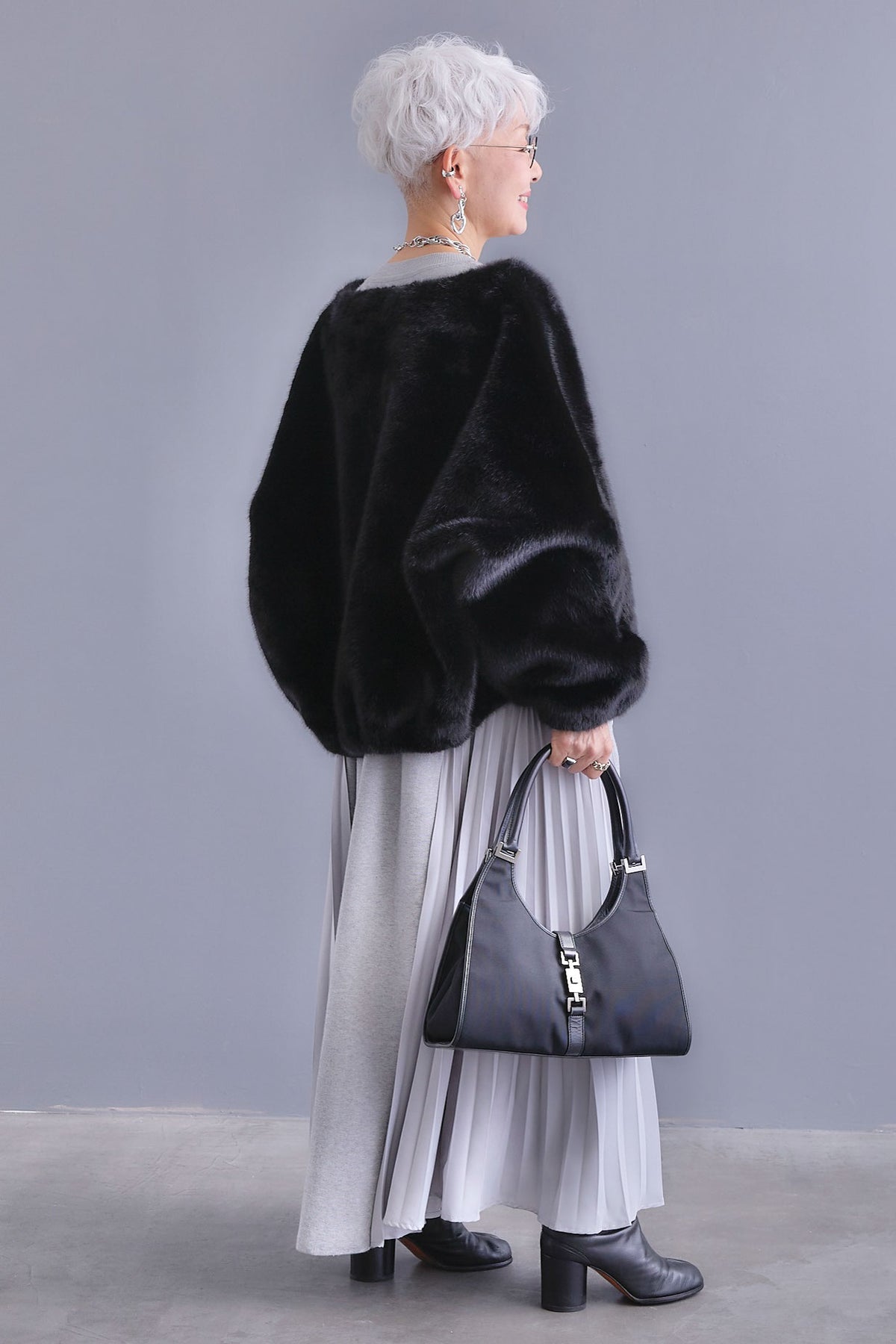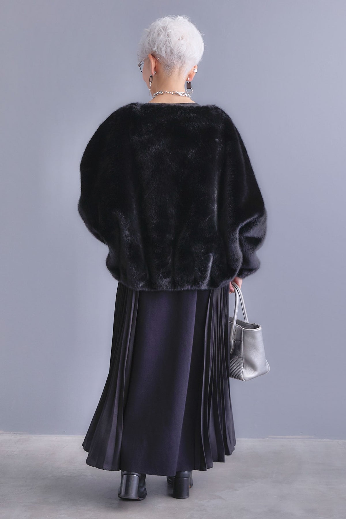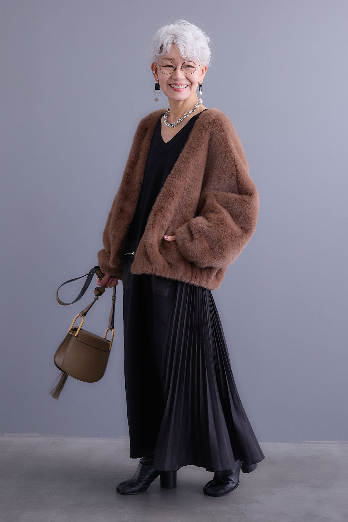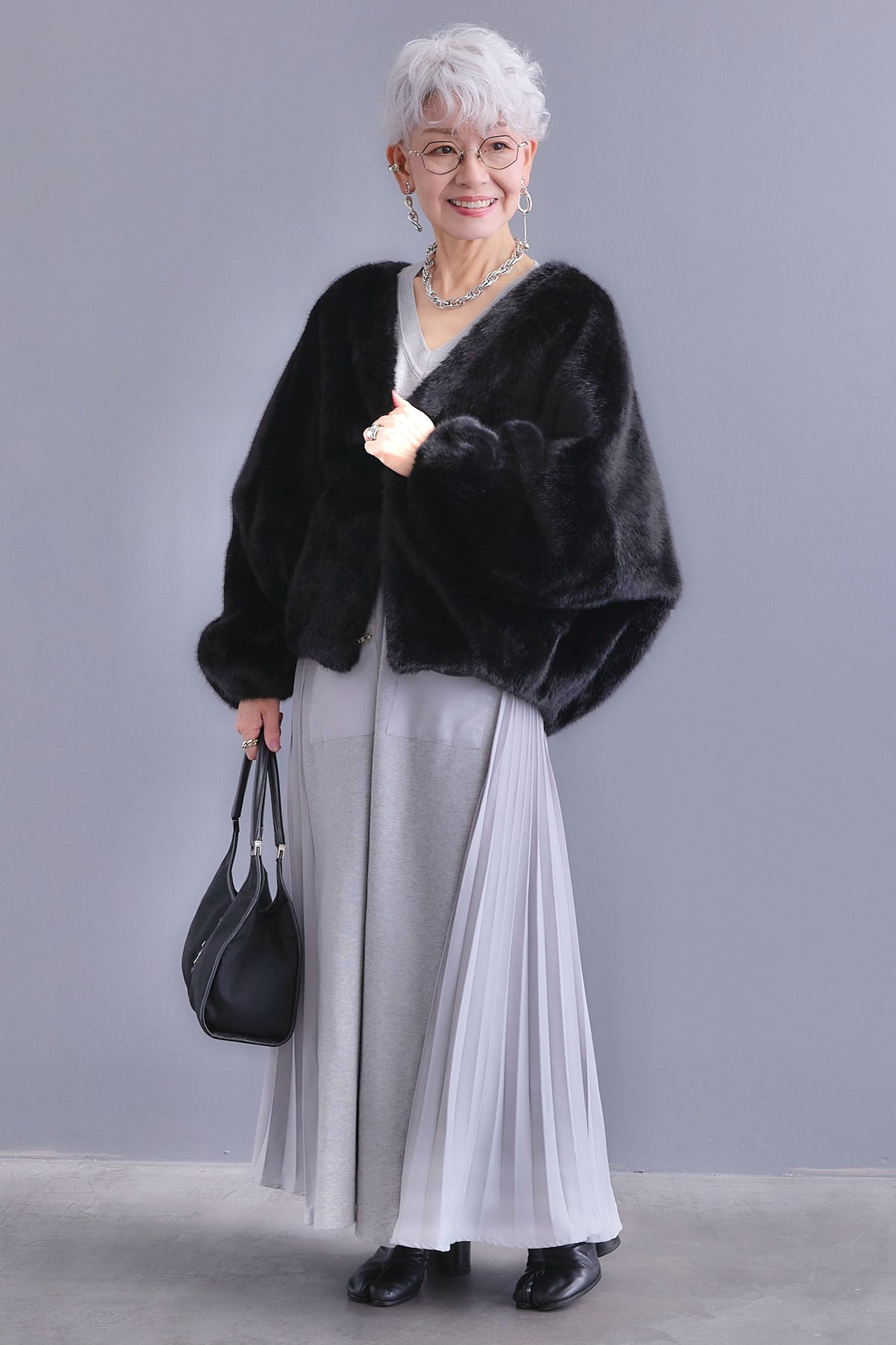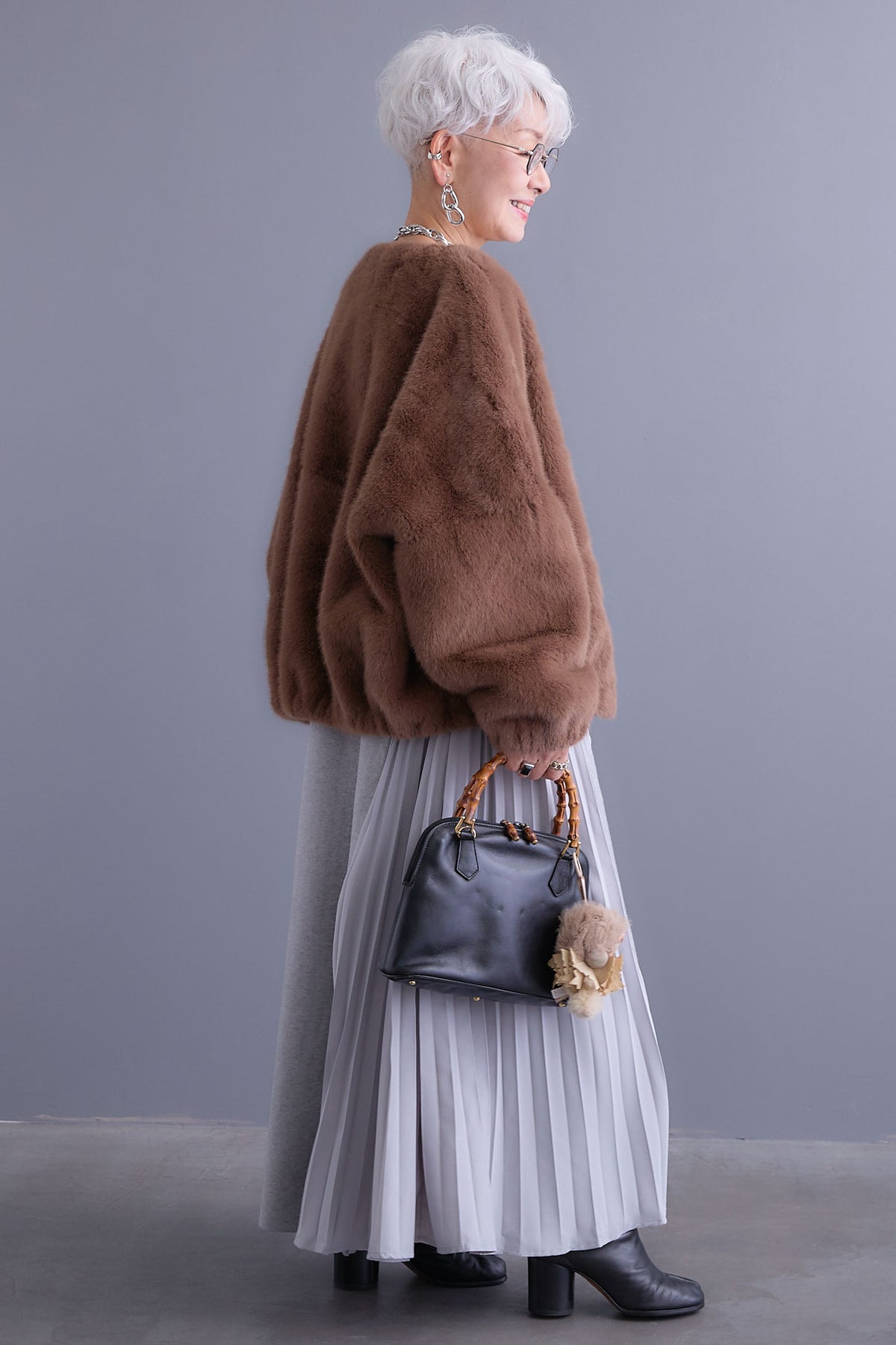 【SET】ZIPポケットサイドプリーツニットワンピース+ノーカラーラウンドシルエットファーコート(2set)