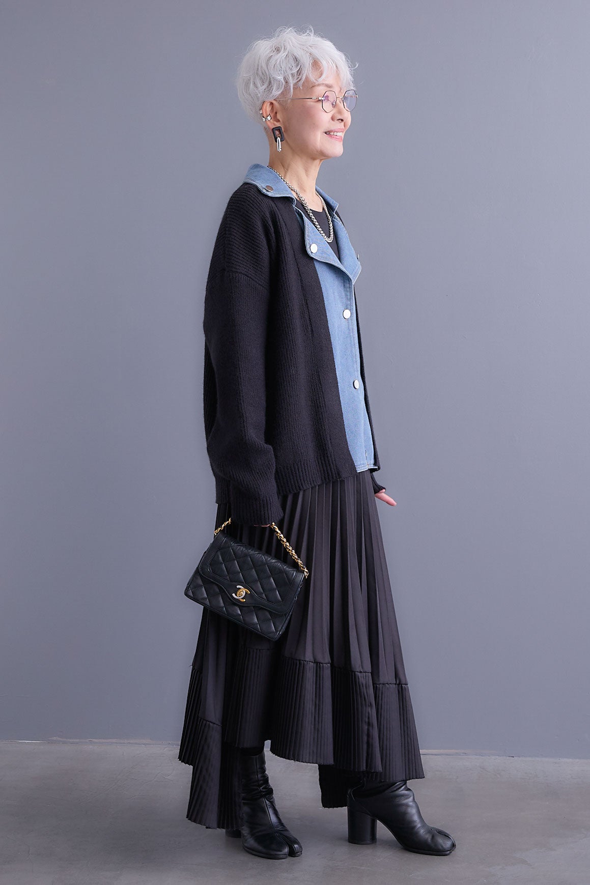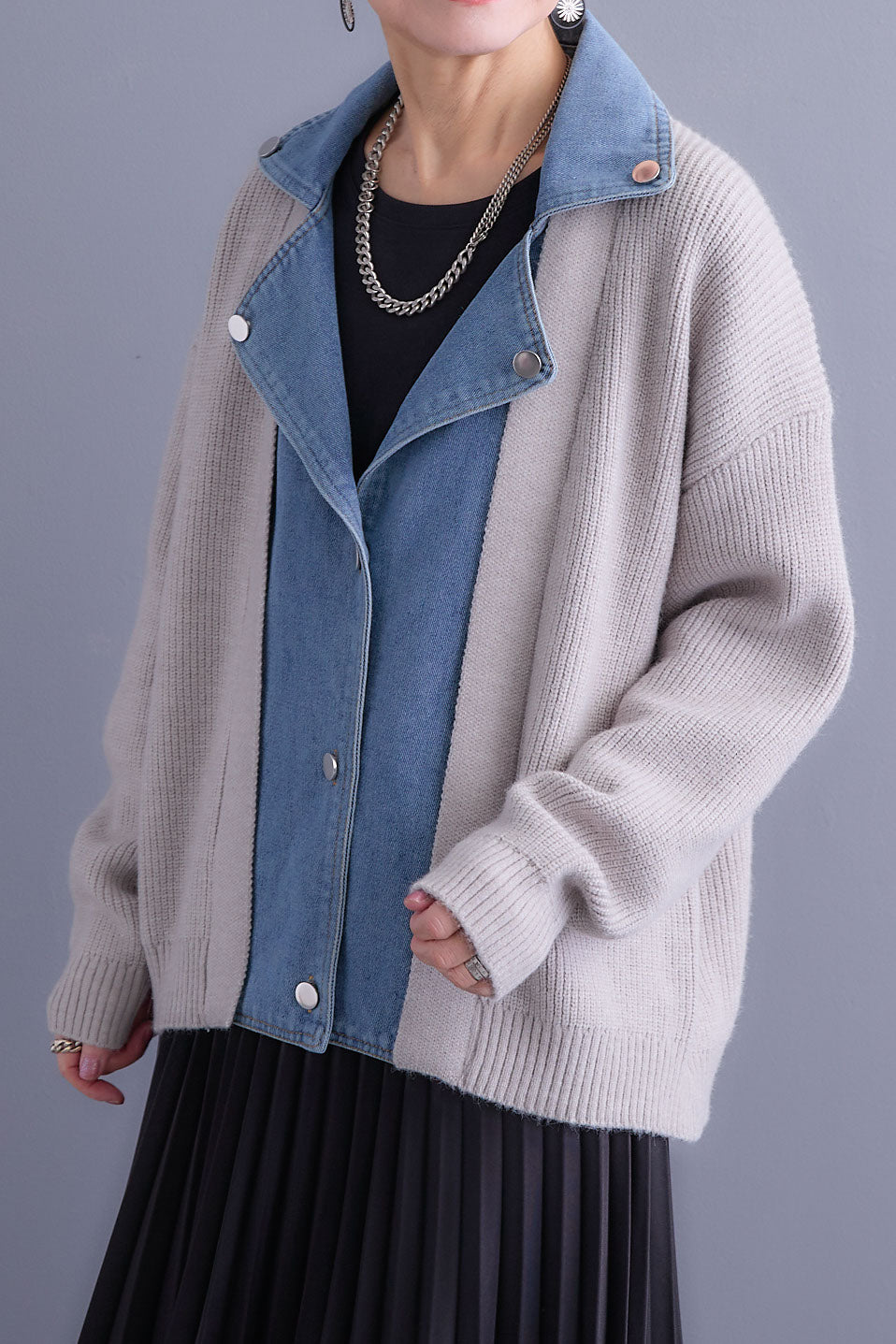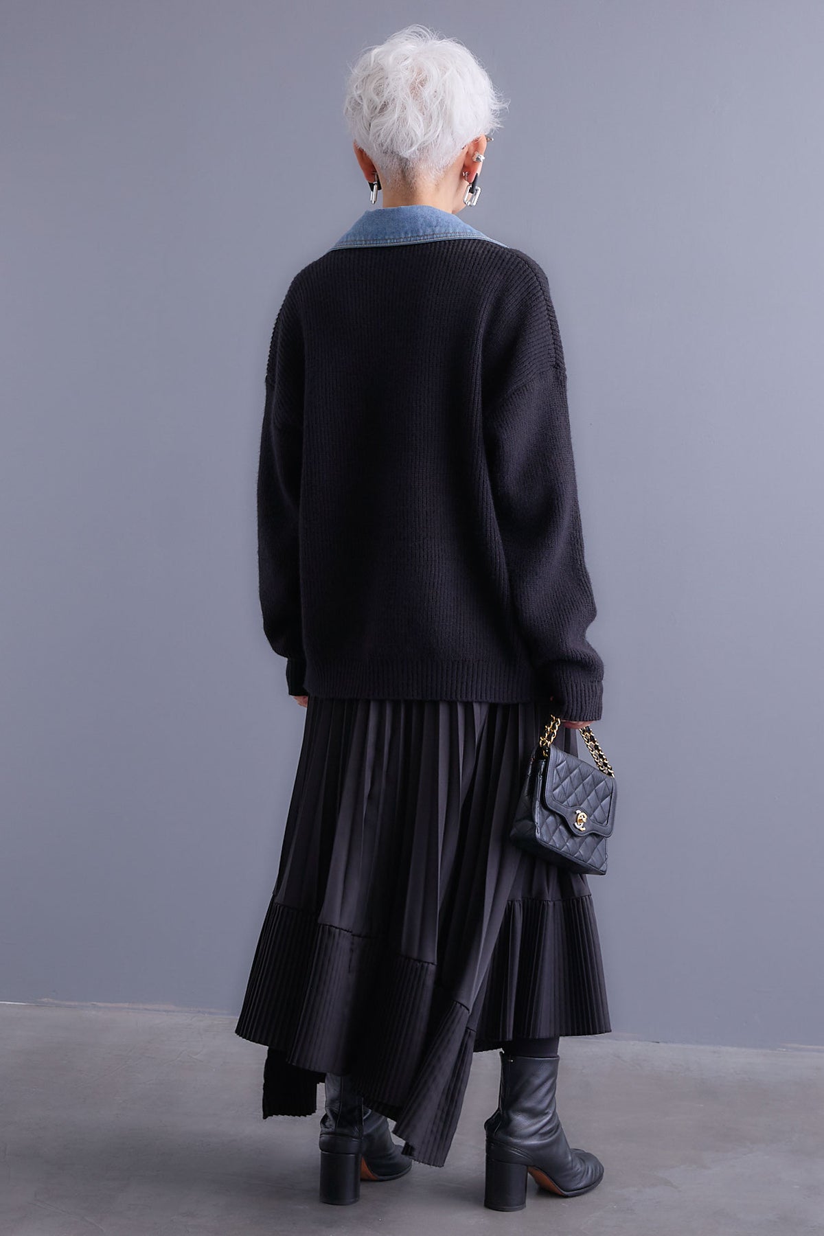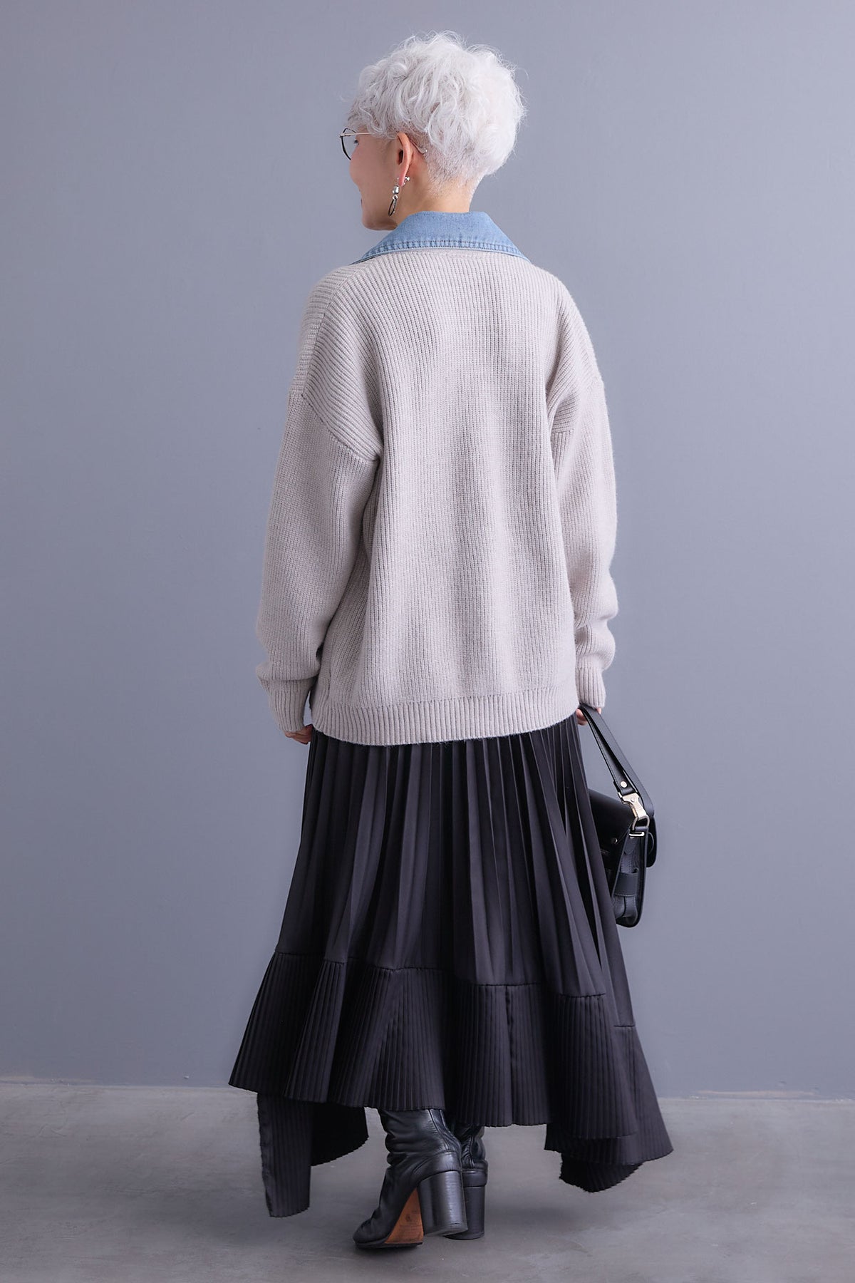 【SET】デニムライダースニットカーディガン+アシンメトリープリーツスカート(2set)