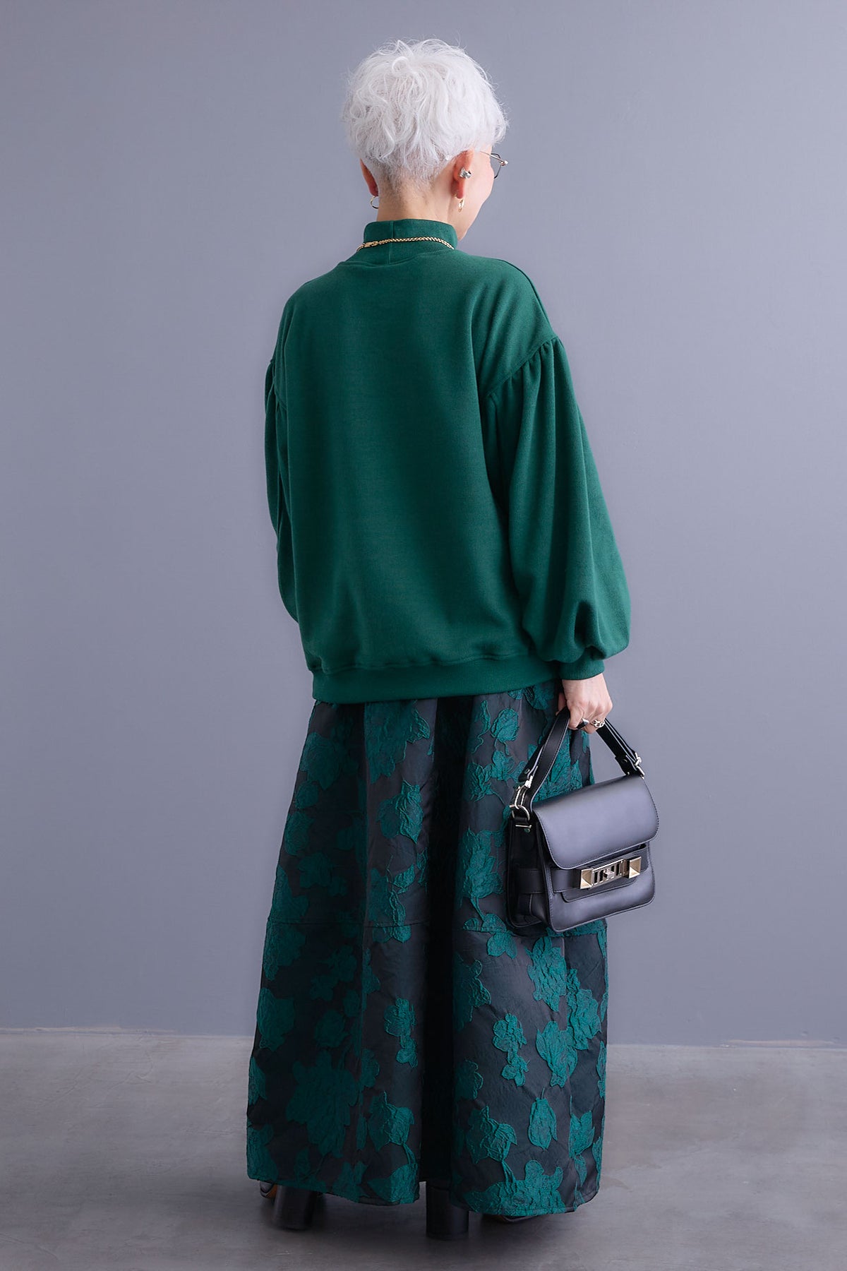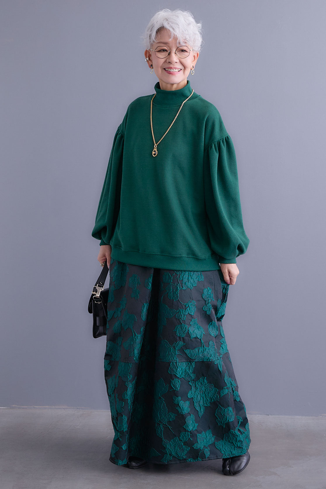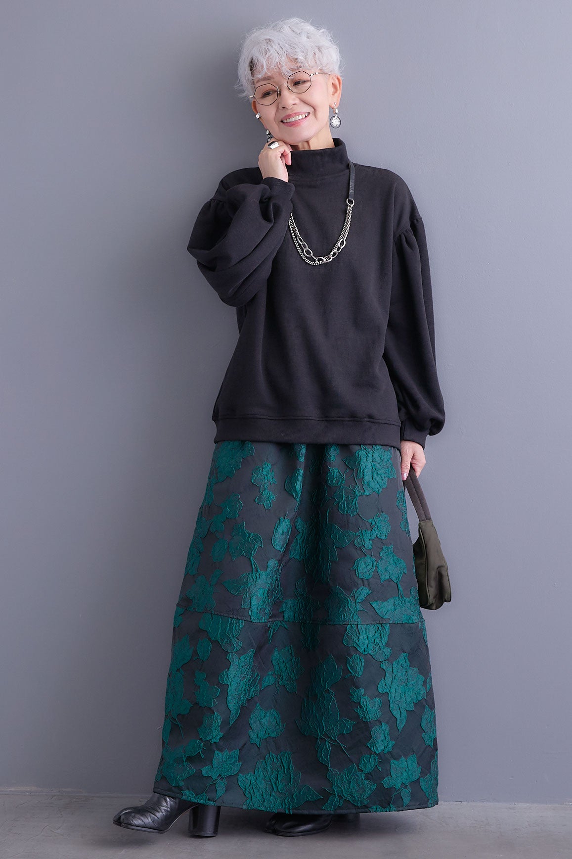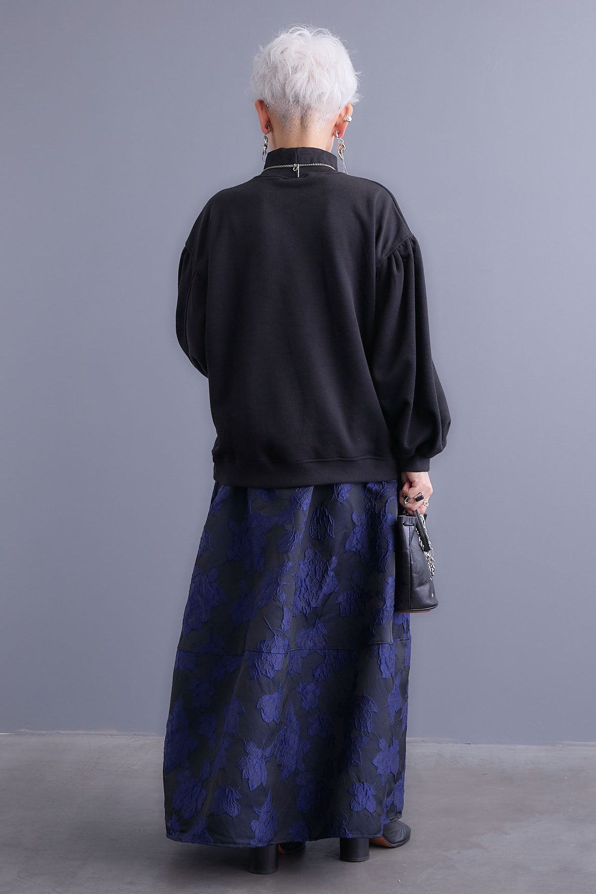 【SET】ボリュームスリーブモックネックプルオーバー+ジャガードフラワースカート(2set)