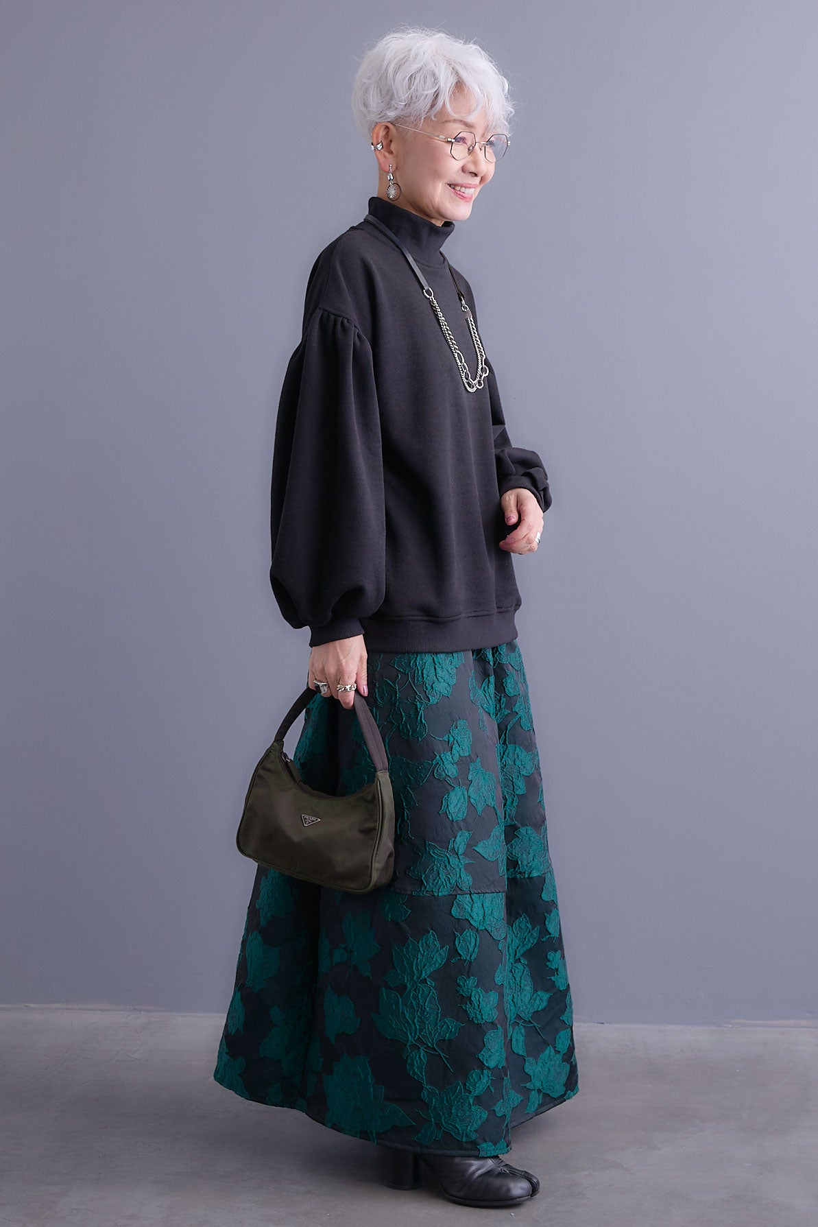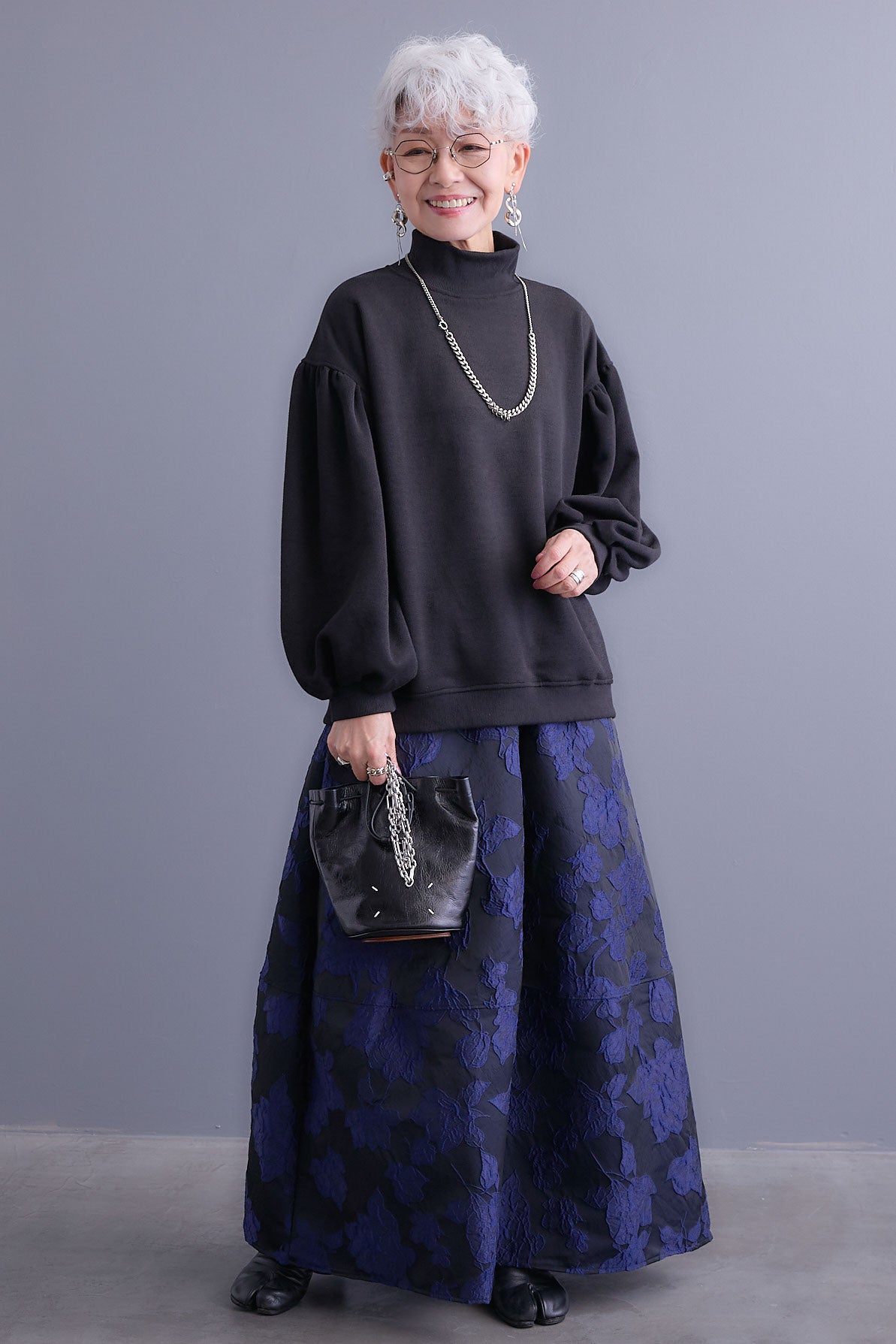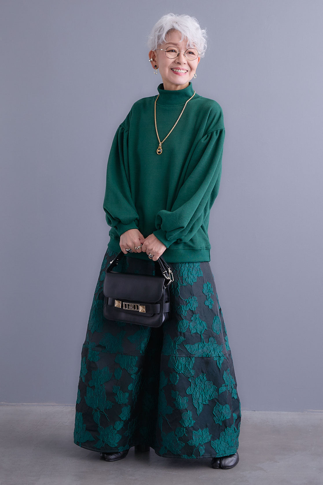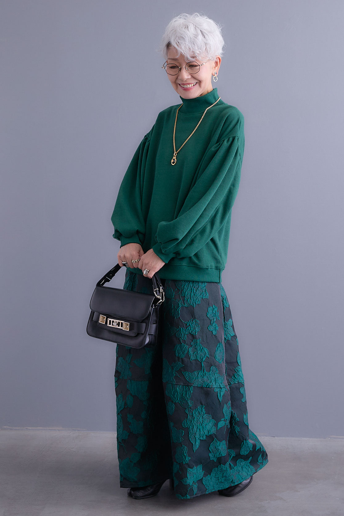 【SET】ボリュームスリーブモックネックプルオーバー+ジャガードフラワースカート(2set)