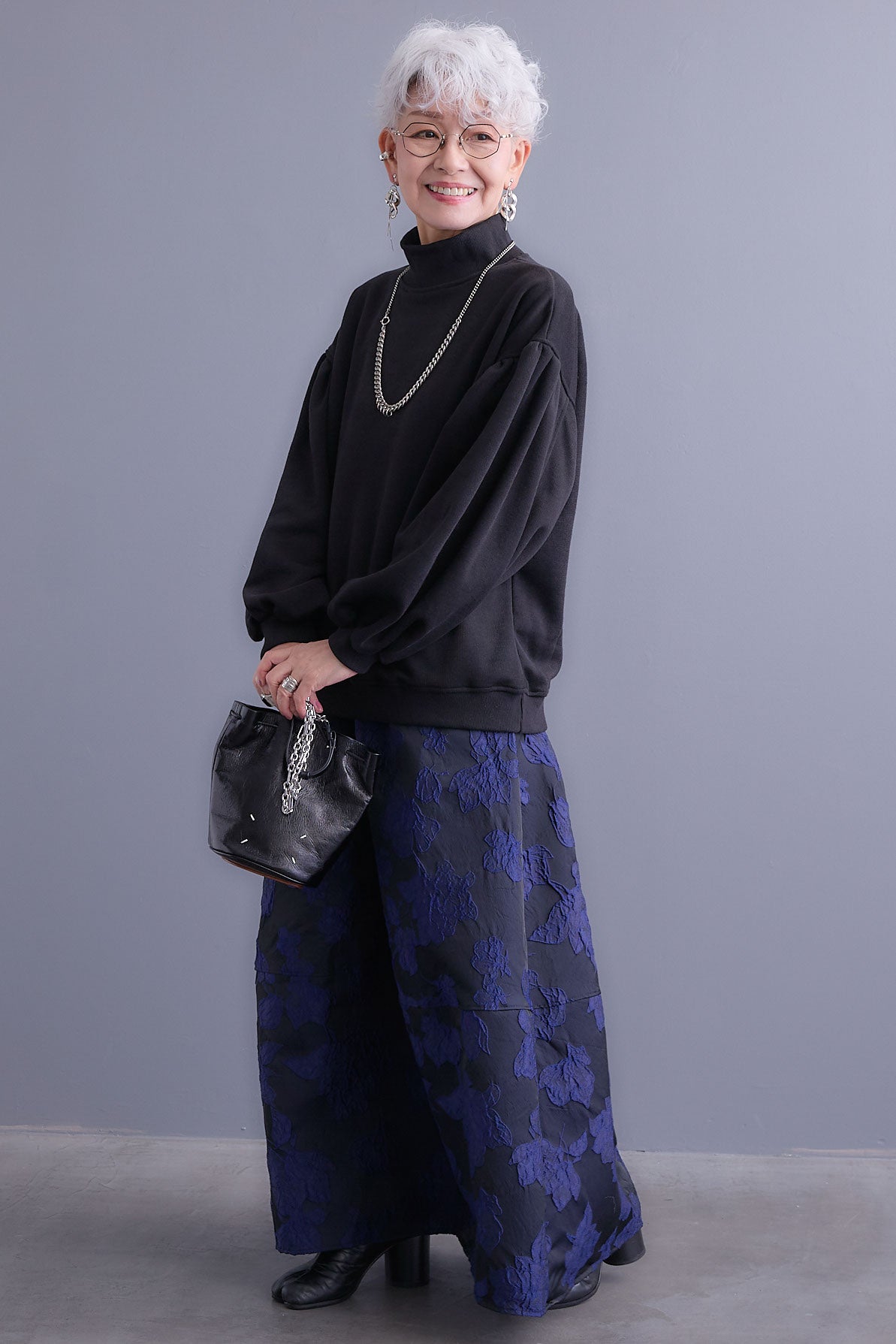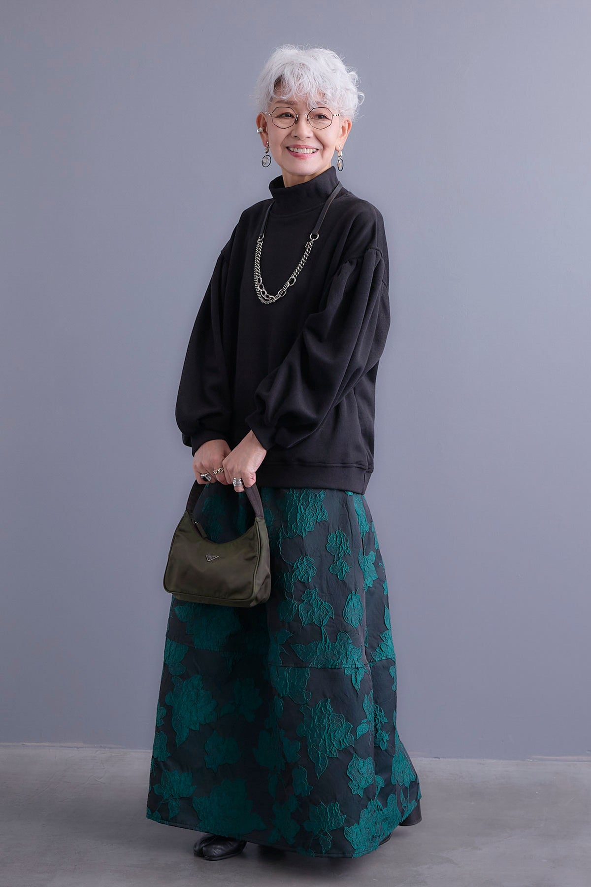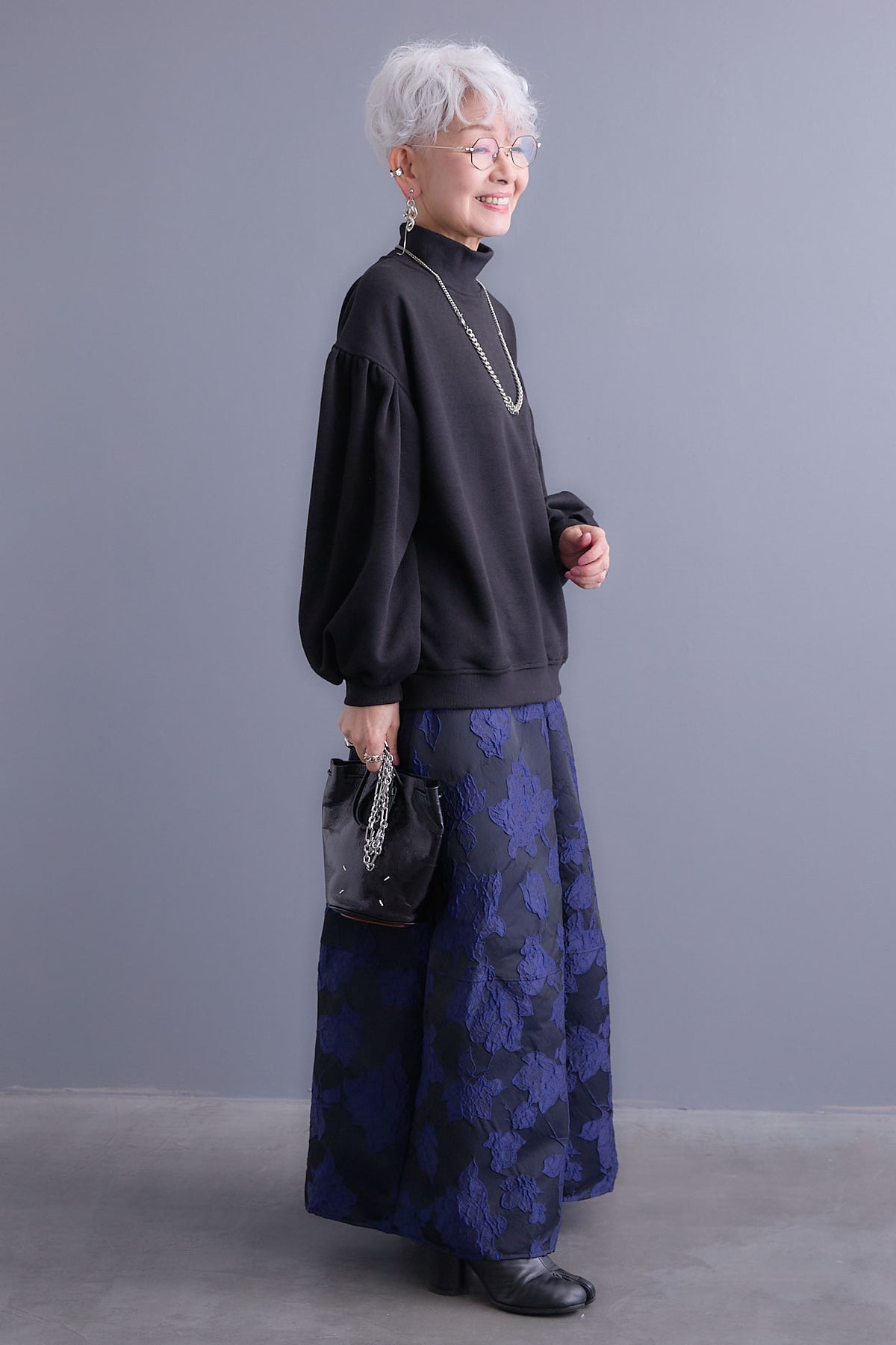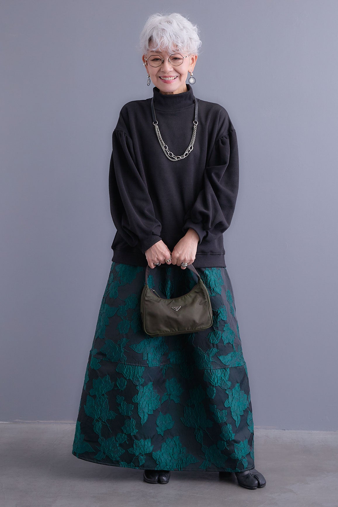 【SET】ボリュームスリーブモックネックプルオーバー+ジャガードフラワースカート(2set)