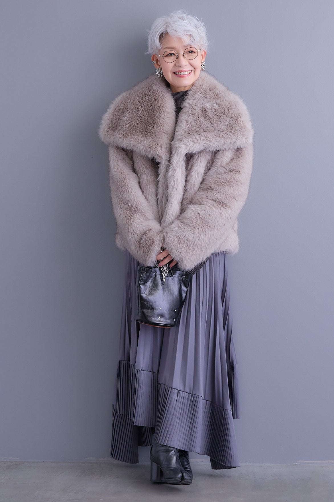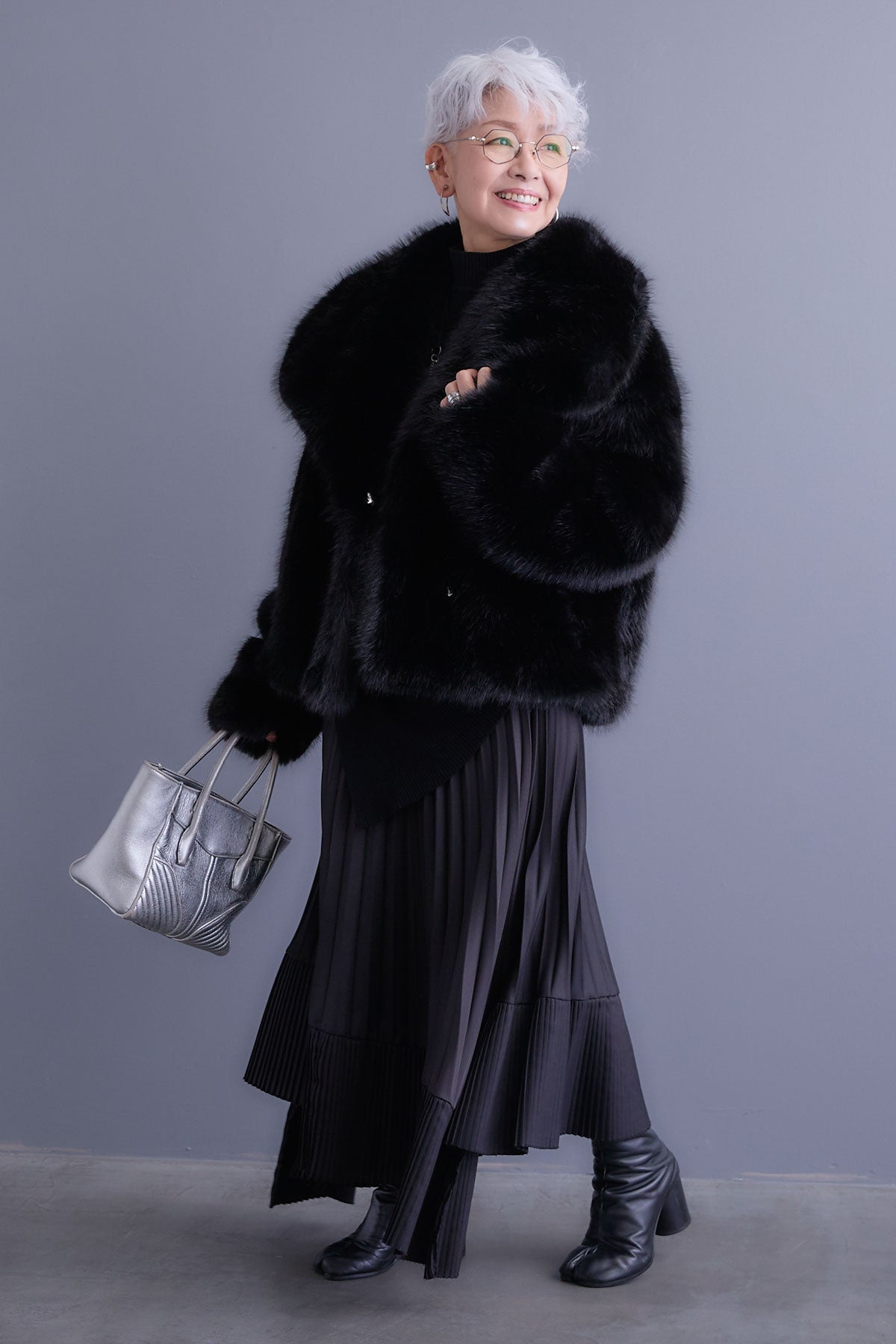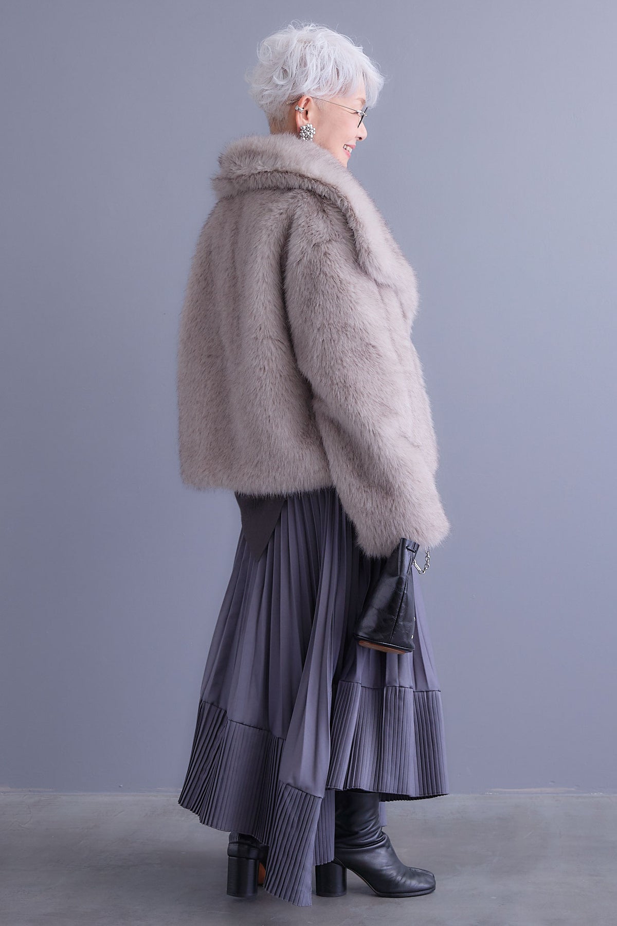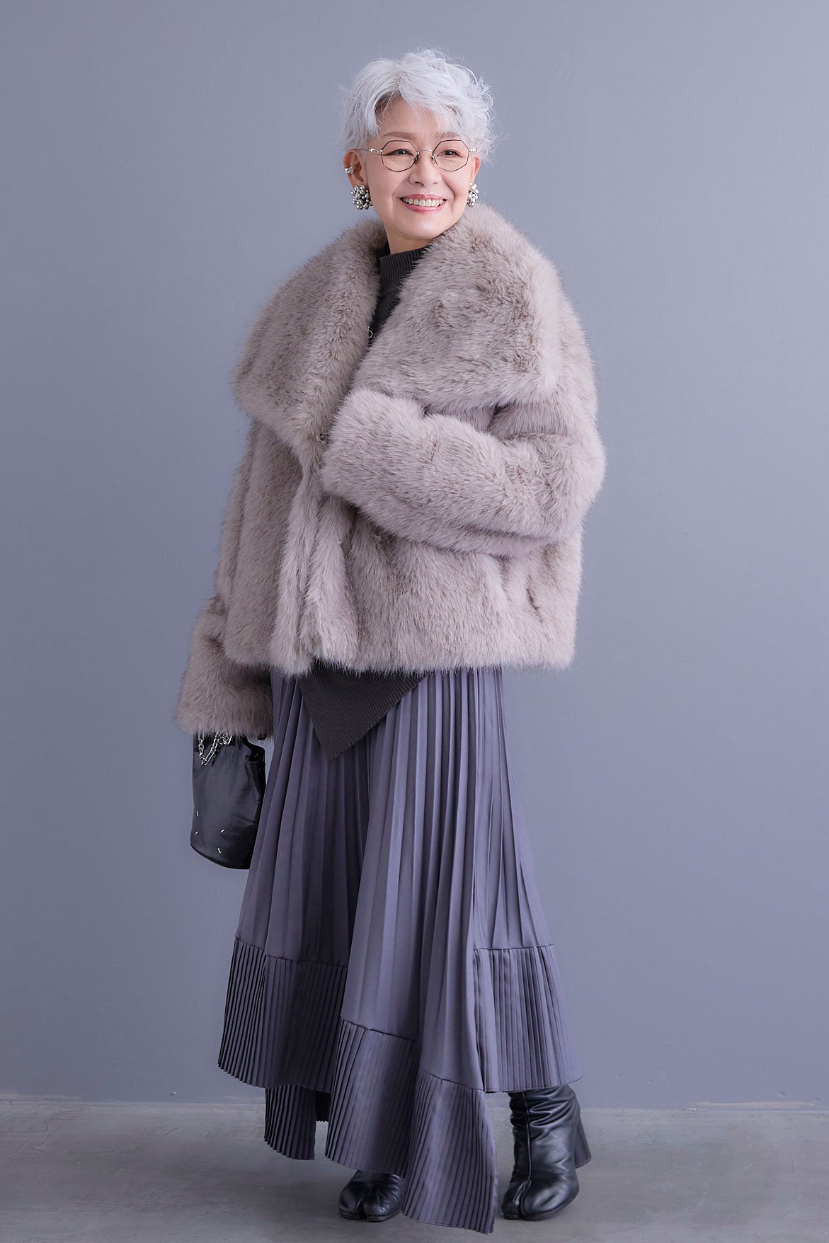 【SET】アシンメトリーオーバーニット+オーバーカラーファーコート+アシンメトリープリーツスカート(3set)