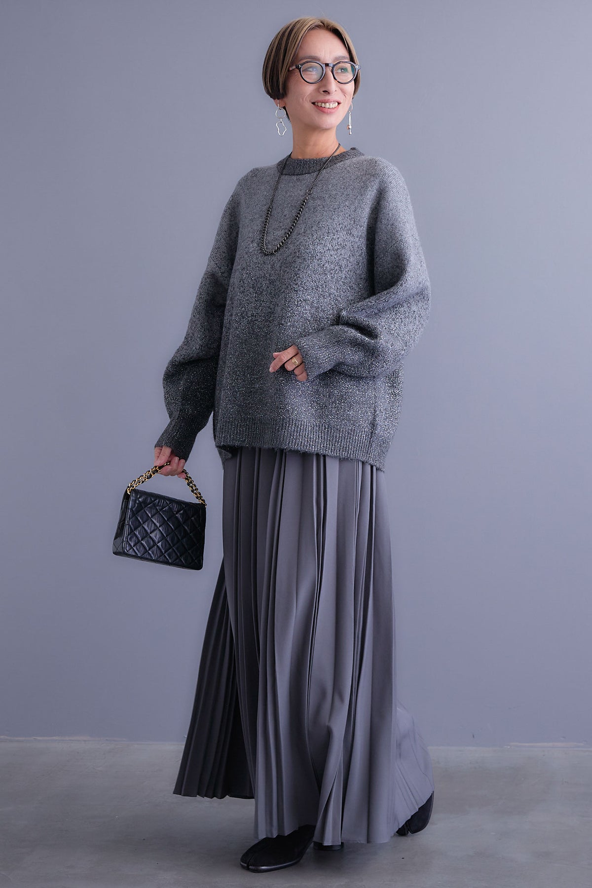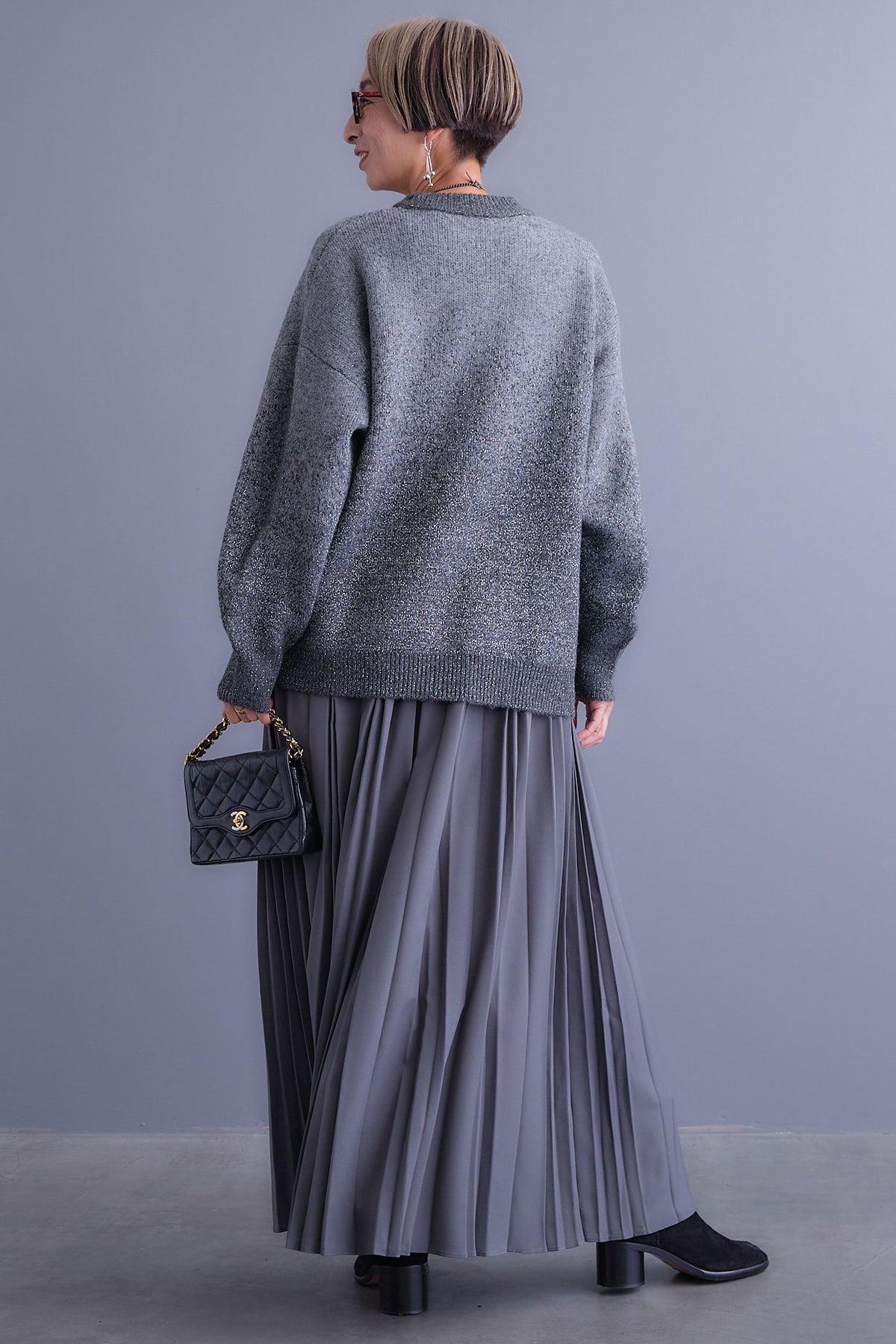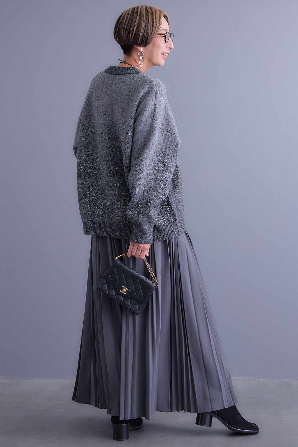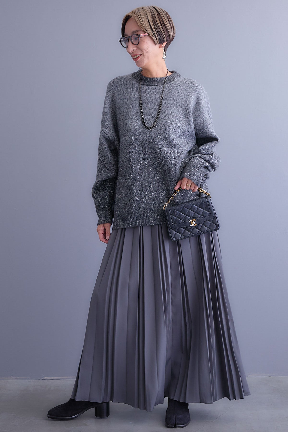 【SET】グラデーションラメクルーネックニット+ダブルプリーツロングスカート(2set)