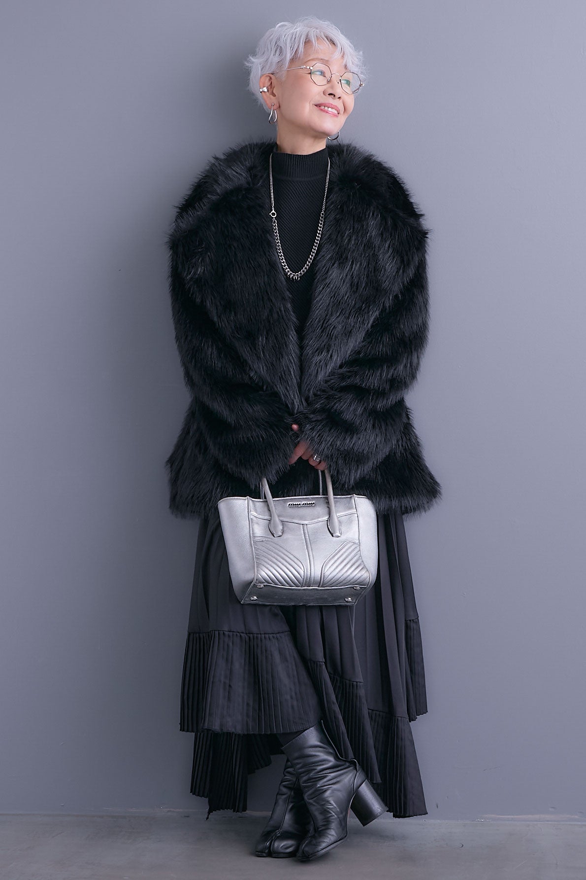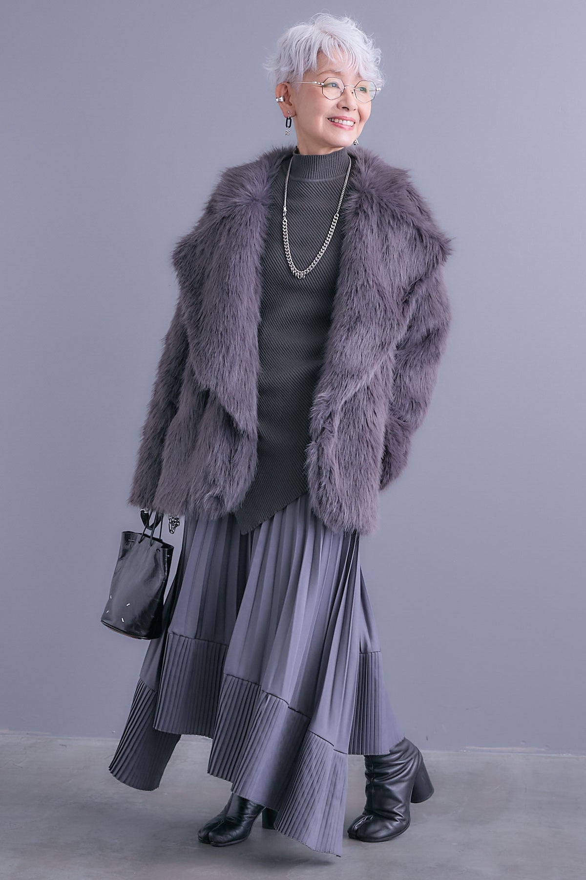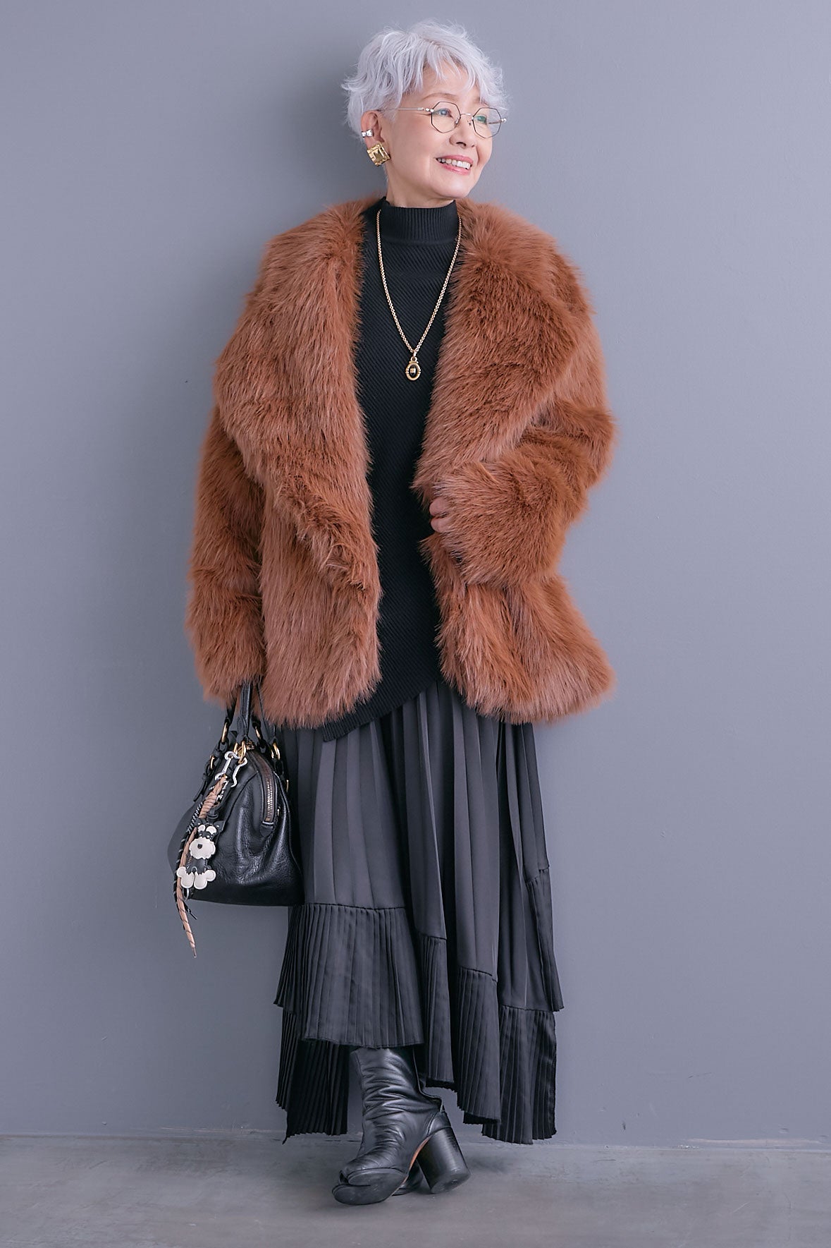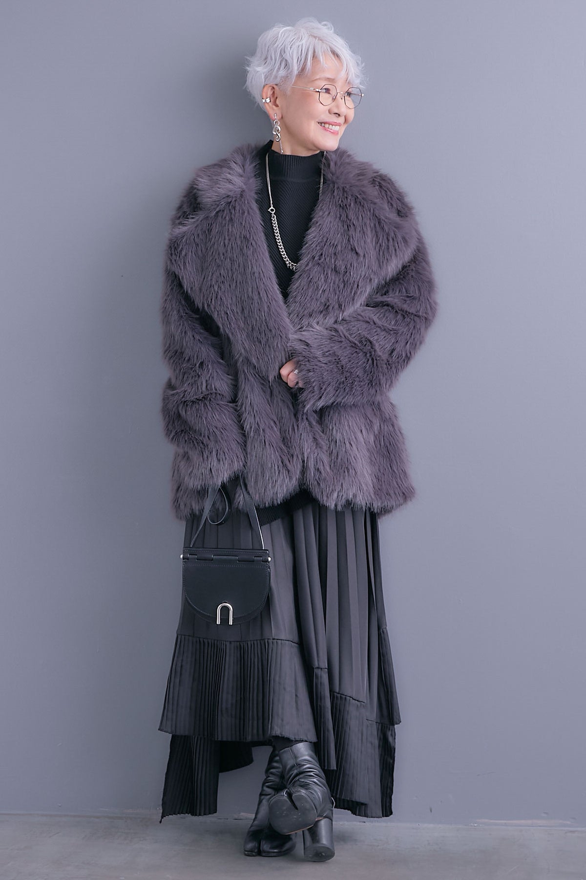 【SET】アシンメトリーオーバーニット+テーラードカラーファーコート+アシンメトリープリーツスカート(3set)
