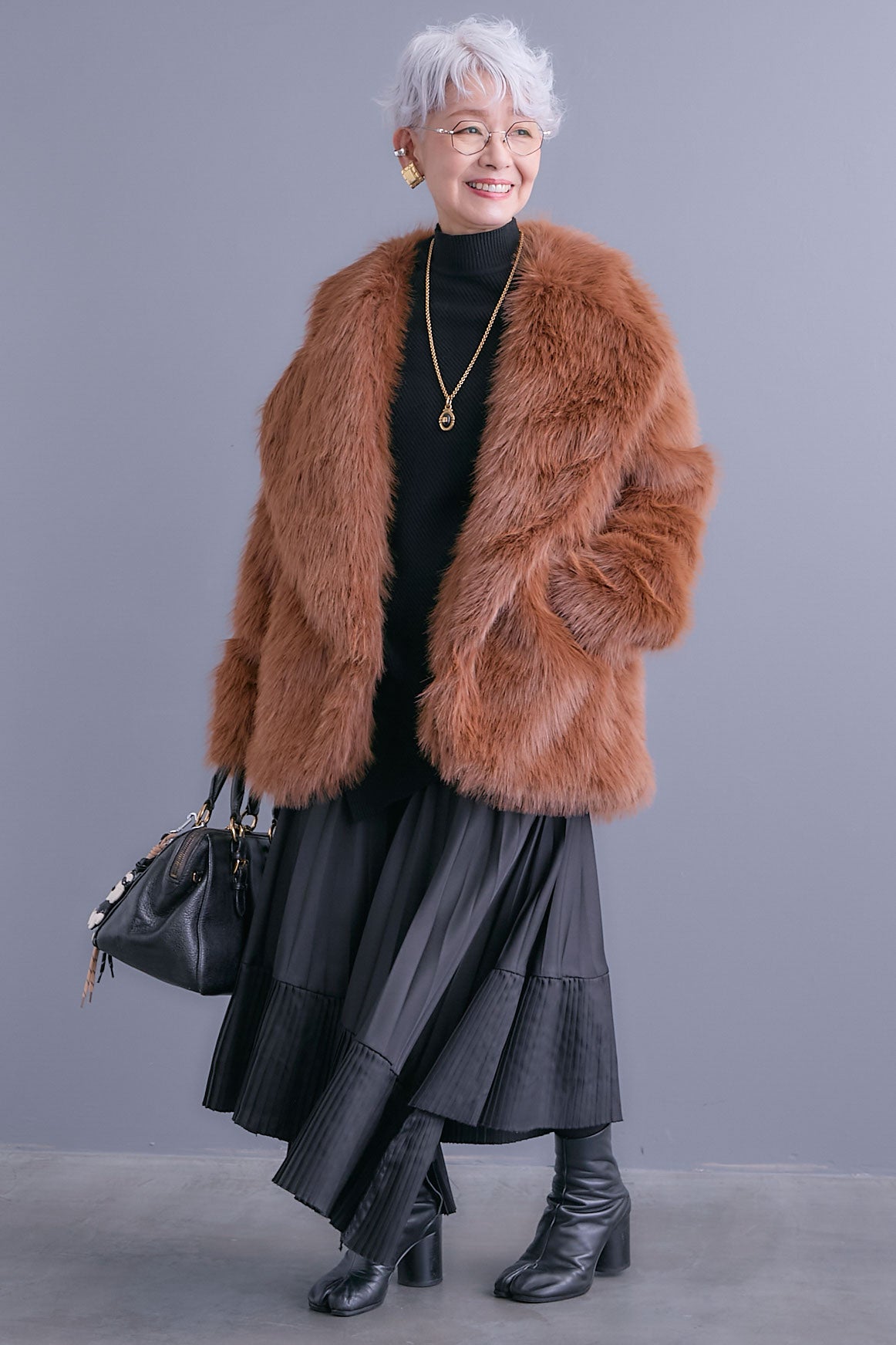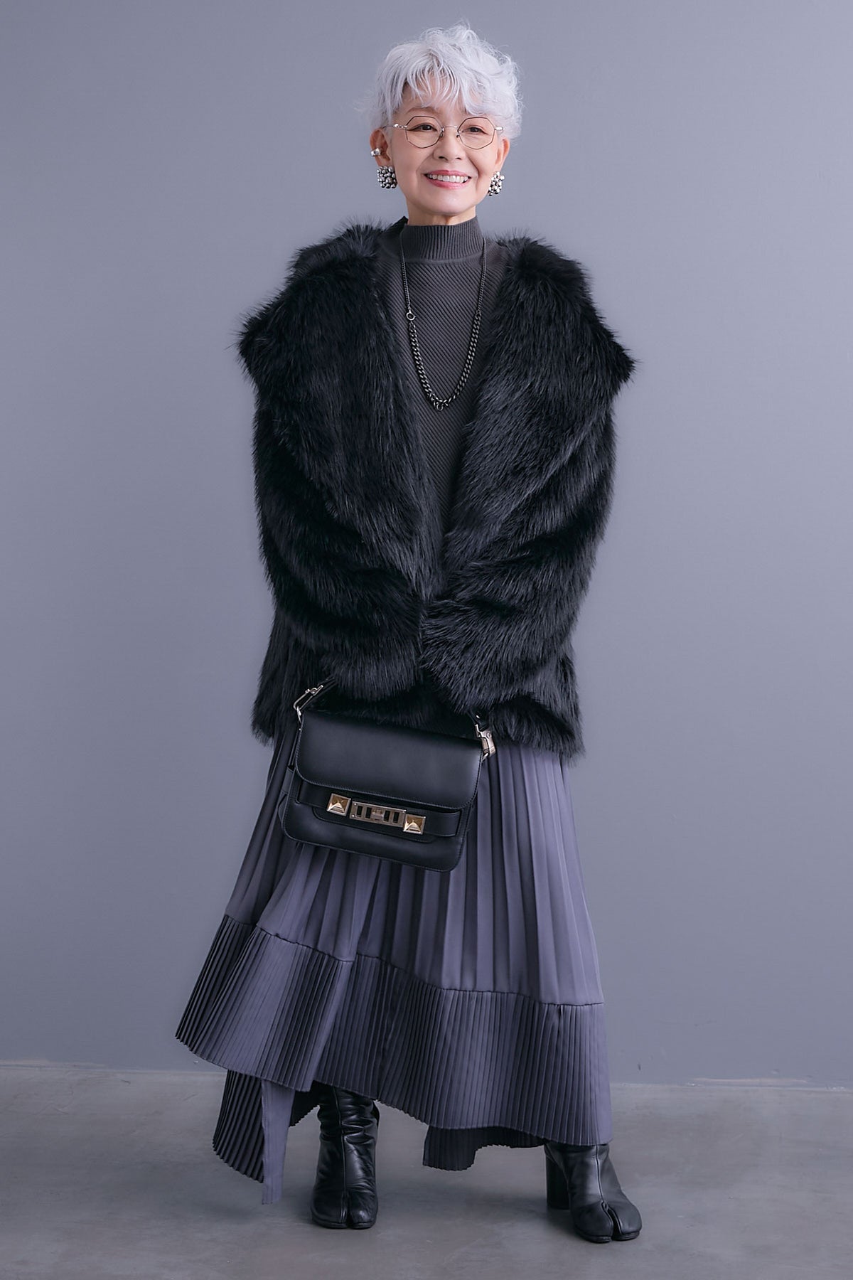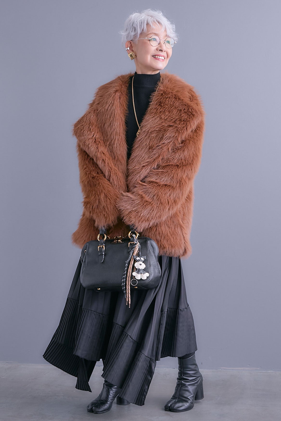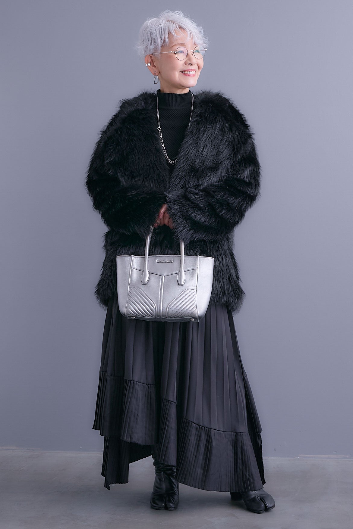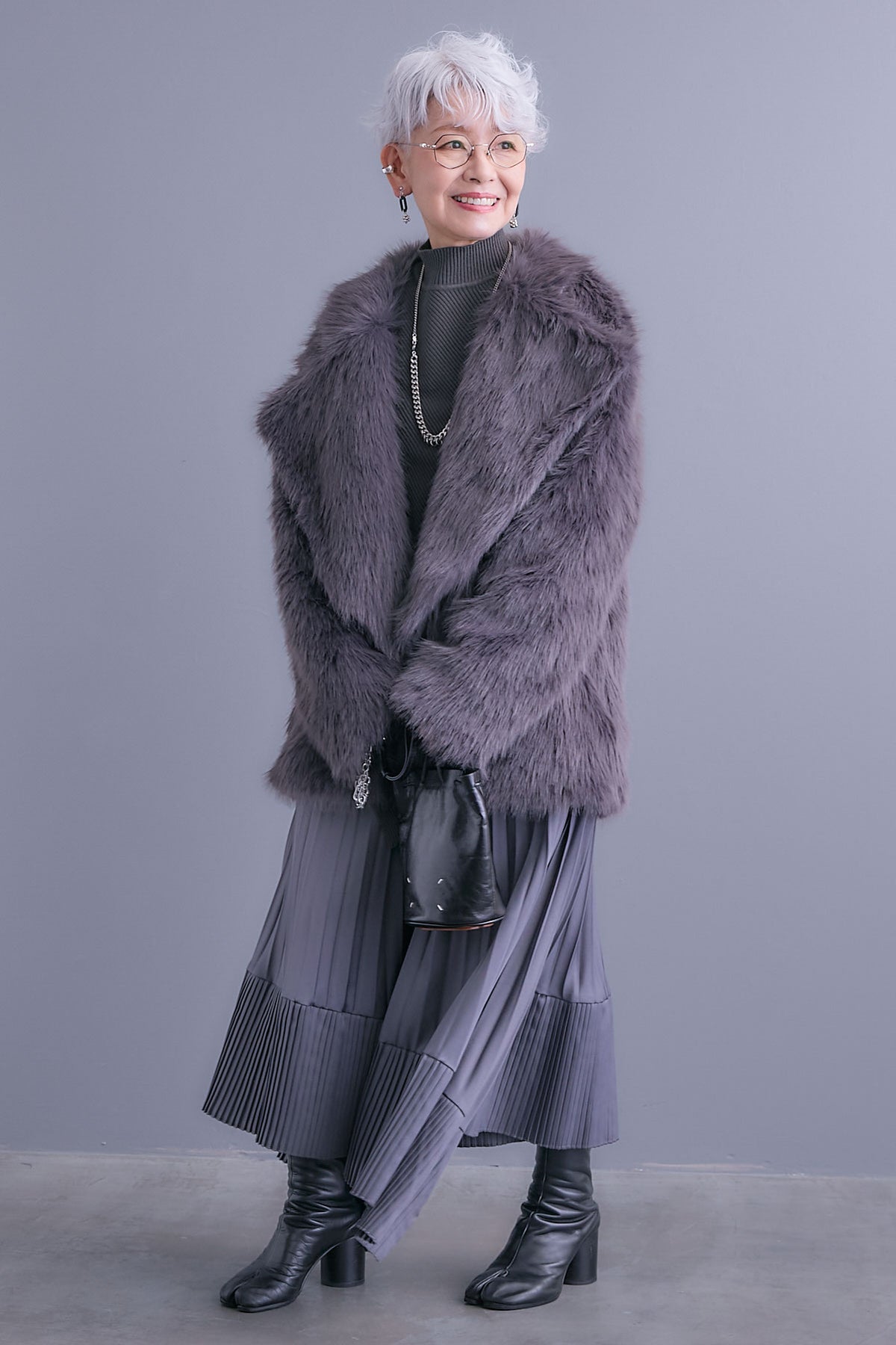 【SET】アシンメトリーオーバーニット+テーラードカラーファーコート+アシンメトリープリーツスカート(3set)