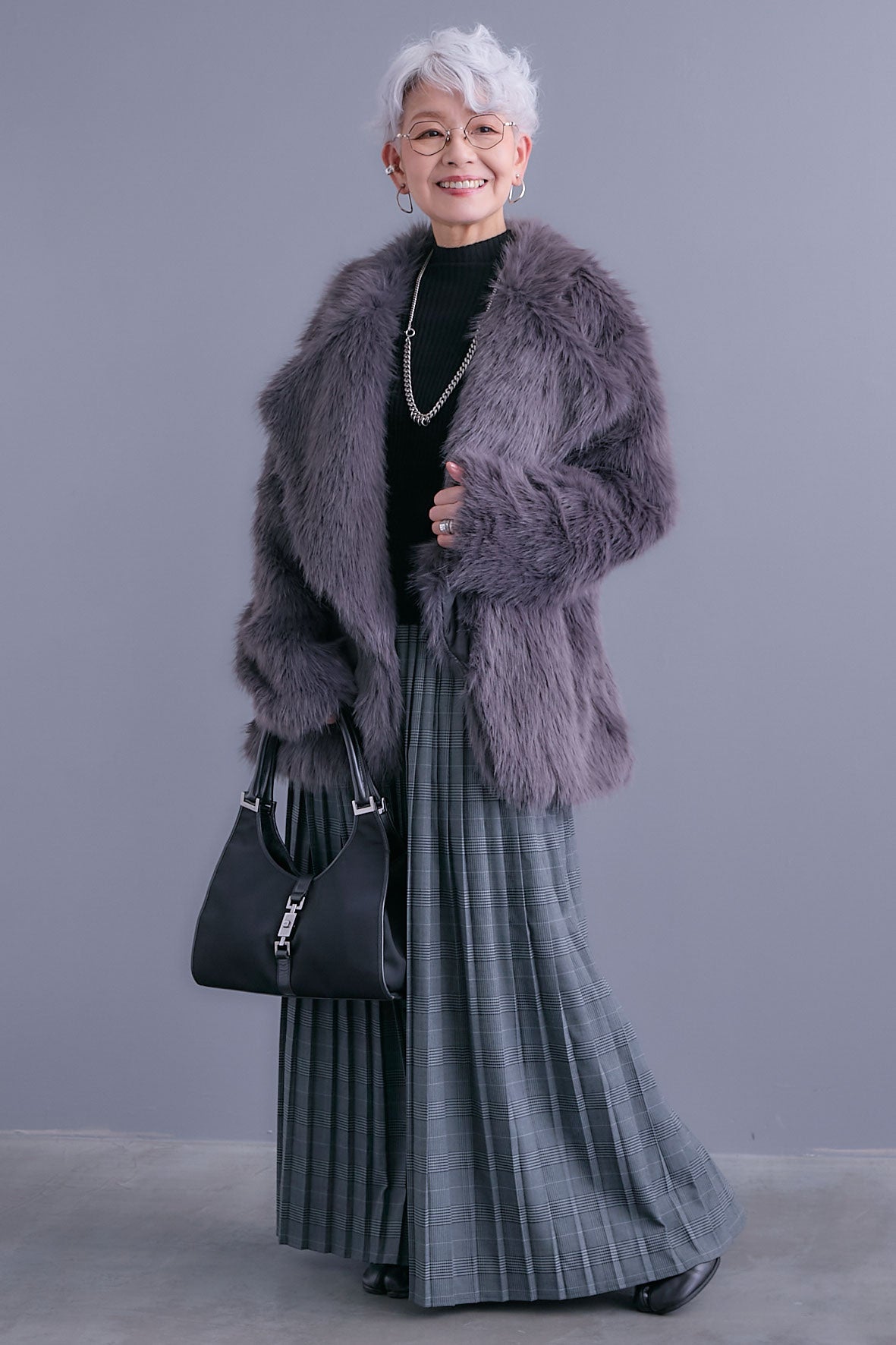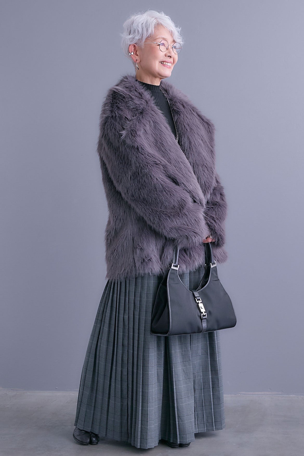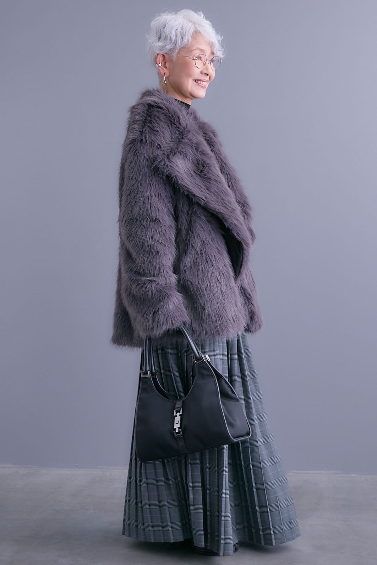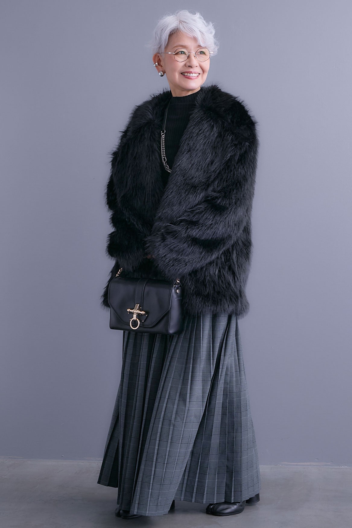 【SET】テーラードカラーファーコート+グレンチェックプリーツスカート(2set)