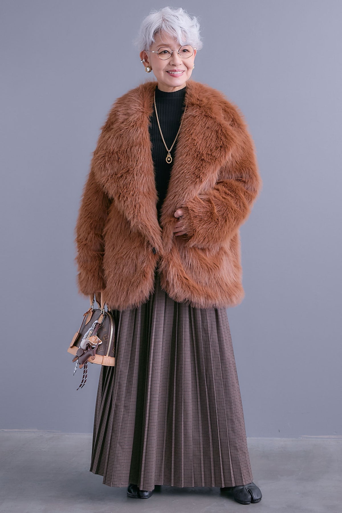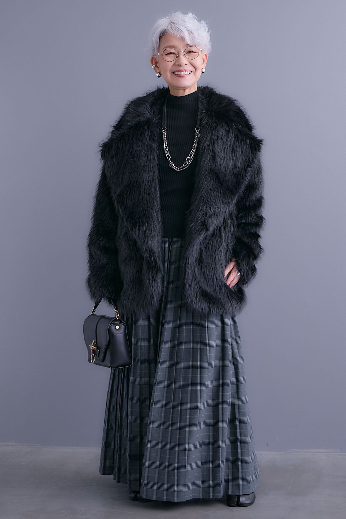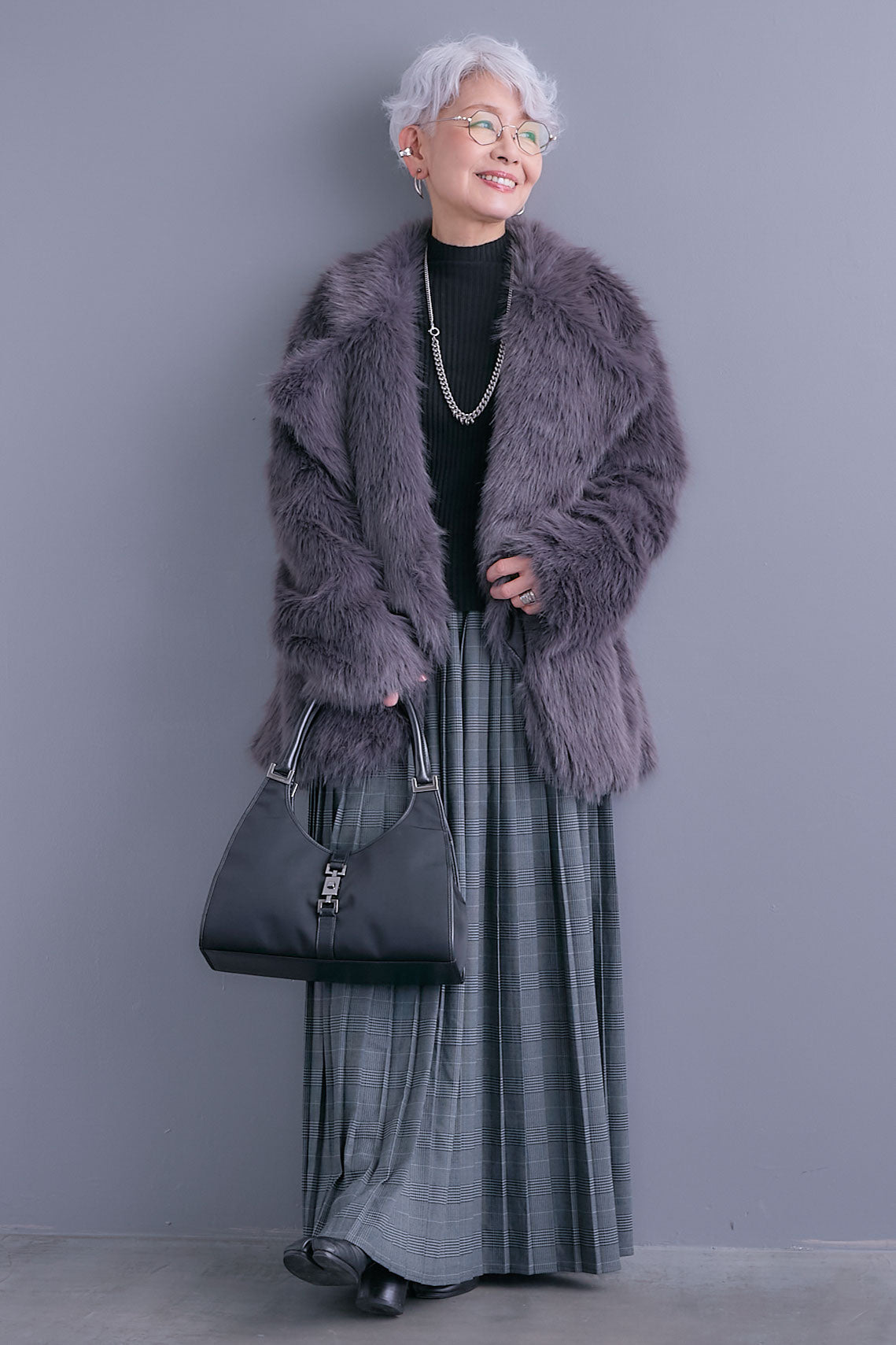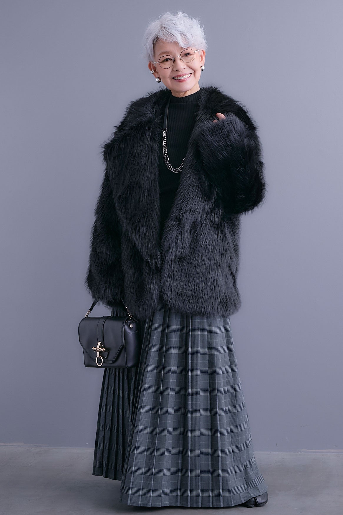 【SET】テーラードカラーファーコート+グレンチェックプリーツスカート(2set)