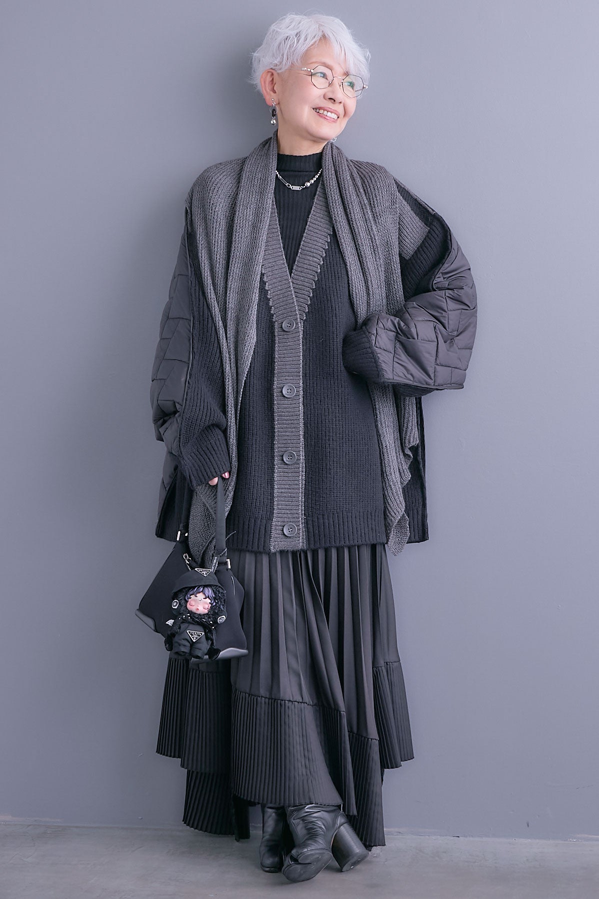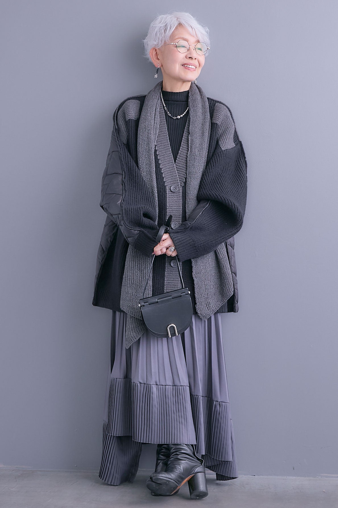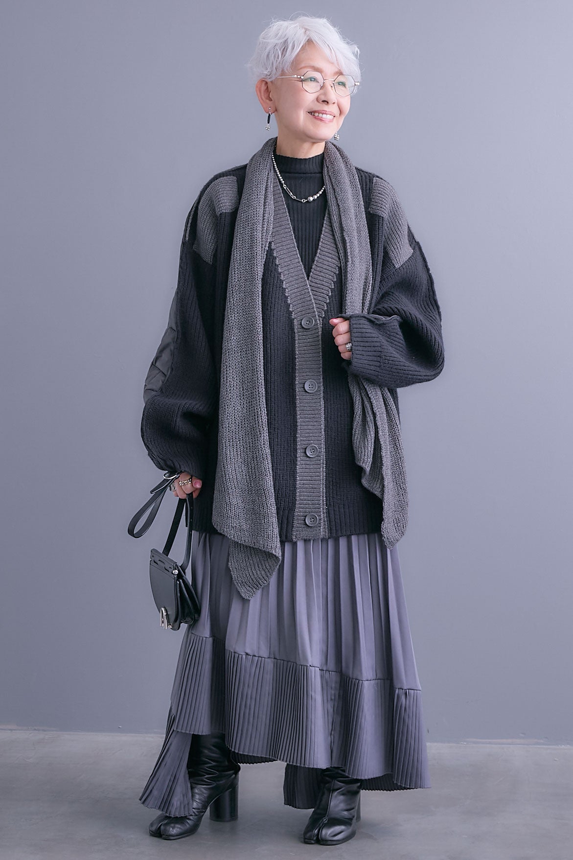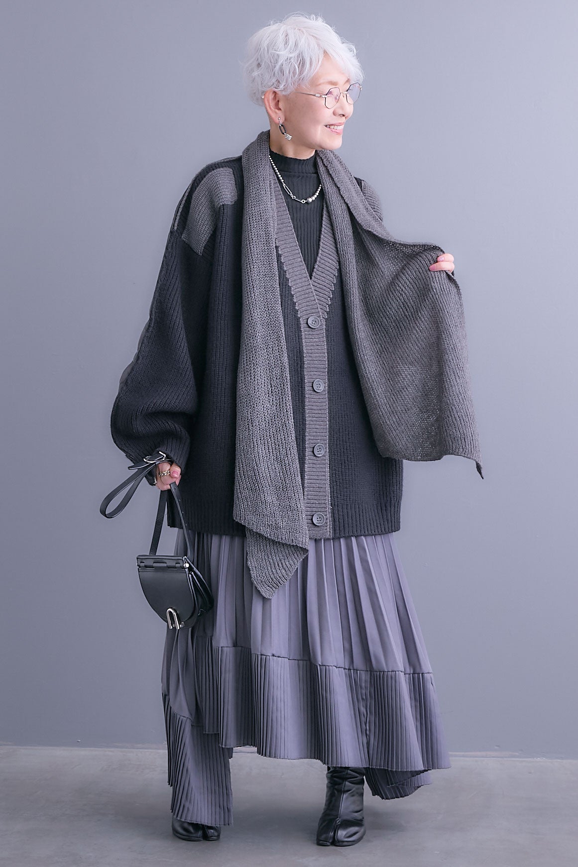 【SET】バックキルティングローゲージニットカーディガン【ストール付き】+アシンメトリープリーツスカート(2set)