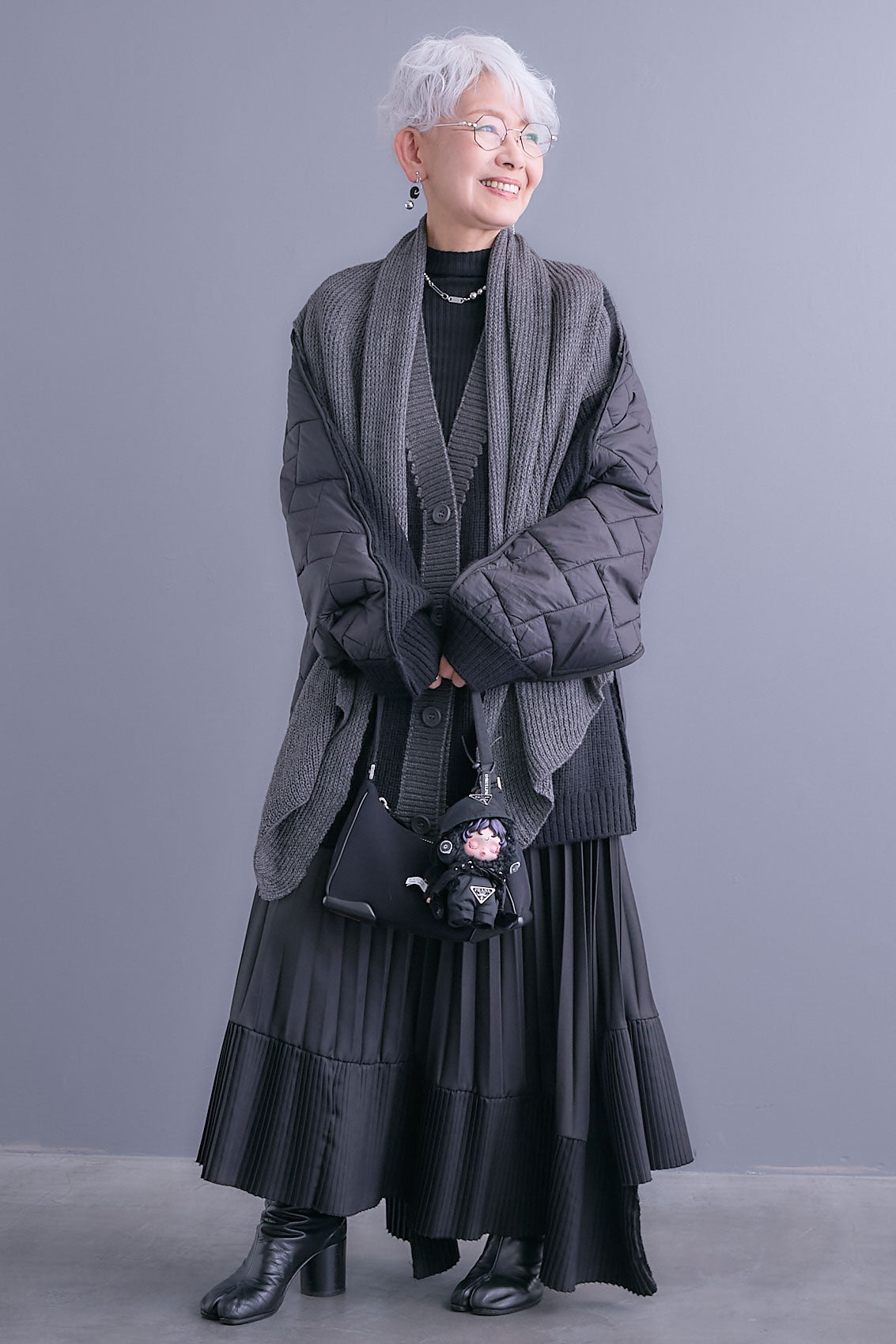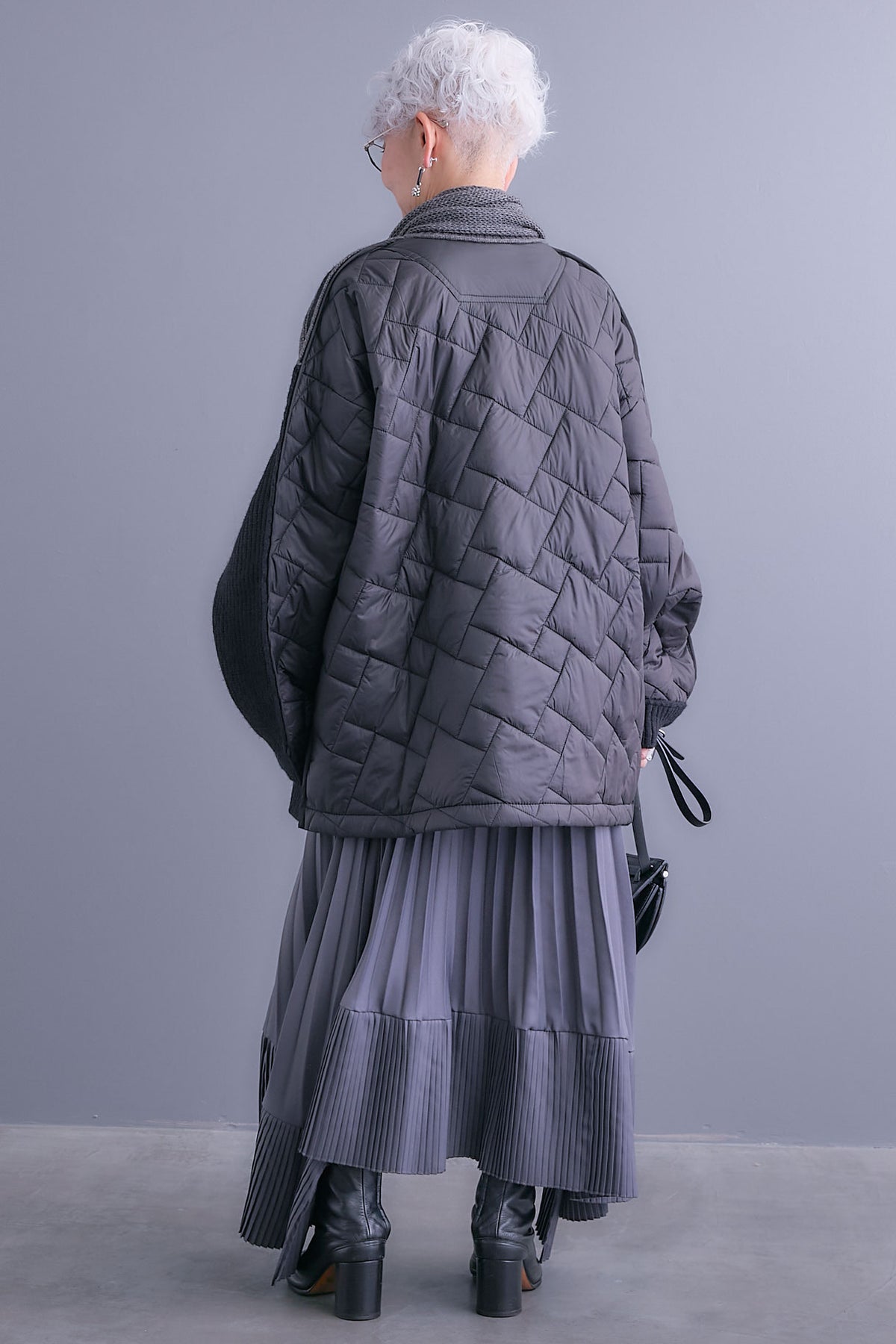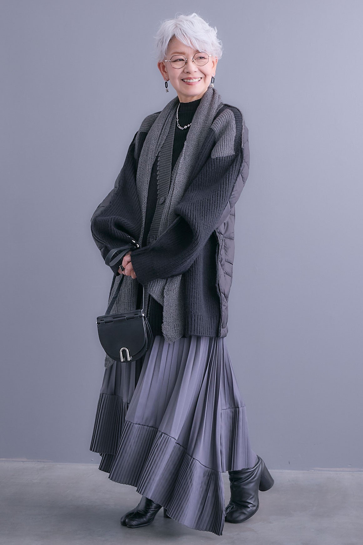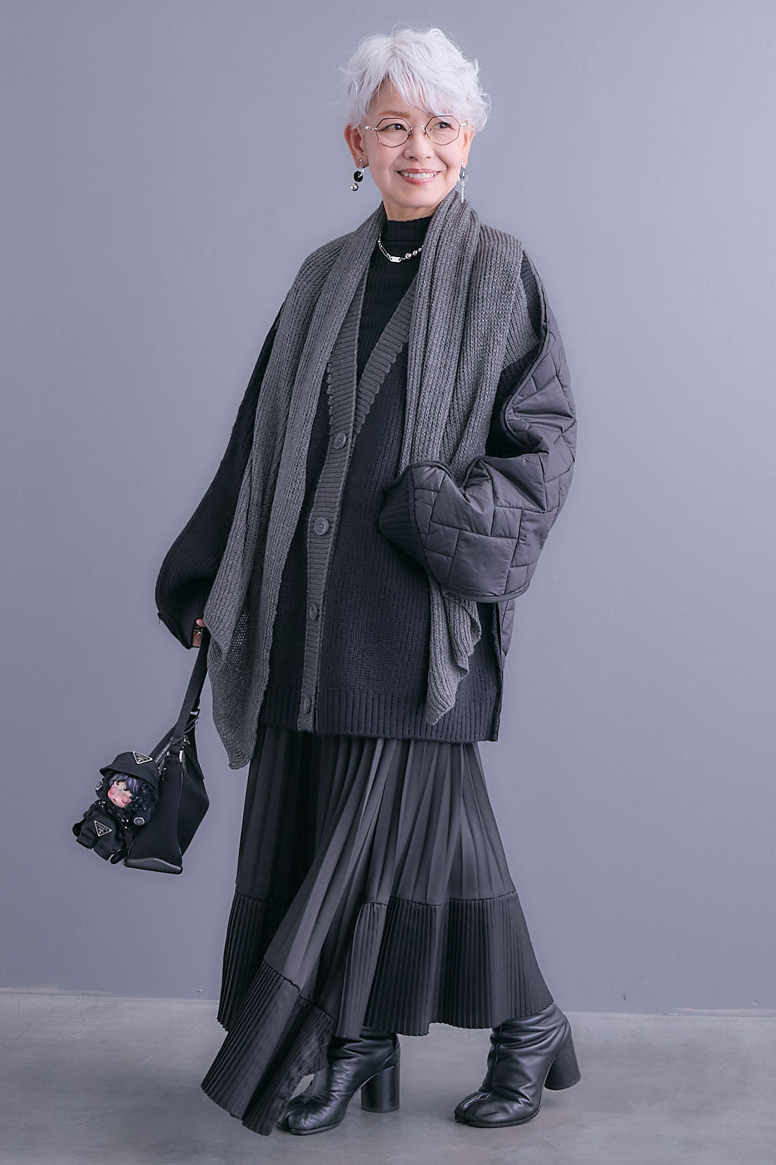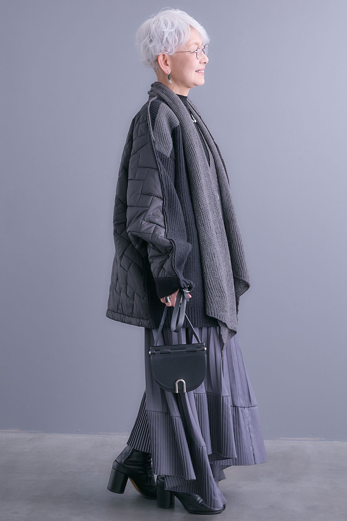 【SET】バックキルティングローゲージニットカーディガン【ストール付き】+アシンメトリープリーツスカート(2set)