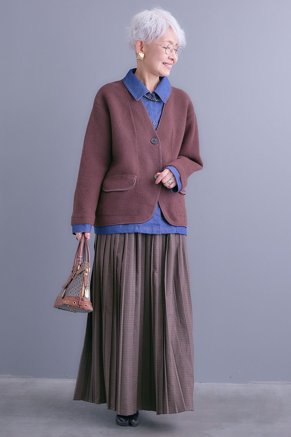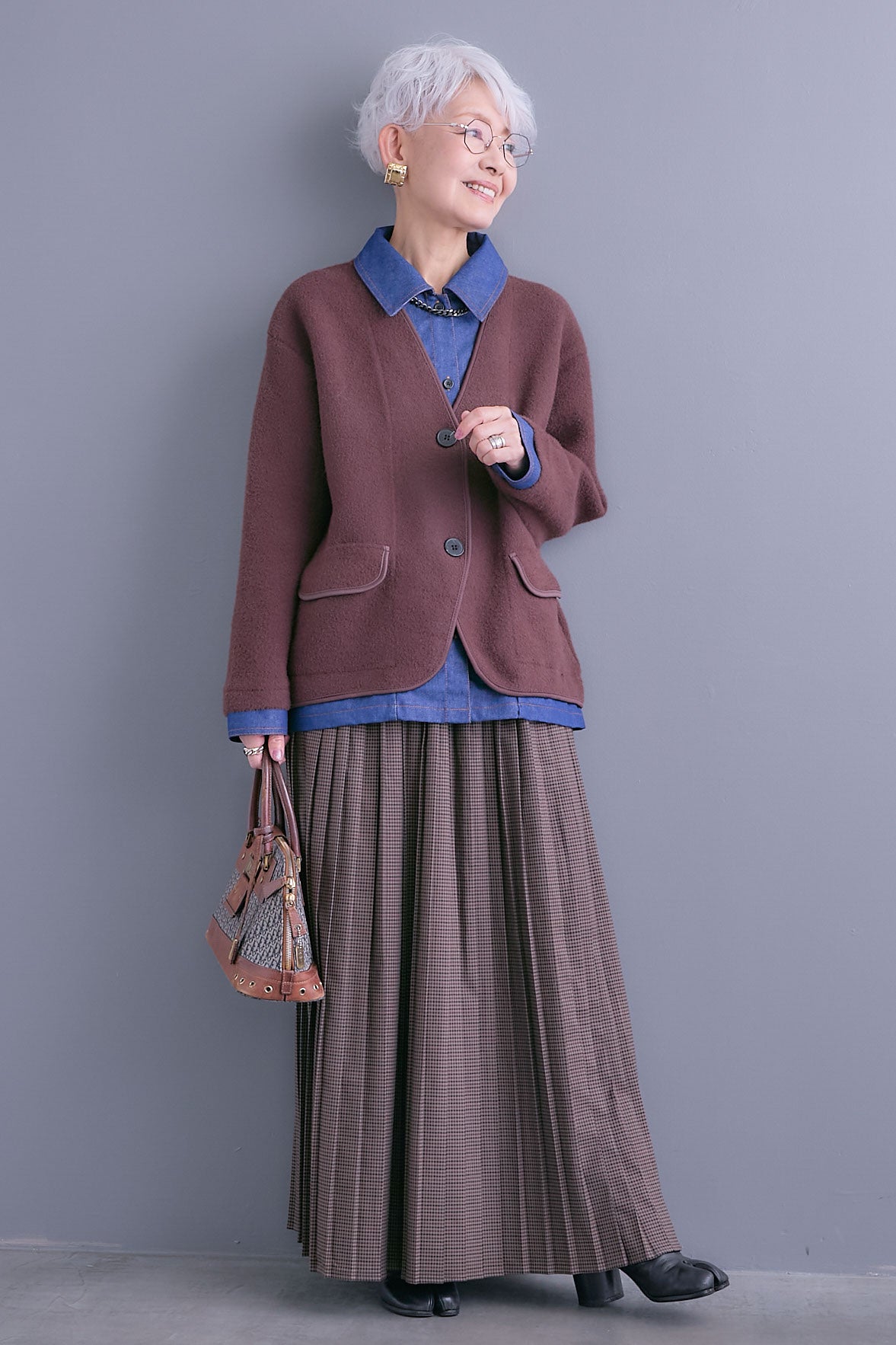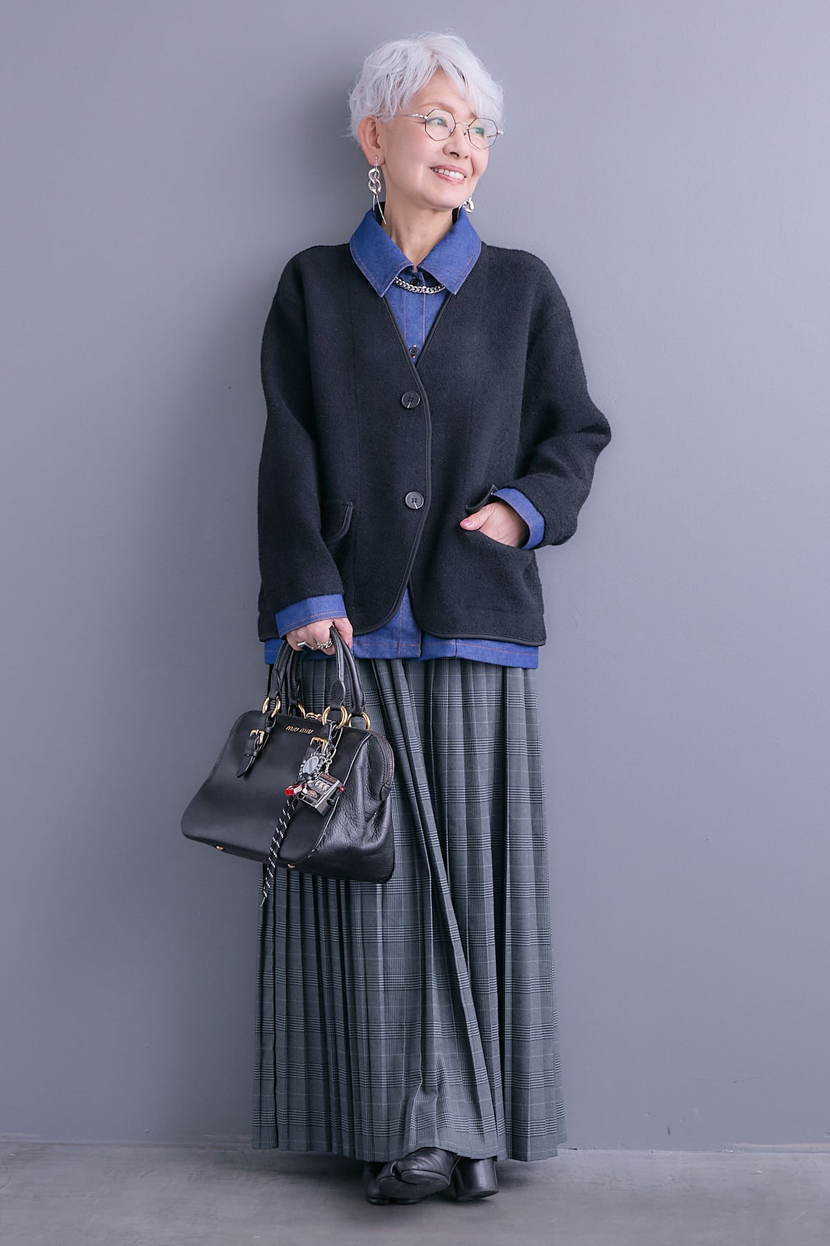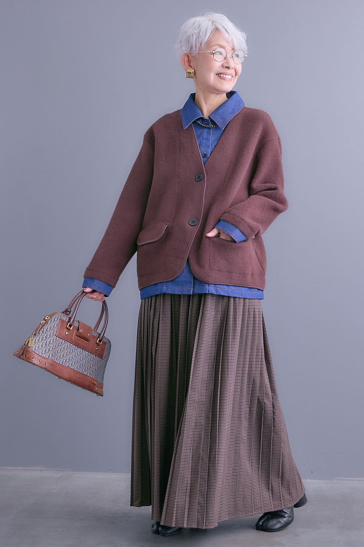 【SET】デニムレイヤードデザインカーディガン+グレンチェックプリーツスカート(2set)