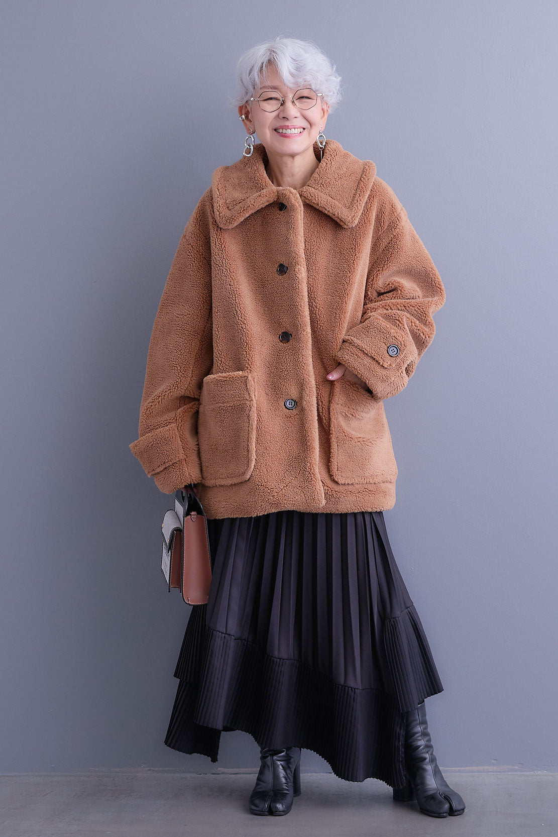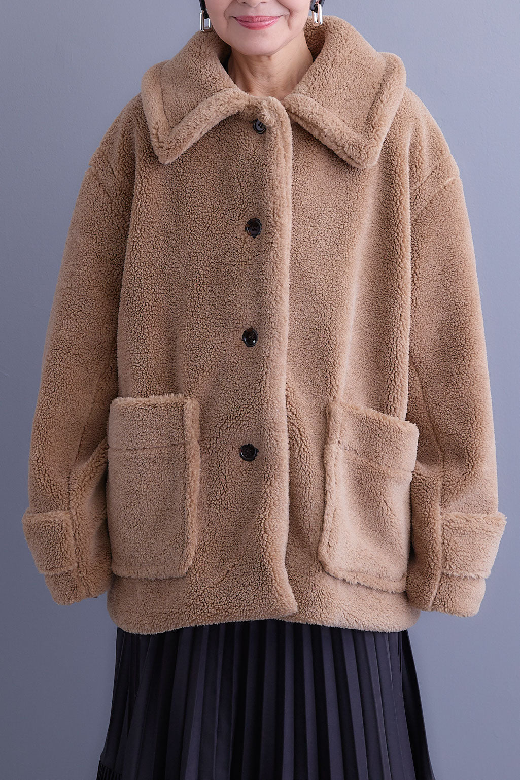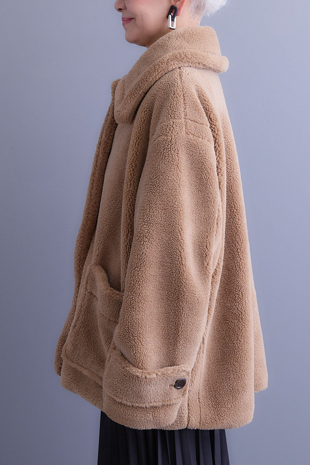 ふんわり柔らかな風合いが魅力のテディボアコート。大きめのフラットカラーが小顔効果を引き立て、シンプルながらも存在感のあるデザインに。ゆとりのあるシルエットで重ね着しやすく、保温性にも優れた一枚です。カジュアルにも上品にも合わせやすく、秋冬のスタイリングを格上げしてくれます。