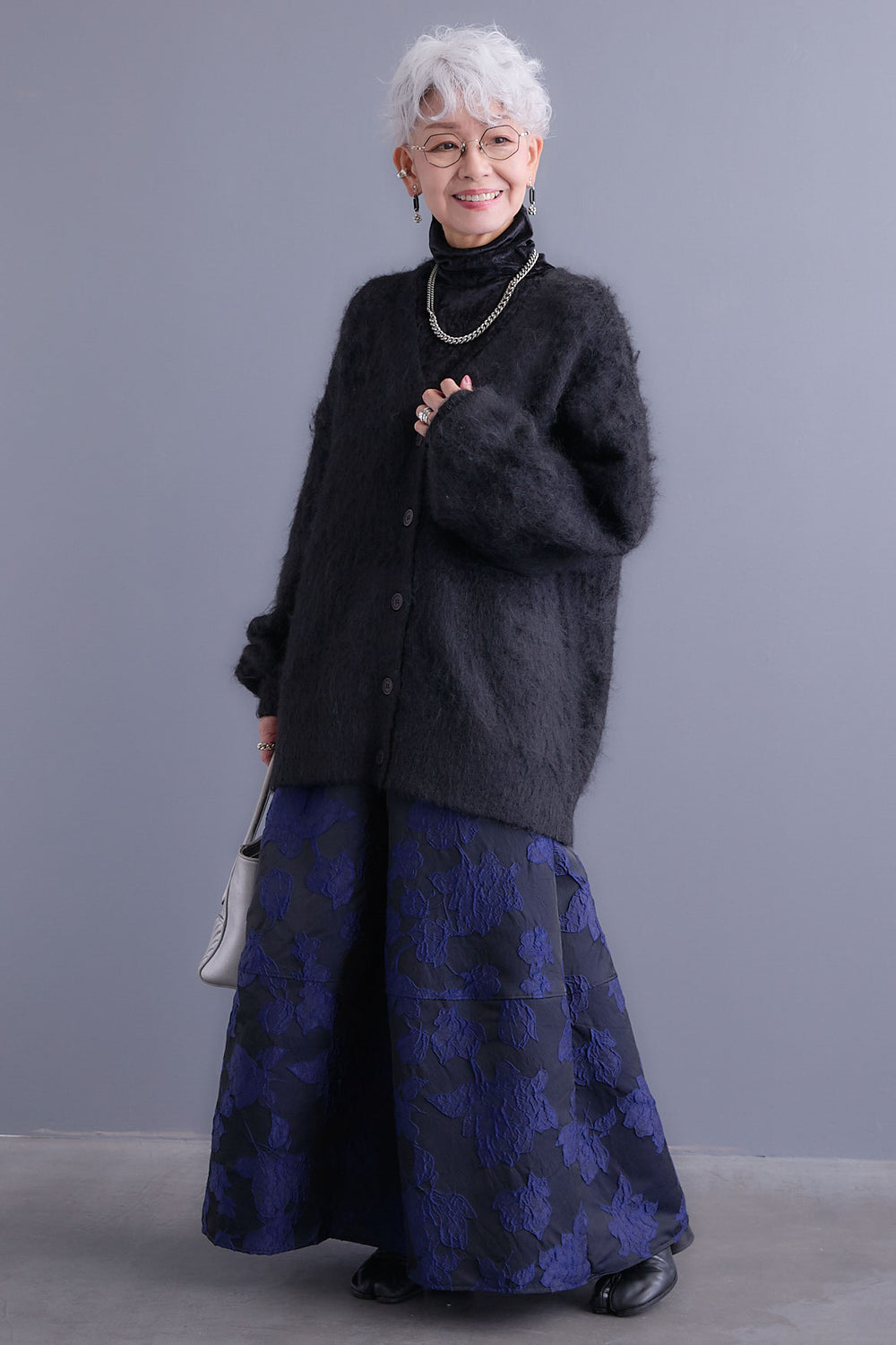 【SET】クラッシュベロアハイネックシアートップス+シャギーVネックニットカーディガン+ジャガードフラワースカート(3set)